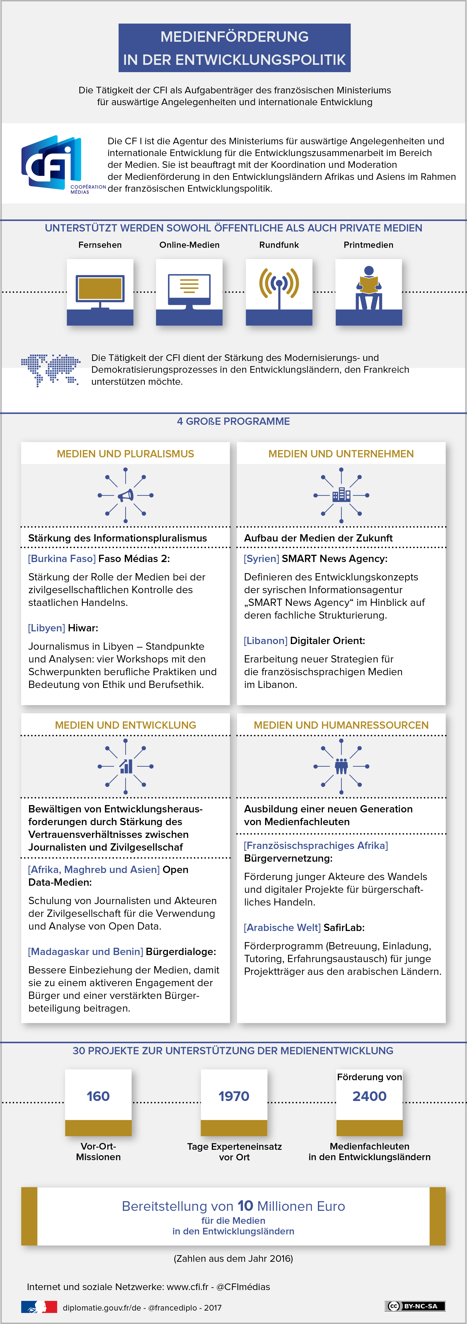 Kulturdiplomatie Das französische Ministerium für auswärtige Angelegenheiten und internationale Entwicklung verfügt über ein umfangreiches Netzwerk kultureller Einrichtungen im Ausland. Kulturdiplomatie Veröffentlicht am : 16 October 2015 Aktualisiert am : 21 April 2026 Dans cette rubrique Das Ministerium in Aktion Einsatz für Frieden und Achtung der Menschenrechte Einsatz innerhalb der Vereinten Nationen Einsatz für Sicherheit, Abrüstung und Nichtverbreitung Humanitäre Soforthilfe Förderung der Menschenrechte Gleichstellung von Frauen und Männern: für Frankreich eine Priorität Einsatz innerhalb der internationalen Justiz Digitale Diplomatie Förderung eines souveränen Europas La communauté politique européenne Die wichtigen internen Politikbereiche der Europäischen Union Das Europa der Verteidigung Frankreich und die Europäische Union Europäische Dossiers Förderung von französischen Unternehmen und Frankreichs Attraktivität Attraktivität für internationale Studierende Die Attraktivität Frankreichs fördern Die Handelspolitik der französischen Regierung Förderung Frankreichs im Bereich Sport Stärkung von Frankreichs Spitzenposition als beliebtestes Reiseziel Unterstützung für Forschende und internationale wissenschaftliche Kooperationen Sicherstellung der französischen Kulturpräsenz Ausbau der Präsenz französischer audiovisueller Medien weltweit Kulturdiplomatie Unterstützung für die Kultur- und Kreativwirtschaft Verteidigung der Frankophonie und der französischen Sprache Zusammenarbeit zwischen Deutschland und Frankreich Ein neues „Festival der Frankophonie“ anlässlich des 19. Frankophonie-Gipfels, der diesmal in Frankreich ausgerichtet wird Beitrag zu einer nachhaltigen und ausgewogenen Globalisierung Antwort auf die Klima- und Umweltkrise Kampf gegen globale Ungleichheiten Zusammenarbeit mit Nichtregierungsorganisationen und Zivilgesellschaft Globale Herausforderungen Kooperationsmaßnahmen Regionalstrategien Alle diese Einrichtungen pflegen enge Beziehungen zu lokalen Partnern und folgen klaren Zielvorgaben: Bekanntmachung der französischen Kultur und der Werke französischer Künstler: Das kulturelle Netzwerk Frankreichs im Ausland organisiert jährlich über 26.000 Kulturveranstaltungen. Entwicklung dauerhafter Netzwerke zwischen Kulturschaffenden wie auch Verantwortlichen der Kulturpolitik, um auf Anfragen und Erwartungen ausländischer Künstler und Fachkreise einzugehen. Die Kunstpolitik Frankreichs auf internationaler Ebene orientiert sich an drei Prioritäten: Verbreitung der zeitgenössischen Kreation in allen ihren Formen Im Ausland mit Veranstaltungen wie Baltic Sounds French für zeitgenössische Musik, France Danse für zeitgenössisches Ballett oder Paris Calling in London für zeitgenössische Kunst. Darüber hinaus gibt es auch Austausche zwischen Galerien wie Berlin-Paris oder Festivals für mehrere Kunstgattungen wie Croisements in China. In Frankreich mit der Plattform Focus: Seit 2008 bietet Focus ausländischen Programmplanern im Rahmen eines international anerkannten Festivals die Möglichkeit, neuere Kreationen von in Frankreich lebenden Künstlern in den Bereichen Tanz, Theater, Zirkus und Straßenkunst kennenzulernen. Ausstrahlung der französischen Kultur und praktische Umsetzung der kulturellen Vielfalt Mit verschiedenen „Saisons“, „Jahren“ oder „Festivals“ wollen wir jeweils den kulturellen Reichtum eines anderen Landes in Frankreich präsentieren bzw. die Ausstrahlung unserer eigenen Kultur über die Grenzen hinaus fördern: Im Rahmen von Initiativen wie dem Frankreich-Festival in Kroatien (2015), dem Frankreich-Korea-Jahr (2015-2016) oder dem Frankreich-Kolumbien-Jahr (2016) werden überall in den Partnerstaaten zusammen mit lokalen Behörden und Partnern Hunderte von Veranstaltungen in den Bereichen Kunst, Wissenschaft, Bildung und Wirtschaft organisiert. Anderen Ländern gewidmete Saisons, Jahre und Festivals in Frankreich bieten Gelegenheit, dem breiten Publikum die Kreativität des jeweiligen Gastlands auf sämtlichen Gebieten nahezubringen. Seit dem „Indien-Jahr“ 1985 wurden auf diese Weise in Paris wie auch in den französischen Regionen rund dreißig Länder mit ihren verschiedenen Facetten vorgestellt, darunter Armenien (Arménie mon amie), Russland, Kroatien (Croatie la voici !), China im Jahr 2014 (France-Chine 50) sowie Singapur (Singapour en France, le Festival) und Korea (Année France-Corée) im Jahr 2015. Die Saisons sind ein anerkanntes Label und sind international begehrt. Viele Länder haben den Wunsch, sich an diesem Austausch zu beteiligen, und interessieren sich für das Know-how Frankreichs als Vorreiter in diesem Bereich. Seit 1985 wurden ca. 50 „Saisons“, „Jahre“ oder „Festivals“ organisiert. Stärkung der fachlichen Fähigkeiten in den verschiedenen Kunstsparten Frankreich führt darüber hinaus auch eine bereichsspezifische Entwicklungs- und Kooperationspolitik gegenüber den Staaten der „Zone de Solidarité Prioritaire“ (ZSP). Es handelt sich um das Programm „Afrique et Caraïbes en créations“, dessen Management dem Institut français übertragen wurde. Die Schwerpunkte dieses Programms sind: Förderung des Zugangs zum nationalen und internationalen Markt; Entwicklung der Kulturwirtschaft, sodass die betreffenden Länder/Gebiete vom Reichtum ihrer kulturellen Produktion profitieren können. Das Programm setzt sich aus diversen großen Themenveranstaltungen in Afrika und der Karibik zusammen, die gleichzeitig als fachliche Branchenplattformen konzipiert sind: Biennale „Danse l’Afrique Danse", „Rencontres de Bamako“, Biennale „Danses Caraïbe“, „L’Afrique est à la Mode“ usw. Nuit Blanche in Zagreb, Anamorphose eines Wals von Etien’ (im Rahmen von Rendez-vous, dem Frankreich-Festival in Kroatien). Foto : Nina Đurđević Kultureller Austausch Das Engagement Frankreichs für den kulturellen Austausch vollzieht sich in vielfältiger 