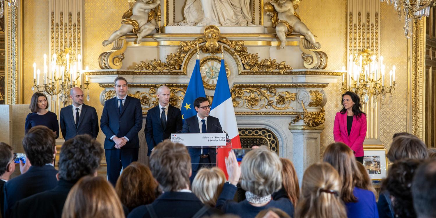 Amtsübergabe im Ministerium für Europa und auswärtige Angelegenheiten Aktuelles aus dem Ministerium Meldungen Veröffentlicht am : 05 March 2026 Der Minister Stéphane Séjourné hat am 4. Februar 2024 die feierliche Amtsübergabe geleitet. Franck Riester wurde zum beigeordneter Minister für Außenhandel, Standortförderung, Frankophonie und französische Staatsangehörige im Ausland ernannt Jean-Noël Barrot wurde zum beigeordneten Minister für Europa ernannt Chrysoula Zacharopoulou wurde zum Staatssekretärin für Entwicklung und internationale Partnerschaften ernannt