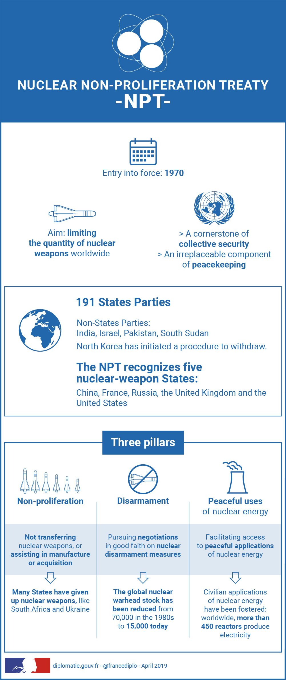 Treaty on the Non-Proliferation of Nuclear Weapons The Treaty on the Non-Proliferation of Nuclear Weapons (NPT) is the cornerstone of the international security architecture and aims to effectively advance nuclear disarmament, to curb proliferation crises and to promote the peaceful use of nuclear energy and applications. Disarmament and non-proliferation Published on : April 01st 2025 Updated on : April 07th 2026 Dans cette rubrique The ministry in action Action for peace and respect for human rights Action within the UN Security, Disarmament and Non-proliferation Emergency Humanitarian Action Protecting Human Rights Gender equality: a priority for France Commitment to international justice Digital Diplomacy Promoting a sovereign Europe The European Political Community Defence Europe France and the European Union European matters Promoting French businesses and France’s attractiveness Attracting foreign investment Attracting international students Destination France: The recovery and transformation plan for tourism Promoting French expertise in sport Supporting French exporters Supporting researchers and scientific cooperation globally The French Government’s Trade Policy Ensuring the presence of French culture Cultural Diplomacy Defending Francophonie and the French language Franco-German cooperation Supporting the cultural and creative industries Contributing to sustainable, balanced globalization Addressing the climate and environmental emergency Combating global social inequality External action of local government bodies Summits and global issues Regional strategies The NPT is the basis for many United Nations Security Council resolutions. Through Resolution 1887? adopted by the Security Council on 24 September 2009, the international community reaffirmed its commitment to “seek a safer world for all and to create the conditions for a world without nuclear weapons, in accordance with the goals of the NPT, in a way that promotes international stability, and based on the principle of undiminished security for all”. An essential instrument for our collective security More than 50 years after its entry into force, the NPT remains one of the foundations of our collective security system and an irreplaceable mechanism maintaining international peace and security. France promotes the preservation and universality of the NPT. The NPT was opened for signature on 1 July 1968 and entered into force on 5 March 1970. The United States, the United Kingdom and Russia are depository States. France announced its accession to the NPT in the framework of a Comprehensive Arms Control and Disarmament Plan submitted by the President of the Republic before the United Nations on 3 June 1991. It acceded to the Treaty on 2 August 1992, but had already been complying with the provisions since 1968. “France for its part (…) will behave in the future in this field exactly as the States complying with the Treaty. There should be no doubt in anyone’s mind on that score.” Statement by the Permanent Representative of France to the United Nations on 12 June 1968 Today the NPT is close to becoming a universal treaty since only four States are not parties to it: India, Israel, Pakistan and South Sudan. In January 2003, North Korea announced its withdrawal from the Treaty. This withdrawal is not recognized by France. The Treaty makes a distinction between five Nuclear-Weapon States which tested nuclear weapons prior to 1967 (France, United States, Russia, United Kingdom, China) and Non-Nuclear-Weapon States (all other States). TNP is founded on three pillars: nuclear disarmament commitments: all States undertake to pursue negotiations in good faith on measures relating to nuclear disarmament, and on a treaty on general and complete disarmament under strict and effective international control (Article VI). nuclear non-proliferation commitments: Nuclear-Weapon States undertake not to transfer nuclear weapons to any recipient whatsoever; Non-Nuclear-Weapon States undertake not to acquire nuclear weapons and to place all their nuclear facilities under International Atomic Energy Agency (IAEA) safeguards (Articles I, II et III); Cooperation commitments on peaceful uses of nuclear energy and nuclear applications (Article IV and V). The NPT, initially concluded for a period of 25 years, was extended indefinitely in 1995. A review process described in Article VIII of the Treaty provides for the holding of conferences every five years. These Review Conferences are prepared during three annual Preparatory Committees, held over the three years prior to the conference. France expressed its firm commitment to the indefinite and unconditional extension of the Treaty at the 1995 NPT Review and Extension Conference. France’s action As a Permanent Member of the United Nations Security Council and an NPT Nuclear-Weapon State, France bears special responsibilities with a view to preserving and strengthening international peace and security. In this regard, France relies on the United Nations Charter and recognizes the right to both individual and collective self-defence, which is enshrined in the former. In the exercise of that right, France promotes those options most conducive to the strengthening of international security and stability. French Presidency of the United Nations Security Council France acts within a multilateral framework and is guided by steadfast principles: working for a safer world, developing friendly relations between States, preventing threats to peace, respecting the right to self-defence, refusing the arms race and moving towards general and complete disarmament based on the principle of undiminished security for all. France is resolutely committed to effective nuclear disarmament, and effective nuclear disarmament process, whose next logical stages are: the entry into force of the Comprehensive Nuclear Test Ban Treaty (CTBT) and the adoption of a Fissile Material Cut-Off Treaty (FMCT); France