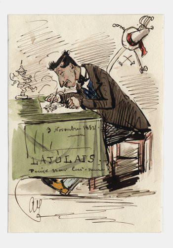 Dessins et caricatures Le dessin est utilisé pour témoigner de certains événements joyeux, solennels ou dramatiques. Il permet aussi de laisser à la postérité le portrait de diplomates, sans s’interdire un ton humoristique. Archives diplomatiques Publié le : 23 octobre 2025 Mis à jour le : 12 février 2026 Dans cette rubrique Archives & bibliothèque Venir aux Archives Confier ses archives ou travaux Consulter les archives Organiser un tournage aux Archives Organiser une visite des Archives Reproduire et réutiliser des archives Effectuer des recherches généalogiques ou familiales Accès des généalogistes professionnels Actes d’état civil et autres archives diplomatiques et consulaires L’état civil des Français à l’étranger Recherche de personnes disparues en Algérie pendant les derniers mois de la souveraineté française S’orienter dans les fonds et collections Ambassades, consulats, réseau culturel et de coopération (XVIe-XXe siècles) Colonies et territoires d’Outre-mer (1793-1960) Protectorats et mandat français (1881-1956) Récupération artistique Ressources pédagogiques Agenda et offre culturelle des Archives Concours des jeunes ambassadeurs et ambassadrices L’offre éducative du centre de La Courneuve L’offre éducative du centre de Nantes Sommaire Un caricaturiste espiègle et insolent au Quai d’Orsay Un agent à travers le monde : Maurice Le Roux de Villers (1839- ?) Un Album comique pour les Affaires étrangères Abel Servien : un négociateur opiniâtre et pragmatique à Münster (1644-1648) « Longue vie au Japon » : art et propagande Un caricaturiste espiègle et insolent au Quai d’Orsay Auguste Louvrier de Lajolais (1829-1908) est directeur des écoles nationales des arts décoratifs de Paris (à compter du 11 août 1877), de Limoges et d’Aubusson les trente dernières années de sa vie. [Album de caricatures dédié à Léon Noël] / Auguste Louvrier de Lajolais (dessins) ; Victor Perrin, duc de Bellune (quatrains). Paris : s.n., 1852-[1860]. Bibliothèque, Rés. C 6. Archives diplomatiques. Il débute comme peintre et se forme dans l’atelier de Charles Gleyre. Il expose des paysages à plusieurs reprises aux Salons de peinture et de sculpture, à compter de 1859. Dans les années 1850, il exerce également ses talents au Quai d’Orsay. Il sera successivement attaché à la légation de France à Naples, à compter du 27 août 1851, puis au secrétariat général le 6 août 1852 et enfin à la direction des Affaires politiques le 27 janvier 1853). On ignore la date à laquelle il cesse ses activités au ministère des Affaires étrangères. . Quand il commence cet album de caricatures, il est attaché au secrétariat général. Il le dédie à Léon Noël, rédacteur à la direction des Affaires politiques en 1852, auquel il le reprend plus tard pour le compléter. Il le donne vers 1860 à Edouard Bouillat, alors consul à Glasgow. Témoin du travail et des négociations diplomatiques au début du second Empire, il a pu croiser le chemin du représentant de la couronne britannique. Henry Richard Charles Wellesley (1804-1884), 1er comte Cowley Arthur Wellesley, 1er duc de Wellington Henry Wellesley, 1er comte Cowley Lord Malmesbury (ministre britannique des Affaires étrangères) a dit de lui : « Je n’ai jamais connu un homme aussi naturellement doué pour sa profession… Il était lui-même franc et droit, mais il découvrait facilement l’artifice chez les gens qui cherchaient à le tromper… ». Ses contemporains le décrivent aussi comme étant susceptible, ombrageux et peu souriant ! Lord Cowley est le fils aîné de Henry Wellesley, 1er baron Cowley (1773-1847) et le neveu d’Arthur Wellesley, 1er duc de Wellington (1769-1852), ambassadeurs d’Angleterre à Paris (le second ayant vaincu Napoléon 1er à Waterloo).Il entre dans la carrière diplomatique en 1824. Il est tour à tour affecté à Vienne, Stuttgart, Constantinople, Berne puis Francfort. En 1852, il remplace lord Normanby comme ambassadeur à Paris. Il y reste quinze années pendant lesquelles l’entente franco-britannique connaît bien des vicissitudes. Dès son arrivée, Cowley gagne la confiance et l’estime du prince-président, devenu empereur le 2 décembre 1852. Napoléon III le voit fréquemment et règle avec lui des questions qui relèvent en fait de ses ministres des Affaires étrangères, leur rendant cette situation intolérable. Avec lord Clarendon (ministre des Affaires étrangères), il représente l’Angleterre au Congrès de Paris. Cowley perd ensuite de son influence sur Napoléon III et les heurts s’atténuent entre lui et le maître du Quai d’Orsay. Lorsqu’il se retire en 1867, il a encore été confronté à des événements majeurs ayant marqué les relations franco-britanniques : tentative d’assassinat de l’Empereur par Orsini, unité italienne, conclusion d’un traité de libre-échange, construction du canal de Suez ou aventure mexicaine. Un agent à travers le monde : Maurice Le Roux de Villers (1839- ?) Album comique des Affaires étrangères. s.l. : s.n., 1869. Bibliothèque, Rés. D 22 bis (folio 40). Archives diplomatiques. Maurice Charles Frédéric Le Roux de Villers est né le 27 septembre 1839. Bachelier ès lettres et ès sciences, maîtrisant l’anglais et l’allemand, il est également licencié en droit. Le 11 janvier 1860, son oncle Alfred Le Roux (banquier, député de Vendée, futur vice-président du Corps législatif, ministre de l’Agriculture et du Commerce) écrit au ministre des Affaires étrangères pour proposer la candidature de son neveu à un poste d’attaché non payé. Il est alors affecté successivement à la direction des Archives, le 21 janvier 1860, puis à la direction politique, le 1er septembre 1862. Pendant ses congés, il entreprend différents voyages qui le mènent en Angleterre, en Allemagne, en Italie, au Danemark, en Suède, en Norvège, en Corse et deux fois en 