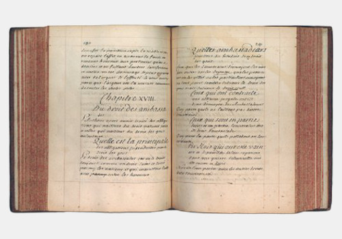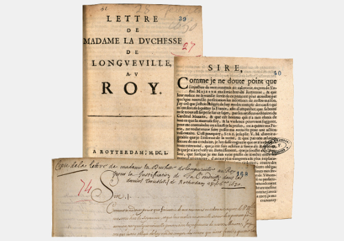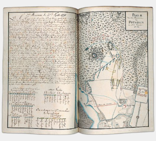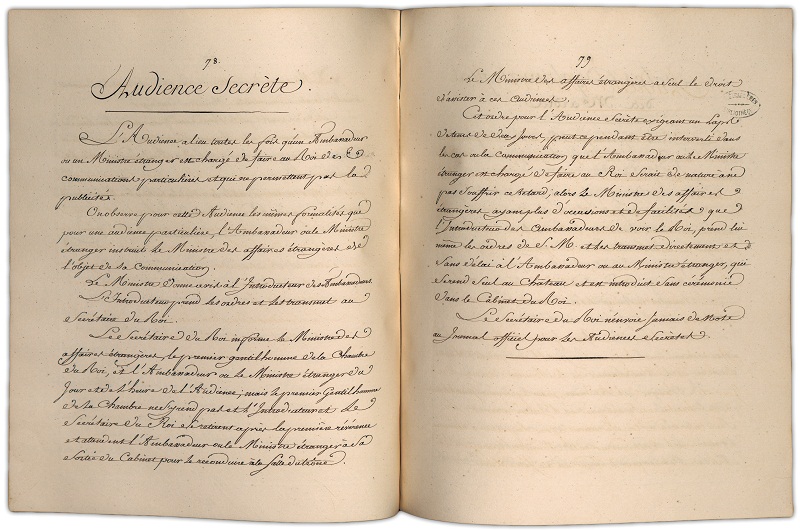 Le salon des curiosités Les Archives diplomatiques détiennent de nombreux documents étonnants dont le contenu peut parfois surprendre. Ils méritent qu’un coup de projecteur leur soit ici donné. Archives diplomatiques Publié le : 23 octobre 2025 Mis à jour le : 12 février 2026 Dans cette rubrique Archives & bibliothèque Venir aux Archives Confier ses archives ou travaux Consulter les archives Organiser un tournage aux Archives Organiser une visite des Archives Reproduire et réutiliser des archives Effectuer des recherches généalogiques ou familiales Accès des généalogistes professionnels Actes d’état civil et autres archives diplomatiques et consulaires L’état civil des Français à l’étranger Recherche de personnes disparues en Algérie pendant les derniers mois de la souveraineté française S’orienter dans les fonds et collections Ambassades, consulats, réseau culturel et de coopération (XVIe-XXe siècles) Colonies et territoires d’Outre-mer (1793-1960) Protectorats et mandat français (1881-1956) Récupération artistique Ressources pédagogiques Agenda et offre culturelle des Archives Concours des jeunes ambassadeurs et ambassadrices L’offre éducative du centre de La Courneuve L’offre éducative du centre de Nantes Sommaire Un aspect méconnu des relations franco-russes ! A l’origine du droit international public Frédéric II de Prusse à la manoeuvre Cérémonial diplomatique : tout un protocole ! Les mazarinades des Affaires étrangères : un corpus varié, original et rare Un aspect méconnu des relations franco-russes ! En 1912, en Russie, une nouvelle vodka est créée à laquelle on donnera le nom de « Larme amère de Napoléon ». Sur la bouteille, un portrait de l’empereur. Cette vodka remporte immédiatement un franc succès tant à la Cour impériale que parmi le peuple russe. Cette création fête les 100 ans de la bataille de Borodino connue sous le nom de bataille de la Moskova en France. Un livre, paru en 2007 à Moscou avec force illustrations et anecdotes, retrace cette histoire : « La vodka et Napoléon » d’Alexandre Nikichin et Piotr Netchitajlov. Bibliothèque, T 4224. Archives diplomatiques. A l’origine du droit international public Hugo Grotius est un juriste et diplomate hollandais (1583-1645). La publication de son oeuvre la plus célèbre De jure belli ac pacis (1625) marque la naissance du droit international public. Grotius y présente sa théorie de la guerre juste et prétend que toutes les nations sont liées par les principes du droit naturel. Calviniste modéré, il entretient de nombreux contacts avec les catholiques et espère une réunification des églises chrétiennes. Annales et historiae de rebus belgicis / Hugo Grotius. Amstelaedami : ex typographeio Joannis Blaeu, 1658. Bibliothèque, 3 Dz 5. Archives diplomatiques La bibliothèque du ministère des Affaires étrangères détient, pour la période de l’Ancien Régime, quatre éditions de cet ouvrage, en latin et en français. Composé en latin à Senlis, sur la suggestion de Nicolas-Claude Fabri de Peiresc (1580-1637), dédié à Louis XIII et publié en 1625, ce texte est traduit en français successivement par Antoine de Courtin (1622-1685) et Jean Barbeyrac (1674-1744). En 1711, l’abbé Legrand dans un Projet d’Estude signale la part qu’il a pris dans cette seconde traduction : « depuis M. de Barbeyrac l’a traduite, et je puis dire à ma sollicitation, en lui procurant quelque gratification de la part de M. le marquis de Torcy, avec espérance de faire changer la gratification en pension » (BNF, Clairambault, 519, fol. 324). Ce travail paraît seulement en 1724 à Amsterdam. Dédié au roi d’Angleterre George 1er, l’auteur dit dans sa préface tout le mal possible de son prédécesseur ! Un exemplaire conservé par la bibliothèque, publié en 1720, est considérablement annoté. Il a été acheté, avec de nombreux autres ouvrages, pour l’usage de la sous-direction du Contentieux lors de la vente des livres réunis par Jean Jacques Gaspard Foelix (1791-1853), savant jurisconsulte. Le catalogue des livres acquis a été dressé le 10 mars 1854 (MAE LC, Archives des Archives diplomatiques, 109SUP/35 D, fol. 148 r°-152 r°). De jure belli ac pacis… / Hugo Grotius. Amstelaedami : apud Janssonio-Waesbergios, 1720. Bibliothèque, 56 Ez 16. Archives diplomatiques Un manuscrit témoigne de l’étude approfondie qui a été faite de ce traité à l’Académie politique. Dans un mémoire adressé par Saint-Prest à l’abbé Dubois en [octobre ?] 1718, il est indiqué qu’au commencement de la seconde année, les élèves étudient le contenu de « l’excellent livre du droit de la guerre et de la paix composé par Hugues Grotius » (MAE LC, Mémoires et documents, France, 53MD/2186, fol. 29 v°). Chaque élève doit rédiger pour cinq chapitres un résumé qu’il lit lors de la conférence du vendredi. De son côté, Saint-Prest met toutes les questions contenues dans ce livre en demandes et réponses. Elles font également l’objet d’un débat lors des conférences sur le droit public. Ce travail se poursuit pendant les « derniers six mois de la troisième année et les six premiers mois de la quatrième finissans aux vacations de l’année 1715, peu après la mort du feu Roy ». Les élèves doivent ainsi parvenir au onzième chapitre du troisième livre. Le volume conservé s’achève au chapitre 25 du livre 3. Extraits du traité de Grotius du droit de la guerre et de la paix / [Jean Yves de Saint-Prest]. Bibliothèque, 56 Ez 13. Archives diplomatiques En cliquant sur ce lien, vous en apprendrez plus sur cette « école » pour négociateurs. Frédéric II de Prusse à la manoeuvre Collection de toutes les manœuvres [d’automne] que Frédéric le Grand exécuta près de Potsdam depuis la fin de la guerre de Sept ans jusqu’à sa mort et de celles du roi Frédéric-Guillaume II. Bibliothèque, Fg 1537. Archives di