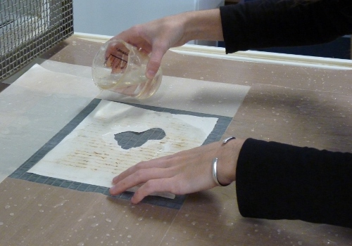 Conserver pour demain Préserver l’état matériel des documents parvenus jusqu’à nous pour les transmettre aux générations futures, tel est l’objectif des pratiques de conservation aux Archives diplomatiques. Cette démarche passe par la connaissance de l’histoire des documents, par une surveillance quotidienne de leurs conditions de conservation et des pratiques de communication, et par l’intervention de restaurateurs professionnels travaillant dans les ateliers des Archives (à La Courneuve et à Nantes) ou dans des ateliers extérieurs. Publié le : 13 mai 2025 Mis à jour le : 11 février 2026 Dans cette rubrique Archives & bibliothèque Venir aux Archives Confier ses archives ou travaux Consulter les archives Organiser un tournage aux Archives Organiser une visite des Archives Reproduire et réutiliser des archives Effectuer des recherches généalogiques ou familiales Accès des généalogistes professionnels Actes d’état civil et autres archives diplomatiques et consulaires L’état civil des Français à l’étranger Recherche de personnes disparues en Algérie pendant les derniers mois de la souveraineté française S’orienter dans les fonds et collections Ambassades, consulats, réseau culturel et de coopération (XVIe-XXe siècles) Colonies et territoires d’Outre-mer (1793-1960) Protectorats et mandat français (1881-1956) Récupération artistique Ressources pédagogiques Agenda et offre culturelle des Archives Concours des jeunes ambassadeurs et ambassadrices L’offre éducative du centre de La Courneuve L’offre éducative du centre de Nantes Sommaire Des documents fragiles et uniques Préserver et réparer Numériser pour mieux conserver et communiquer Relier : hier, aujourd’hui, demain Les archives de la Conférence de la paix Des documents fragiles et uniques Des fonds marqués par leur histoire… Libération de Paris, Quai d’Orsay. Façade sur la rue de l’Université après l’incendie, août 1944. Photo : Ministère des Affaires étrangères et européennes/Anonyme Comme dans bien d’autres institutions, la Deuxième Guerre mondiale a constitué pour les archives et la bibliothèque du Quai d’Orsay une période particulièrement funeste. L’état de conservation de certains fonds est encore marqué, de nos jours, par les incendies survenus en 1940 et 1944. De même, l’état physique des archives rapatriées des postes à l’étranger reflète les péripéties qu’elles ont traversées : climats tropicaux entraînant la prolifération des insectes ou des micro-organismes, aléas des déménagements, des fermetures de postes, des guerres, constituent autant de menaces dont les archives portent parfois les traces. Dégâts faits par le feu sur un registre. Photo : S. Abdaja Liasse d’archives du consulat de France à La Valette (détail) : l’humidité a entraîné la prolifération des moisissures, les feuilles sont collées entre elles, le papier est extrêmement friable. Photo : S. Abadja Les couvertures de ces registres de Durban ont constitué un festin pour les insectes. Photo : B. Fourquaux Un exemple des séquelles laissées par les conflits : balle ayant terminé sa course dans une liasse appartenant au fonds du consulat de France à Jérusalem. Photo : S. Abadja …qu’il importe de manipuler avec précaution La protection de l’état matériel des documents patrimoniaux implique une attention constante tant des bibliothécaires et archivistes que des lecteurs. Les professionnels du livre et des archives veillent à manipuler et à transporter avec soin les documents dont ils ont la responsabilité. Lorsque ceux-ci sont remis entre les mains du public des centres des Archives diplomatiques de La Courneuve et de Nantes, dans les salles de lecture, il leur est demandé d’observer quelques règles simples, présentées dans un dépliant (voir ci-dessous). Leur attention est également attirée sur le fait que l’état de conservation de certains documents peut conduire à leur exclusion de toute communication, même si les systèmes informatisés de gestion des archives et des bibliothèques ne l’indiquent pas. Consulter un livre ancien PDF - 502.5 KB Préserver et réparer La conservation a pour objectif d’allonger la durée de vie des documents par une série d’interventions, directes ou indirectes. On distingue deux types de conservation : la conservation préventive qui crée les conditions favorables à la longévité des documents ; la conservation curative qui retarde les phénomènes d’altération par une intervention directe sur le document. Lorsque les dommages sont constatés, la restauration est le seul moyen de rendre au document un aspect autorisant sa communication. Toutefois, elle doit être conduite de manière à respecter son intégrité physique et historique. La restauration du papier Selon leur niveau de dégradation, les documents endommagés sont confiés aux restaurateurs dans le cadre d’un programme annuel défini par les conservateurs responsables des collections. Les documents à restaurer sont tout d’abord dépoussiérés et numérotés pour en conserver l’ordre initial. Cette étape permet d’observer pièce à pièce les archives et d’identifier les types de dégradation. En fonction de la nature des supports, ils ne subiront pas le même traitement. Photo : S. Abadja Pour aller plus loin : Préservation et conservation aux Archives diplomatiques PDF - 148.5 KB La restauration des traités Fleuron des collections du ministère des Affaires étrangères, les traités – en particulier les instruments de ratification – font l’objet de soins tout particuliers. Ils posent des problèmes de conservation spécifiques, certaines pièces réunissant différents matériaux : papier, parchemin, couvrures textiles parfois agrémentées de broderies, sceaux et boîtes à sceau en bois ou métalliques, etc. La restauration des reliures de volumes d’archives Les volumes reliés