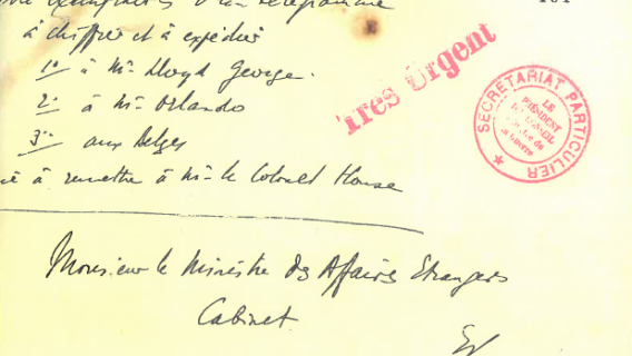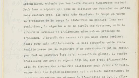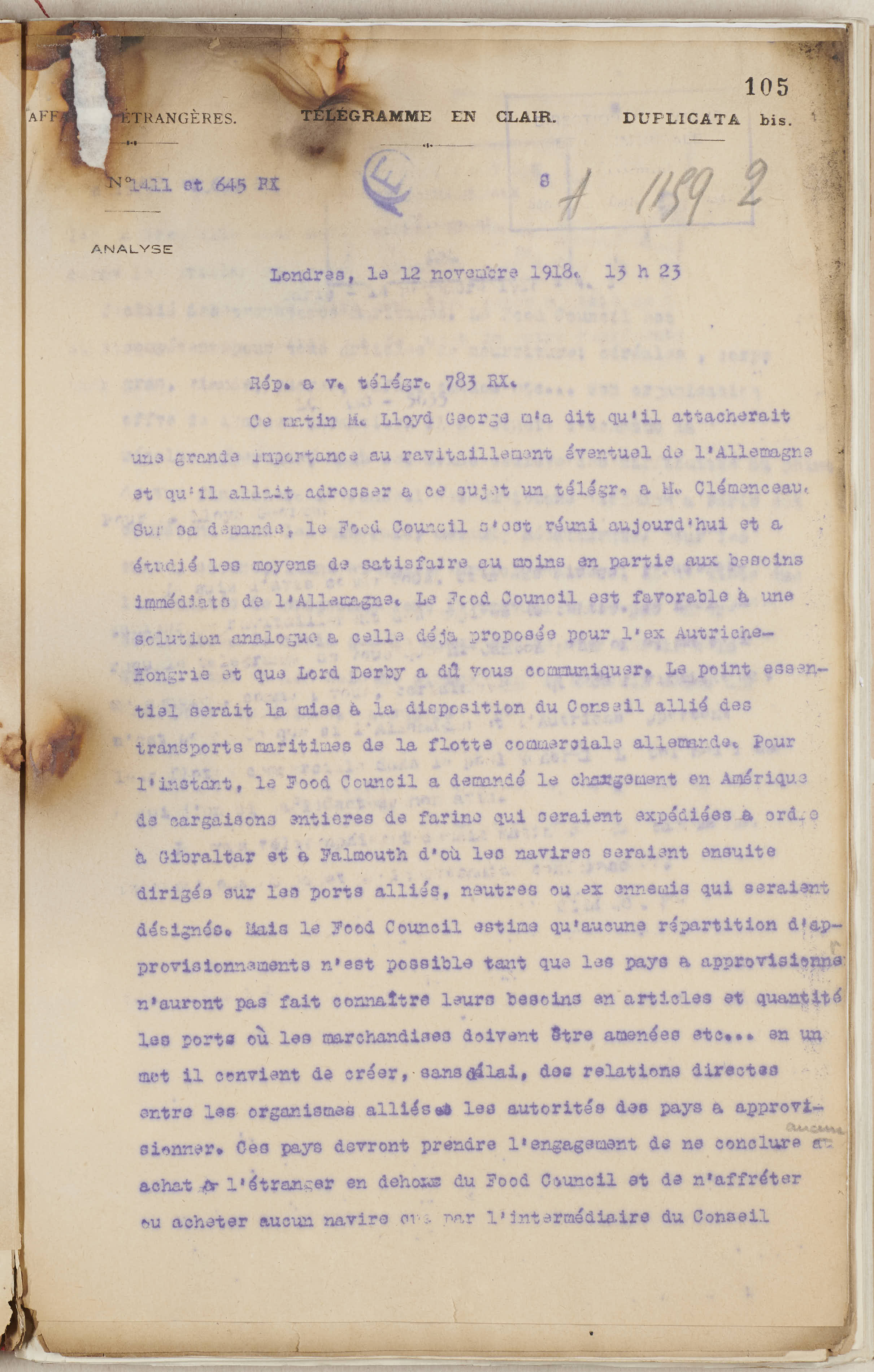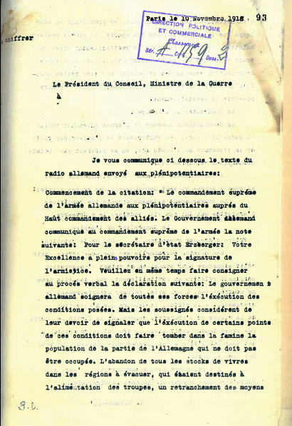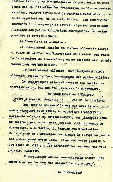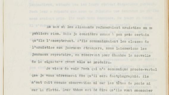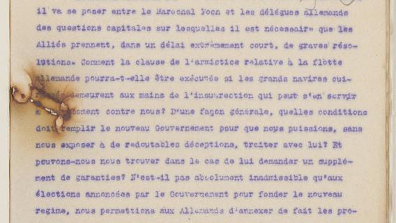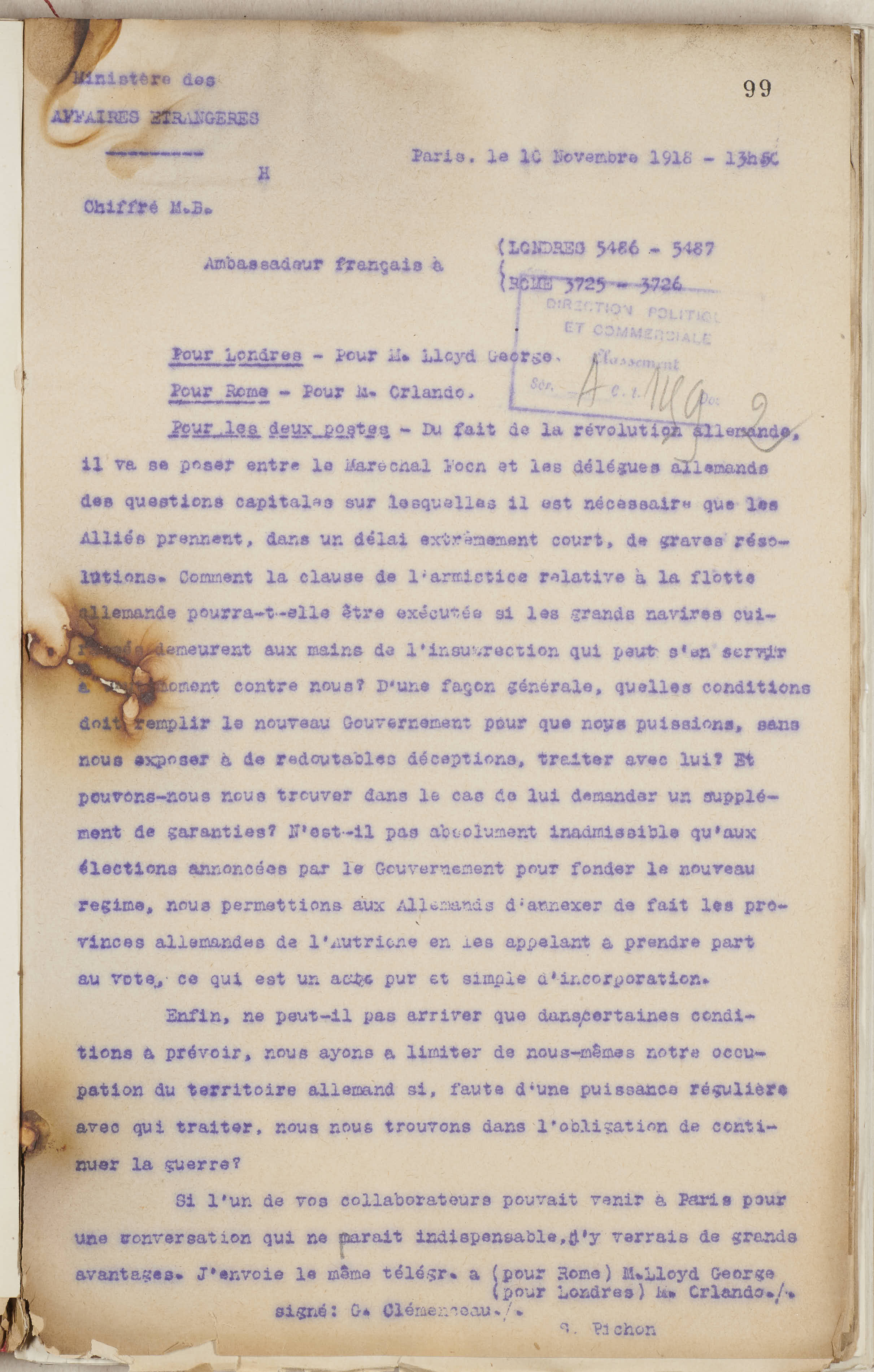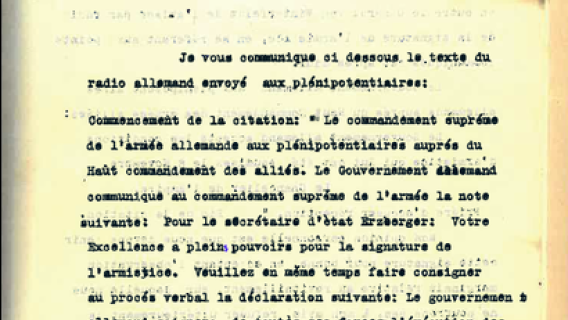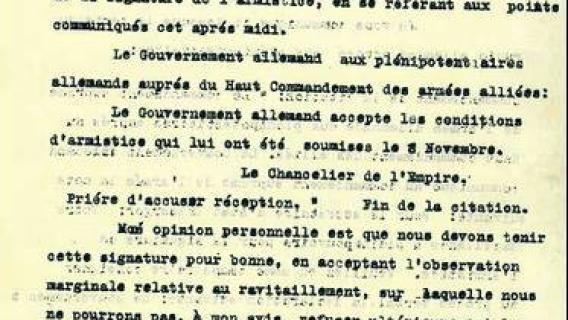 L’armistice du 11 novembre 1918 Comment les diplomates français ont-ils vécu et appris, au Quai d’Orsay et aux quatre coins du monde, la signature de la convention d’armistice du 11 novembre 1918 ? Comment la diplomatie française, qui ne fut pas – par nature – au premier plan des négociations de l’armistice par le Maréchal Foch, a-t-elle contribué à informer les autorités des pays alliés et à en recueillir les réactions ? Retour en images sur ce temps fort de notre histoire contemporaine grâce aux documents conservés par les Archives diplomatiques. Archives diplomatiques Publié le : 22 octobre 2025 Mis à jour le : 24 février 2026 Signature de l’Armistice à Rethondes Illustration de Maurice Pillard Verneuil Dans cette rubrique Archives & bibliothèque Venir aux Archives Confier ses archives ou travaux Consulter les archives Organiser un tournage aux Archives Organiser une visite des Archives Reproduire et réutiliser des archives Effectuer des recherches généalogiques ou familiales Accès des généalogistes professionnels Actes d’état civil et autres archives diplomatiques et consulaires L’état civil des Français à l’étranger Recherche de personnes disparues en Algérie pendant les derniers mois de la souveraineté française S’orienter dans les fonds et collections Ambassades, consulats, réseau culturel et de coopération (XVIe-XXe siècles) Colonies et territoires d’Outre-mer (1793-1960) Protectorats et mandat français (1881-1956) Récupération artistique Ressources pédagogiques Agenda et offre culturelle des Archives Concours des jeunes ambassadeurs et ambassadrices L’offre éducative du centre de La Courneuve L’offre éducative du centre de Nantes Sommaire 11 novembre 1918 : une convention d’armistice essentiellement négociée par les autorités militaires La diplomatie mobilisée pour informer les autorités des pays alliés et recueillir les réactions 11 novembre 1918 : une convention d’armistice essentiellement négociée par les autorités militaires Signature de l’Armistice à Rethondes Illustration de Maurice Pillard Verneuil La signature de l’armistice du 11 novembre 1918 à Rethondes (forêt de Compiègne) est intervenue – après les armistices bulgare, ottoman et austro-hongrois – immédiatement après la demande du chancelier allemand Max de Bade de suspension des hostilités le 7 novembre 1918, puis l’abdication de l’empereur Guillaume II (le 9 novembre), considéré par les chefs alliés comme le responsable de la Grande Guerre. L’Allemagne connaît alors une révolution (Novemberrevolution) qui suscite l’inquiétude des autorités françaises et britanniques (crainte de l’inconnu, menace bolchevique outre-Rhin). Une convention d’armistice diffère fondamentalement d’un traité de paix. La première est négociée par les autorités militaires – lesquelles sont soumises à un gouvernement pouvant d’ailleurs les inviter à insérer des clauses de nature non militaire – et a pour objectif immédiat la fin des combats. Le traité de paix est quant à lui négocié par un gouvernement civil : il définit les conditions de la paix en jetant les bases d’un nouvel ordre international. De ce point de vue, la diplomatie française n’est pas directement intervenue au moment même de la signature de l’armistice, sous l’autorité du maréchal Foch. De même, l’entrée des troupes françaises en Alsace-Lorraine (17-22 novembre 1918) est un événement militaire (général Gouraud). C’est le 18 janvier suivant, en 1919, que la diplomatie française est entrée au premier plan avec la tenue au Quai d’Orsay, sous la présidence du conseil de Georges Clemenceau, de la conférence de paix, en présence du président Woodrow Wilson – arrivé à Brest dès le 13 décembre, soit plus d’un mois avant la tenue de la conférence. La diplomatie mobilisée pour informer les autorités des pays alliés et recueillir les réactions Au moment de la signature de l’armistice, les diplomates communiquent, au Quai d’Orsay et aux quatre coins du monde, avec les autorités des pays alliés. Plusieurs documents datant des 9, 10 et 11 novembre, conservés par les Archives diplomatiques, témoignent de leurs préoccupations ainsi que de celles des autorités britanniques mais aussi allemandes. Cette conférence, au cours de laquelle le président américain a mis en œuvre plusieurs de ses 14 points exposés en janvier 1918, aboutit notamment aux traités de paix de Versailles (entre l’Allemagne et les alliés – 28 juin 1919), de Saint-Germain (entre l’Autriche et les alliés – 10 septembre 1919), de Neuilly (entre la Bulgarie et les alliés – 27 novembre 1919), de Trianon (entre la Hongrie et les alliés), de Sèvres (sur l’ancien Empire ottoman – 10 août 1920 – révisé à Lausanne en 1923). Un siècle plus tard, la France et l’Allemagne commémorent conjointement la fin de la Première Guerre mondiale, comme l’illustre la présence du président fédéral Frank-Walter Steinmeier auprès d’Emmanuel Macron le 4 novembre 2018 à la cathédrale de Strasbourg, capitale européenne et symbole de la réconciliation franco-allemande, et celle de la chancelière fédérale Angela Merkel, lors des cérémonies des 10 et 11 novembre 2018. Ce sont les leçons tirées des deux Guerres mondiales du XXe siècle qui ont conduit les deux peuples, français et allemand, à une réconciliation qui constitue le ferment, le socle de la construction européenne. Reddition allemande : notes prises par Georges Mandel, son chef de cabinet, sous la dictée de Georges Clemenceau, président du conseil et ministre de la guerre (9 nov. 1918) : Clemenceau considère comme à peu près certain que les Allemands accepteront l’armistice. Évocation de la demande allemande de conserver une armée et des mitrailleuses pour combattre le bolchevisme et une marine marchande pour ne pas subir de famine. Conclu