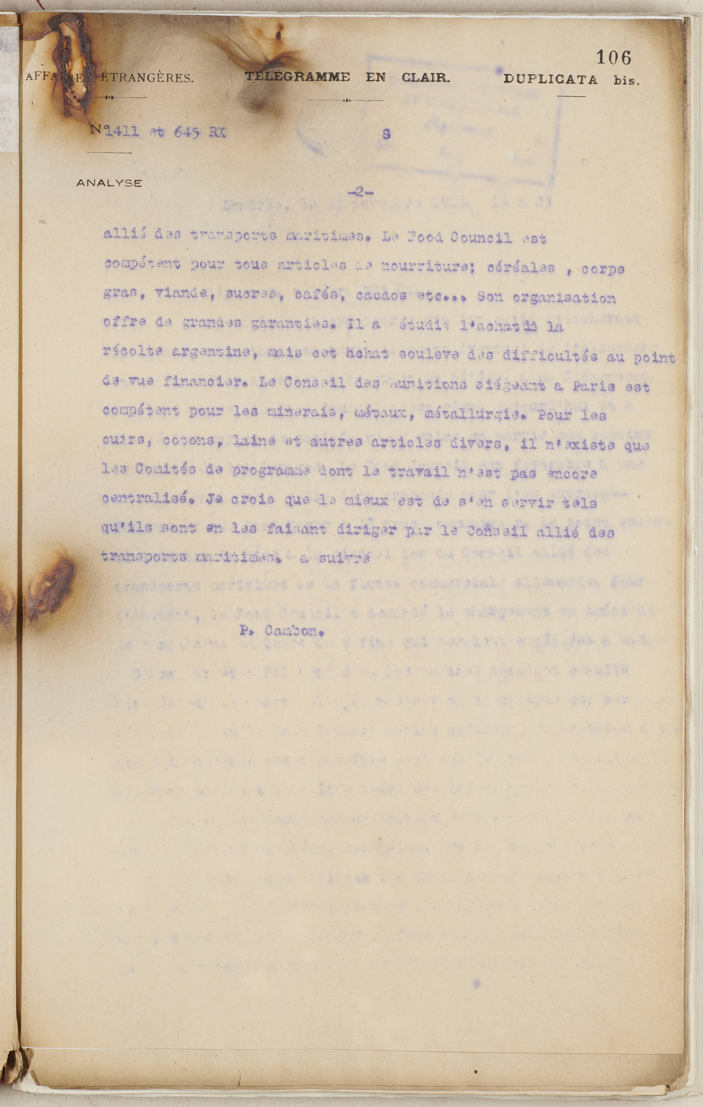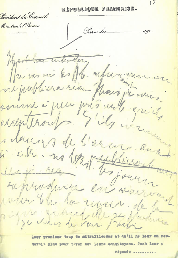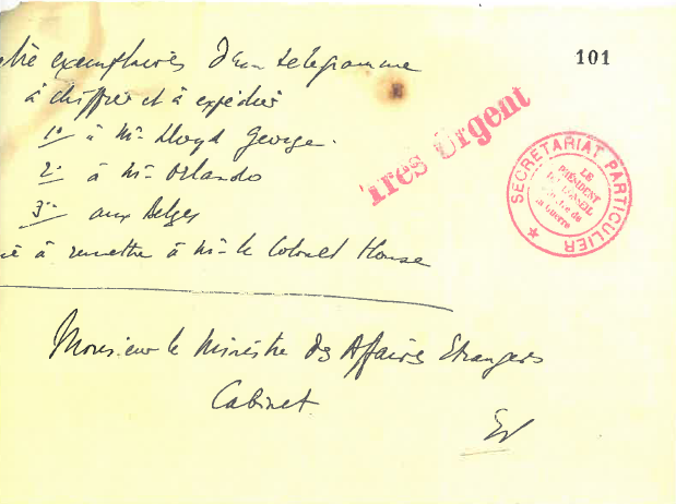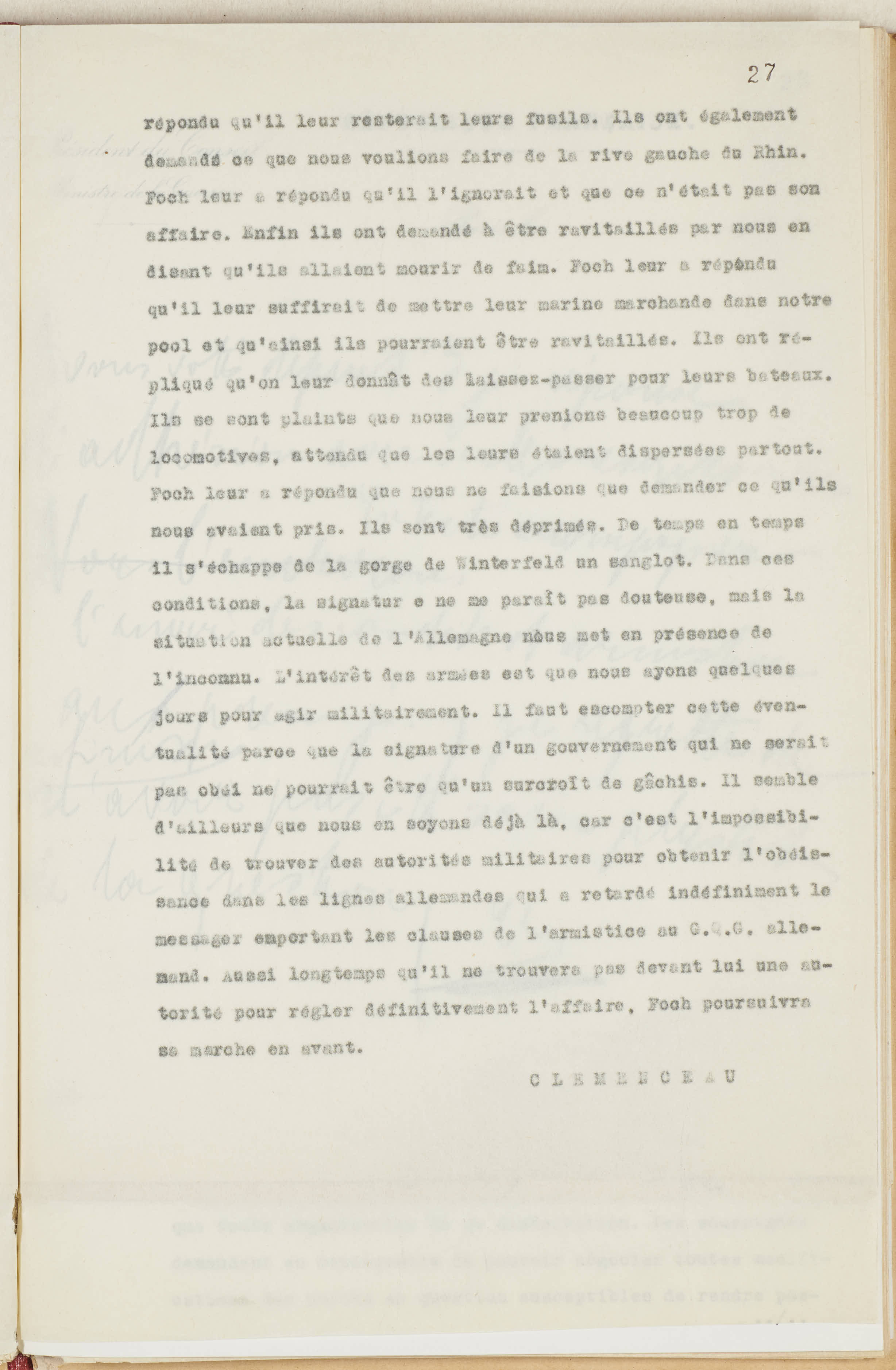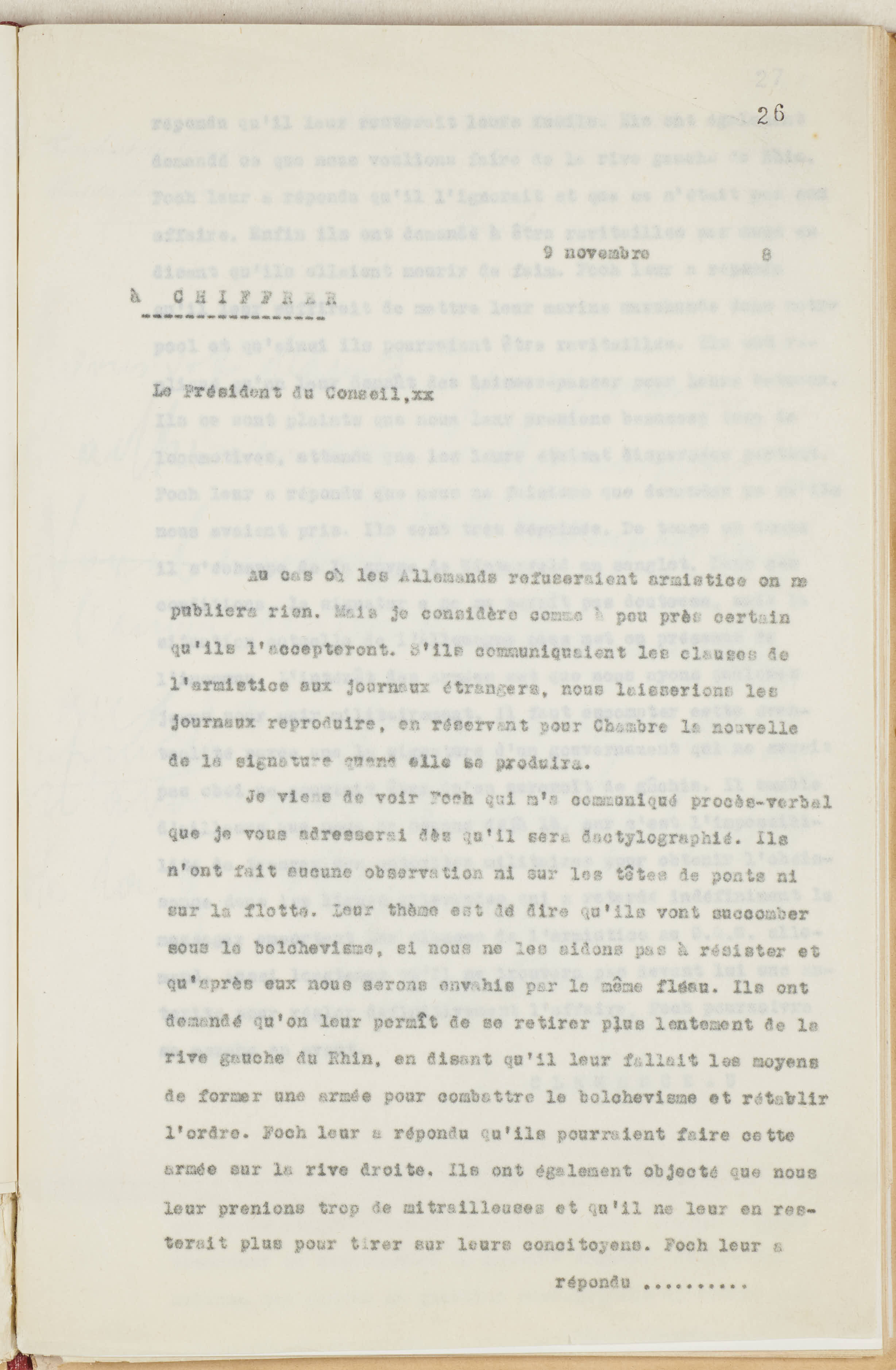L’armistice du 11 novembre 1918 Comment les diplomates français ont-ils vécu et appris, au Quai d’Orsay et aux quatre coins du monde, la signature de la convention d’armistice du 11 novembre 1918 ? Comment la diplomatie française, qui ne fut pas – par nature – au premier plan des négociations de l’armistice par le Maréchal Foch, a-t-elle contribué à informer les autorités des pays alliés et à en recueillir les réactions ? Retour en images sur ce temps fort de notre histoire contemporaine grâce aux documents conservés par les Archives diplomatiques. Archives diplomatiques Publié le : 22 octobre 2025 Mis à jour le : 24 février 2026 Signature de l’Armistice à Rethondes Illustration de Maurice Pillard Verneuil Dans cette rubrique Archives & bibliothèque Venir aux Archives Confier ses archives ou travaux Consulter les archives Organiser un tournage aux Archives Organiser une visite des Archives Reproduire et réutiliser des archives Effectuer des recherches généalogiques ou familiales Accès des généalogistes professionnels Actes d’état civil et autres archives diplomatiques et consulaires L’état civil des Français à l’étranger Recherche de personnes disparues en Algérie pendant les derniers mois de la souveraineté française S’orienter dans les fonds et collections Ambassades, consulats, réseau culturel et de coopération (XVIe-XXe siècles) Colonies et territoires d’Outre-mer (1793-1960) Protectorats et mandat français (1881-1956) Récupération artistique Ressources pédagogiques Agenda et offre culturelle des Archives Concours des jeunes ambassadeurs et ambassadrices L’offre éducative du centre de La Courneuve L’offre éducative du centre de Nantes Sommaire 11 novembre 1918 : une convention d’armistice essentiellement négociée par les autorités militaires La diplomatie mobilisée pour informer les autorités des pays alliés et recueillir les réactions 11 novembre 1918 : une convention d’armistice essentiellement négociée par les autorités militaires Signature de l’Armistice à Rethondes Illustration de Maurice Pillard Verneuil La signature de l’armistice du 11 novembre 1918 à Rethondes (forêt de Compiègne) est intervenue – après les armistices bulgare, ottoman et austro-hongrois – immédiatement après la demande du chancelier allemand Max de Bade de suspension des hostilités le 7 novembre 1918, puis l’abdication de l’empereur Guillaume II (le 9 novembre), considéré par les chefs alliés comme le responsable de la Grande Guerre. L’Allemagne connaît alors une révolution (Novemberrevolution) qui suscite l’inquiétude des autorités françaises et britanniques (crainte de l’inconnu, menace bolchevique outre-Rhin). Une convention d’armistice diffère fondamentalement d’un traité de paix. La première est négociée par les autorités militaires – lesquelles sont soumises à un gouvernement pouvant d’ailleurs les inviter à insérer des clauses de nature non militaire – et a pour objectif immédiat la fin des combats. Le traité de paix est quant à lui négocié par un gouvernement civil : il définit les conditions de la paix en jetant les bases d’un nouvel ordre international. De ce point de vue, la diplomatie française n’est pas directement intervenue au moment même de la signature de l’armistice, sous l’autorité du maréchal Foch. De même, l’entrée des troupes françaises en Alsace-Lorraine (17-22 novembre 1918) est un événement militaire (général Gouraud). C’est le 18 janvier suivant, en 1919, que la diplomatie française est entrée au premier plan avec la tenue au Quai d’Orsay, sous la présidence du conseil de Georges Clemenceau, de la conférence de paix, en présence du président Woodrow Wilson – arrivé à Brest dès le 13 décembre, soit plus d’un mois avant la tenue de la conférence. La diplomatie mobilisée pour informer les autorités des pays alliés et recueillir les réactions Au moment de la signature de l’armistice, les diplomates communiquent, au Quai d’Orsay et aux quatre coins du monde, avec les autorités des pays alliés. Plusieurs documents datant des 9, 10 et 11 novembre, conservés par les Archives diplomatiques, témoignent de leurs préoccupations ainsi que de celles des autorités britanniques mais aussi allemandes. Cette conférence, au cours de laquelle le président américain a mis en œuvre plusieurs de ses 14 points exposés en janvier 1918, aboutit notamment aux traités de paix de Versailles (entre l’Allemagne et les alliés – 28 juin 1919), de Saint-Germain (entre l’Autriche et les alliés – 10 septembre 1919), de Neuilly (entre la Bulgarie et les alliés – 27 novembre 1919), de Trianon (entre la Hongrie et les alliés), de Sèvres (sur l’ancien Empire ottoman – 10 août 1920 – révisé à Lausanne en 1923). Un siècle plus tard, la France et l’Allemagne commémorent conjointement la fin de la Première Guerre mondiale, comme l’illustre la présence du président fédéral Frank-Walter Steinmeier auprès d’Emmanuel Macron le 4 novembre 2018 à la cathédrale de Strasbourg, capitale européenne et symbole de la réconciliation franco-allemande, et celle de la chancelière fédérale Angela Merkel, lors des cérémonies des 10 et 11 novembre 2018. Ce sont les leçons tirées des deux Guerres mondiales du XXe siècle qui ont conduit les deux peuples, français et allemand, à une réconciliation qui constitue le ferment, le socle de la construction européenne. Reddition allemande : notes prises par Georges Mandel, son chef de cabinet, sous la dictée de Georges Clemenceau, président du conseil et ministre de la guerre (9 nov. 1918) : Clemenceau considère comme à peu près certain que les Allemands accepteront l’armistice. Évocation de la demande allemande de conserver une armée et des mitrailleuses pour combattre le bolchevisme et une marine marchande pour ne pas subir de famine. Conclu
