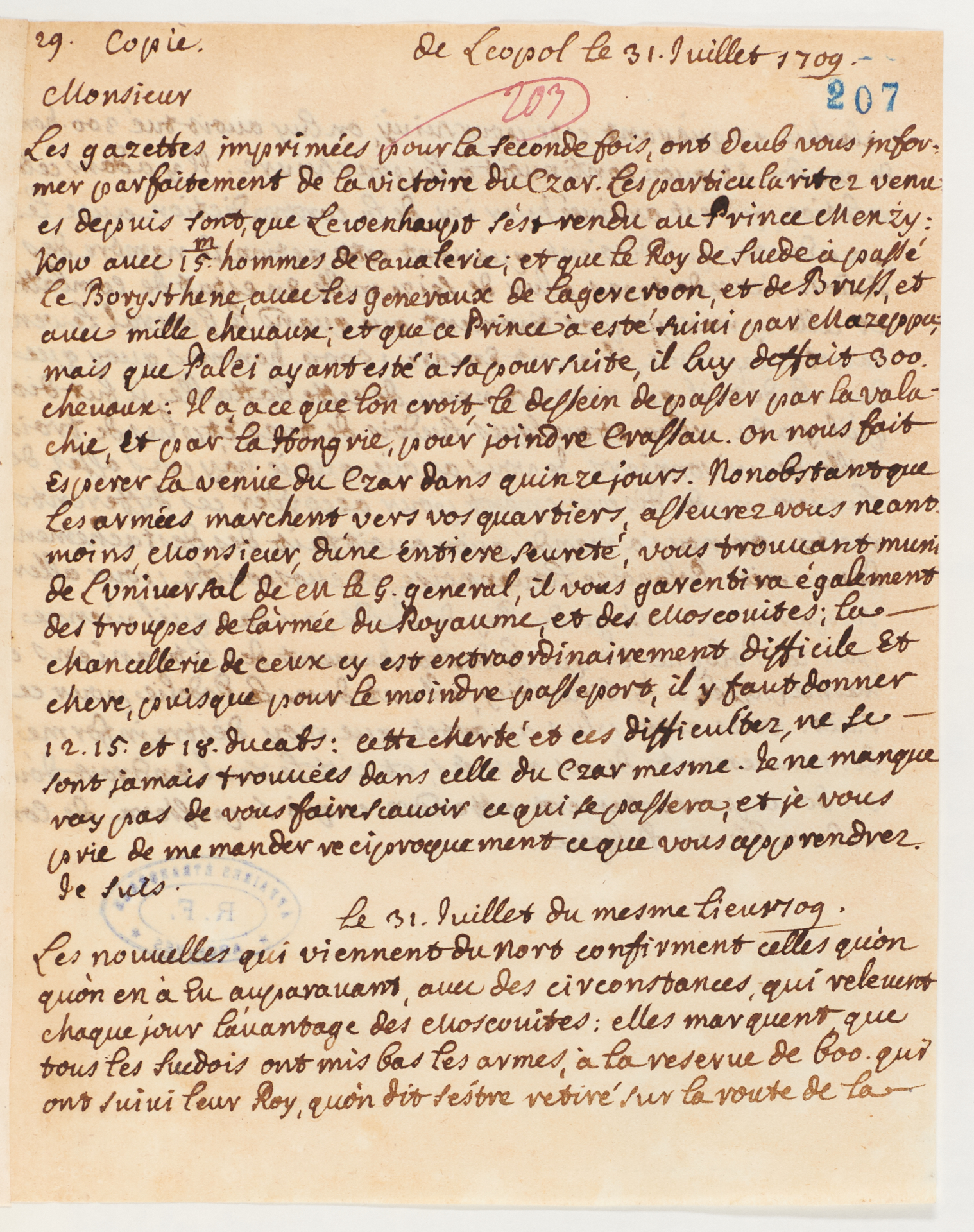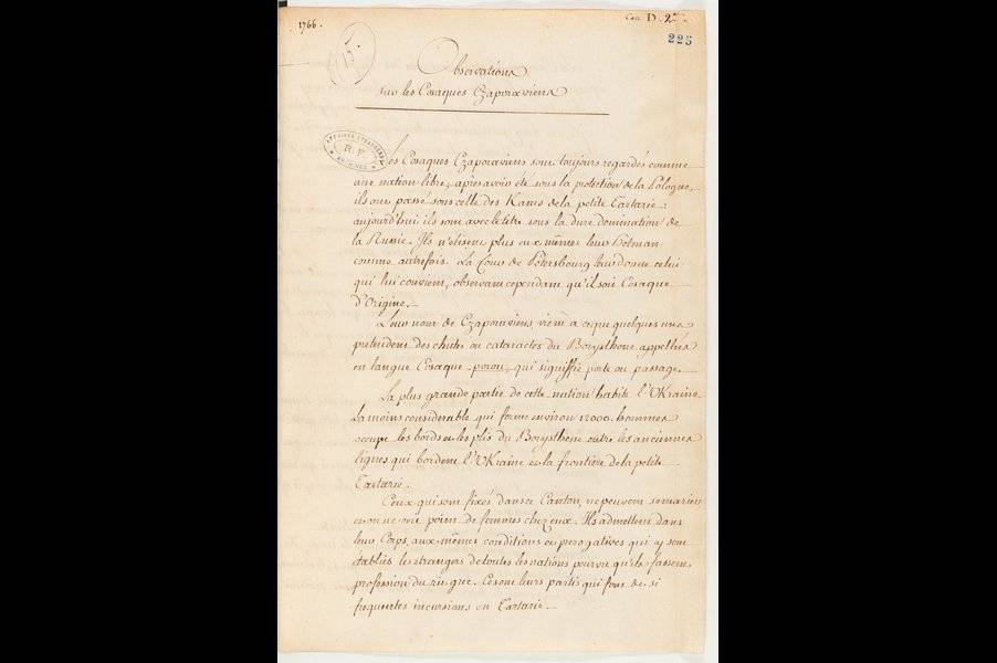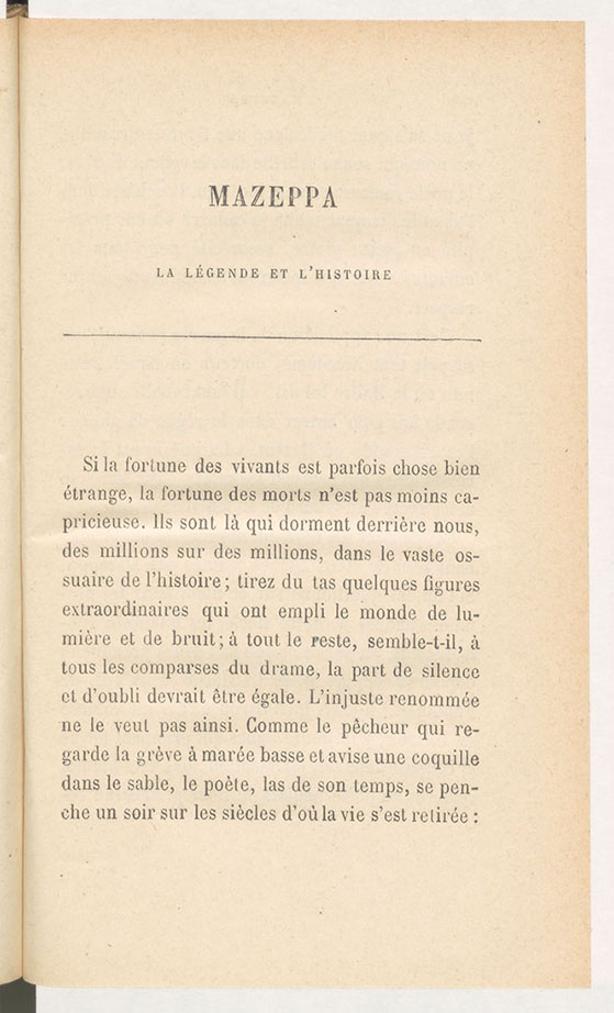 Cosaques d’Ukraine L’Ukraine aux Archives diplomatiques - Focus, XVIIe siècle à 1919 Ukraine Archives diplomatiques Publié le : 02 janvier 2026 Dans cette rubrique Archives & bibliothèque Venir aux Archives Confier ses archives ou travaux Consulter les archives Organiser un tournage aux Archives Organiser une visite des Archives Reproduire et réutiliser des archives Effectuer des recherches généalogiques ou familiales Accès des généalogistes professionnels Actes d’état civil et autres archives diplomatiques et consulaires L’état civil des Français à l’étranger Recherche de personnes disparues en Algérie pendant les derniers mois de la souveraineté française S’orienter dans les fonds et collections Ambassades, consulats, réseau culturel et de coopération (XVIe-XXe siècles) Colonies et territoires d’Outre-mer (1793-1960) Protectorats et mandat français (1881-1956) Récupération artistique Ressources pédagogiques Agenda et offre culturelle des Archives Concours des jeunes ambassadeurs et ambassadrices L’offre éducative du centre de La Courneuve L’offre éducative du centre de Nantes Issu d’une famille de diplomates, Eugène Melchior de Vogüe, introducteur de Dostoïevski en France, consacre un essai à Mazepa, non sans rappeler d’abord que Voltaire avant lui, dans la Vie de Charles XII et Victor Hugo, dans les Orientales, se sont saisis de la légende de l’hetman. En effet, Mazepa est une figure fascinante. Né en 1639 sur la rive gauche du Dniepr, il mène une vie pleine de rebondissements politiques et de hauts faits d’armes qui le conduisent de l’Ukraine à la Pologne, de Kiev à Azov jusqu’à la Moldavie où sa mort en exil achève de lui conférer une aura d’héros romantique. Noble ukrainien, il reçoit une éducation soignée, maîtrise l’italien, le français et l’allemand, cite Horace et Ovide par cœur. Diplomate, jamais avare de volte-face et de tractations secrètes, il pousse les intérêts de son pays face aux appétits de la république polonaise et lituanienne, de l’empire russe, de l’empire ottoman. Son intelligence et sa souplesse lui permettent d’être élu hetman des deux rives du Dniepr sous l’égide du pouvoir russe. Il se met au service du tsar Pierre le Grand, conduit en son nom des offensives victorieuses contre les Turcs et en tire un prestige qu’il met au service de ses cosaques : habile gestionnaire, il développe l’économie de ses territoires, se fait mécène de l’instruction et des arts, agit en protecteur de l’Eglise orthodoxe. La volonté de Pierre de mettre fin à l’autonomie du hetmanat précipite sa chute. Mazepa ne peut supporter une telle perspective. Il rejoint l’ennemi juré de Pierre, le roi de Suède Charles XII de Suède. La bataille de Poltava (1709) est une déroute pour les Suédois et leurs alliés cosaques. Mazepa meurt la même année. Traître aux yeux des Russes, sa volonté farouche fera de lui un symbole de la nation ukrainienne. E. Melchior de Vogüe. Mazepa. La légende et l’histoire Paris : Calmann-Lévy, 1889. 365 p. ; in-16° © Archives du ministère des Affaires étrangères, Bibliothèque, 20 B 49 Témoignage sur la bataille de Poltava. Lettre à l’ambassadeur de France en Suède. Léopol, 31 juillet 1709 © Archives du ministère des Affaires étrangères, Correspondance politique Suède, 123CP120, fol. 207 "Le Roy de Suède a passé le Borysthène (….) ce prince a été suivi par Mazeppa (…) les suédois ont mis bas les armes … » Personnage légendaire, Ivan Mazepa (1639-1709) a, à l’ère romantique, représenté un motif d’inspiration pour les écrivains. Il apparaît aussi fugacement dans les correspondances diplomatiques, comme ici, dans ce récit de la bataille de Poltava. Byron’s poetical Works London : John Murray, 1873. 685 p. ; in-12° © Archives du ministère des Affaires étrangères, Bibliothèque, 40 Ax 47 Si le poème Mazeppa s’attache à un épisode de la légende populaire d’Ivan Mazepa, il n’est pas sans faire écho à l’existence tumultueuse de son auteur, Lord Byron, figure de proue du romantisme de langue anglaise. Page à la cour du roi de Pologne Jean II Casimir, Mazepa est surpris en flagrant délit d’adultère. Il est ligoté, nu, enduit de goudron, sur un cheval sauvage qui l’emporte. Les cosaques le recueillent et, séduits par son autorité et ses dons, en font leur maître. Lire ce poème, c’est y entendre les échos de la vie du jeune lord, ses amours tumultueuses, le scandale provoqué par ses infidélités à répétition, son exil forcé d’Angleterre en 1816 (trois ans avant la composition du poème), sa quête de reconnaissance et ses aspirations à la gloire. C’est aussi éprouver le pouvoir des mots qui font du héros national ukrainien une figure littéraire et qui place l’Ukraine sur la carte de l’Europe romantique. Extrait du Journal de Philippe Orlyk © Archives du ministère des Affaires étrangères, Mémoires et Documents Pologne, 38MD7 La biographie de Pylyp Orlyk (1672-1742) a été retracée dès la fin du XIXe siècle (ouvrage de A. Petrouchevytch paru à Lviv en 1872) mais c’est à Elie Borschak, réfugié ukrainien en France dans les années 1920-1930 devenu professeur à l’Ecole des langues orientales que l’on doit une connaissance approfondie du personnage à travers nombre d’articles, et la découverte du « Diariuche » aux Archives du ministère des Affaires étrangères. Le Journal, qui couvre cinq volumes de la série Mémoires et Documents (38MD/7 à 11) est en fait une collection de correspondances diverses rédigées, notamment, en latin et polonais, mais aussi en français entre 1720 et 1733. En tête du journal, des bénédictions en langue latine destinées à assurer à l’auteur la protection divine et à favoriser ses entreprises. Proche de l’hetman Yvan Mazepa aux côtés duquel il rallia les troupes de Charles XII de Suède, Orlyk s