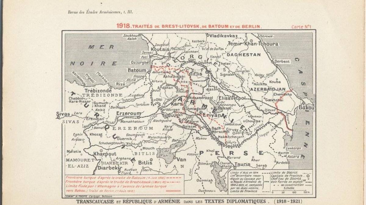 II - Sortir de l'empire, entrer sur la scène internationale Inopinée, l’indépendance est rapidement assumée. Les dirigeants des trois pays entreprennent de constituer des républiques démocratiques et socialistes, de relancer l’économie, puis, à la fin de la Première Guerre, d’entrer sur la scène internationale en participant à la conférence de la Paix et en élaborant une stratégie pour obtenir la reconnaissance de jure de leur souveraineté et des frontières revendiquées. Publié le : 09 octobre 2025 Mis à jour le : 24 février 2026 Dans cette rubrique Archives & bibliothèque Venir aux Archives Confier ses archives ou travaux Consulter les archives Organiser un tournage aux Archives Organiser une visite des Archives Reproduire et réutiliser des archives Effectuer des recherches généalogiques ou familiales Accès des généalogistes professionnels Actes d’état civil et autres archives diplomatiques et consulaires L’état civil des Français à l’étranger Recherche de personnes disparues en Algérie pendant les derniers mois de la souveraineté française S’orienter dans les fonds et collections Ambassades, consulats, réseau culturel et de coopération (XVIe-XXe siècles) Colonies et territoires d’Outre-mer (1793-1960) Protectorats et mandat français (1881-1956) Récupération artistique Ressources pédagogiques Agenda et offre culturelle des Archives Concours des jeunes ambassadeurs et ambassadrices L’offre éducative du centre de La Courneuve L’offre éducative du centre de Nantes Sommaire Les premiers pas sur la scène internationale à la conférence de la Paix La France sur le terrain Heurs et malheurs de l’indépendance Conflits et alliances entre les républiques Dans la tourmente de deux révolutions Les délimitations territoriales, issues de multiples découpages administratifs de type colonial des empires successifs, seront l’enjeu de guerres féroces entre les nouveaux États de cet espace mosaïque où les Puissances – Turcs ottomans, puis kémalistes, Alliés franco-britanniques de l’Entente, Russes blancs ou rouges – continuent de s’affronter. Ce sont les bolcheviks, alliés aux kémalistes contre l’Entente et ses projets de reconfiguration régionale, qui sauront le mieux en tirer parti en jouant des antagonismes multiples. Les premiers pas sur la scène internationale à la conférence de la Paix Coupure de presse sur la Délégation géorgienne à Paris, L’Humanité, 13 mars 1919 : compte-rendu de la réception, le 12 mars 1919, de Nicolas Tcheidzé et d’Irakli Tsérétéli par le groupe parlementaire socialiste de l’Assemblée nationale dont ils espèrent qu’il soutiendra la cause de leur République, fondée sur le droit des peuples à disposer d’eux-mêmes. S’ils sont contre les méthodes des bolcheviks, ils partagent l’avis des socialistes français contre une intervention de l’Entente, même s’ils n’ont pas les moyens de s’y opposer. Ils relatent l’organisation de la Constituante et du partage des terres en Géorgie. Télécharger la coupure de presse PDF - 541.0 KB Lettre signée par Ali Mardan Toptchibacheff au Président de la conférence de la Paix, Georges Clemenceau, Constantinople, 21 mars 1919 : lettre de la Délégation de Paix de la République d’Azerbaïdjan, portant la signature autographe de son président, Ali Mardan Toptchibacheffet et de son secrétaire, Mahomed Maheramoff au Président de la Conférence de la Paix, Georges Clemenceau. Arrivés à Constantinople, le 20 janvier 1919, les membres de la Délégation n’ont toujours pas reçu l’autorisation de se rendre à Paris, à la différence des délégations de l’Arménie, de la Géorgie et du Caucase du Nord, qui ont ainsi la possibilité de défendre leurs intérêts et présenter leurs revendications. Télécharger la lettre PDF - 1 440.0 KB Archives du Ministère des Affaires étrangères, Correspondance politique et commerciale, 1918-1940, Z-Europe, URSS-Géorgie, 654, fol. 13-14 (117 CPCOM654, 13-14) Lettre d’Avétis Aharonian, président de la Délégation de la République d’Arménie à la Conférence de la Paix, à Stephen Pichon, ministre des Affaires étrangères, Paris, 9 mai 1919 : six mois après l’armistice, malgré son engagement et ses sacrifices pour la cause des Alliés, le peuple arménien ne peut profiter des fruits de la paix. Les forces turques sont toujours massées aux frontières et empêchent les réfugiés de l’Arménie turque de retourner dans leurs foyers. Ils meurent de faim et d’épidémie. Faute d’être reconnue, la République ne peut contracter aucun emprunt et risque d’être transformée en un vaste cimetière. D’où un appel désespéré à accélérer cette reconnaissance, accorder un emprunt et de fournir du matériel militaire aux troupes arméniennes pour la défense du pays. Télécharger la lettre PDF - 1 459.4 KB Délégation arménienne (de gauche à droite) : Boghos Nubar Pacha et Avetis Aharonian © Anonyme Déclaration des Puissances alliées sur la reconnaissance des républiques de Géorgie, d’Azerbaïdjan et d’Arménie, Paris, 1er mars 1920 : rappel des décisions de la conférence de la Paix sur la reconnaissance de facto des gouvernements des républiques de Géorgie et d’Azerbaïdjan, le 15 janvier 1920, et de l’Arménie, le 19, par les Principales Puissances alliées et associées. Télécharger la déclaration des Puissances alliées PDF - 287.9 KB Note manuscrite du lieutenant-colonel Chardigny à la Direction politique sur Guéguétchkori, Paris, 5 septembre 1920 : appréciation du commandant en chef du détachement français au Caucase sur Evgueni Guéguétchkori, « personnage aujourd’hui le plus important » et « le plus ententophile » de la République de Géorgie, à l’occasion de sa venue en Europe pour exposer la situation de la Transcaucasie et solliciter le soutien des Alliés contre les bolcheviks, d’accord avec