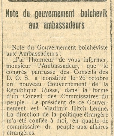 Les révolutions russes de 1917 Cette exposition-dossier propose une sélection d’archives rares sur les Révolutions russes de 1917. Réalisée à partir des documents originaux conservés au centre de La Courneuve, elle présente des témoignages de diplomates qui ont vécu ces évènements au plus près de l’actualité de 1916 à 1924. Archives diplomatiques Publié le : 21 octobre 2025 Mis à jour le : 24 février 2026 Le Monde illustré. 28 juin 1919 Dans cette rubrique Archives & bibliothèque Venir aux Archives Confier ses archives ou travaux Consulter les archives Organiser un tournage aux Archives Organiser une visite des Archives Reproduire et réutiliser des archives Effectuer des recherches généalogiques ou familiales Accès des généalogistes professionnels Actes d’état civil et autres archives diplomatiques et consulaires L’état civil des Français à l’étranger Recherche de personnes disparues en Algérie pendant les derniers mois de la souveraineté française S’orienter dans les fonds et collections Ambassades, consulats, réseau culturel et de coopération (XVIe-XXe siècles) Colonies et territoires d’Outre-mer (1793-1960) Protectorats et mandat français (1881-1956) Récupération artistique Ressources pédagogiques Agenda et offre culturelle des Archives Concours des jeunes ambassadeurs et ambassadrices L’offre éducative du centre de La Courneuve L’offre éducative du centre de Nantes Le parcours chronologique s’articule autour de trois parties : les préludes de la révolution, les journées révolutionnaires et l’après révolution qui ouvre une nouvelle ère de relations diplomatiques. Sommaire Préludes de la révolution Journées révolutionnaires Vers de nouvelles relations diplomatiques Préludes de la révolution Pour évoquer les événements qui mènent à la première révolution de février, c’est essentiellement au témoignage de Maurice Paléologue, ambassadeur à Petrograd de 1914 à 1917 que l’on a ici fait appel. Saint-Petersbourg, ambassade de France. L’ambassadeur, Maurice Paléologue, dans son bureau en compagnie de ses collaborateurs. Vers 1914. Collection iconographique, fonds Immeubles, A0411896. Grande figure de la diplomatie, très proche de la famille et de l’entourage du Tsar, il transmet au Quai d’Orsay une correspondance bien informée où il trace le portrait d’un Nicolas II sinon indifférent aux événements du moins inconscient de leur gravité. En décembre 1916, Paléologue attire l’attention sur l’assassinat de Raspoutine [1], une information largement relayée dans l’opinion par les journaux du temps. Un Raspoutine qu’il décrit par ailleurs comme « un moujik sibérien, tenant à la fois de l’apôtre, du thaumaturge et du satyre [2] ». Maurice Paléologue est considéré comme une source d’information très fiable sur les événements qui annoncent la Révolution de 1917. Son journal, intitulé Le Crépuscule des tsars, a été publié en 2007 au Mercure de France. Journées révolutionnaires Cette seconde partie de l’exposition présente successivement les télégrammes rédigés par Maurice Paléologue, puis ceux de Joseph Noulens, ambassadeur de France à Pétrograd de 1917 à 1919, ainsi que les correspondances des consuls en poste et les articles de la presse relayant l’information. Dès février, pillages, grèves et manifestations se succèdent. Rodzianko président de la Douma, alerte et supplie le tsar. Les monuments et bâtiments publics sont pillés et incendiés [3]. L’ambassade est un refuge [4] d’où il est difficile de sortir, les fusillades sont intenses. Le 12 mars, Maurice Paléologue notera dans son agenda ce simple mot : « Révolution ». La révolution de mars 1917 racontée et illustrée par Louis de Robien, attaché d’ambassade en Russie de 1917 à 1918. Le Monde illustré. 28 juin 1919 Dans son télégramme du 20 mars au soir, Maurice Paléologue établit un parallèle avec la Révolution française. Le tsar Nicolas II est devenu le citoyen Nicolas Romanov [5]. L’atmosphère générale décrite est celle qui prédominait lors du retour de Varennes de Louis XVI. Fin mars, la famille impériale est arrêtée. Les conditions de sa détention vont se dégrader inéluctablement. Le gouvernement provisoire dirigé par Kerenski a grand peine à ramener le calme et les autorités se délitent. Jules Cambon [6], alors secrétaire général du ministère des Affaires étrangères, rédige un rapport en date du 1er octobre 1917 [7] sur la situation politique, économique et militaire en Russie. Si l’anarchie règne de la campagne à la ville, de l’administration à l’armée, il attire néanmoins l’attention sur les ressources immenses de la Russie. Une autre analyse politique semble corroborer l’analyse de Jules Cambon. Le 5 novembre 1917, un membre du soviet des ouvriers et soldats affirme dans une note [8] qu’il adresse au Comité que le parti des bolcheviques mène le pays à la ruine : « Notre masse est insuffisamment éclairée, nous n’avons pas d’hommes d’étude nous ne pouvons même pas envoyer un ambassadeur, nous manquons partout d’intellectuels. Ingénieurs, docteurs, professeurs, avocats… sont tous des cadets et tous ces messieurs sont contre le soviet des députés ouvriers et soldats. » Joseph Noulens, nommé ambassadeur de Pétrograd à la suite de Maurice Paléologue souligne dans un télégramme du 7 novembre [9], la situation particulièrement grave dont il est le témoin. Les communications télégraphiques sont coupées, les arrestations et exécutions se poursuivent. Le 10 novembre 1917, Léon Trotsky adresse une lettre aux ambassadeurs, publiée dans Le Journal de Russie [10]. Il présente Lénine comme le chef du gouvernement bolchevique et se présente lui-même comme le commissaire du peuple aux Affaires étrangères. Note du gouvernement bolchevik aux ambassadeurs. Journal de Russie. Extrait. 10 novembre