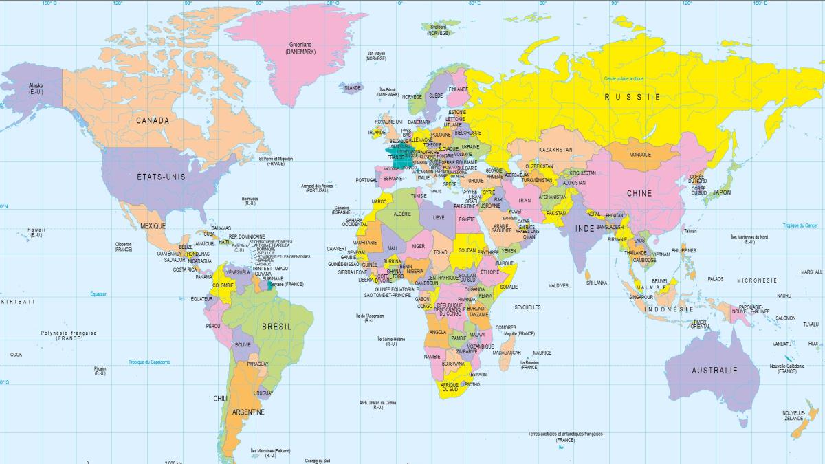 Monde et autres régions Monde et autres régions Archives diplomatiques Publié le : 21 avril 2026 Mis à jour le : 22 avril 2026 © Archives du Ministère de l’Europe et des Affaires étrangères - La Courneuve Dans cette rubrique Archives & bibliothèque Venir aux Archives Confier ses archives ou travaux Consulter les archives Organiser un tournage aux Archives Organiser une visite des Archives Reproduire et réutiliser des archives Effectuer des recherches généalogiques ou familiales Accès des généalogistes professionnels Actes d’état civil et autres archives diplomatiques et consulaires L’état civil des Français à l’étranger Recherche de personnes disparues en Algérie pendant les derniers mois de la souveraineté française S’orienter dans les fonds et collections Ambassades, consulats, réseau culturel et de coopération (XVIe-XXe siècles) Cartes Colonies et territoires d’Outre-mer (1793-1960) Etat général des fonds - Inventaires en ligne Images Livres et revues Protectorats et mandat français (1881-1956) Récupération artistique Traités et accords Ressources pédagogiques Agenda et offre culturelle des Archives Concours des jeunes ambassadeurs et ambassadrices L’offre éducative du centre de La Courneuve L’offre éducative du centre de Nantes Carte politique du monde Projection de Robinson Carte politique du Monde - Projection Robinson JPG - 776.6 KB Carte politique du Monde - Projection Robinson PDF - 1 512.4 KB Projection d’Eckert (IV) Carte politique du Monde - Projection Eckert (IV) JPG - 761.9 KB Carte politique du Monde - Projection Eckert (IV) PDF - 1 468.2 KB Projection stéréographique de Gall Carte politique du monde - projection Gall JPG - 835.8 KB Carte politique du monde - projection Gall PDF - 1 462.0 KB Autres régions ARCTIQUE 2023 ARCTIQUE 2023 JPG - 999.7 KB ARCTIQUE 2023 PDF - 1 654.6 KB ANTARCTIQUE ANTARCTIQUE JPG - 1 541.3 KB ANTARCTIQUE PDF - 1 118.4 KB BASSIN MÉDITERRANÉEN BASSIN MÉDITERRANÉEN JPG - 1 703.8 KB BASSIN MÉDITERRANÉEN PDF - 1 116.1 KB ESPACE INDOPACIFIQUE ESPACE INDOPACIFIQUE JPG - 756.8 KB ESPACE INDOPACIFIQUE PDF - 502.7 KB MONDE - ÉTATS ET CAPITALES MONDE - ÉTATS ET CAPITALES JPG - 1 118.5 KB MONDE - ÉTATS ET CAPITALES PDF - 1 421.9 KB OCÉANS INDIEN ET PACIFIQUE OCÉANS INDIEN ET PACIFIQUE JPG - 1 049.2 KB OCÉANS INDIEN ET PACIFIQUE PDF - 1 493.4 KB PACIFIQUE (A3) PACIFIQUE (A3) JPG - 1 686.0 KB PACIFIQUE (A3) PDF - 3 706.2 KB MER ROUGE MER ROUGE JPG - 1 059.2 KB MER ROUGE PDF - 2 604.5 KB