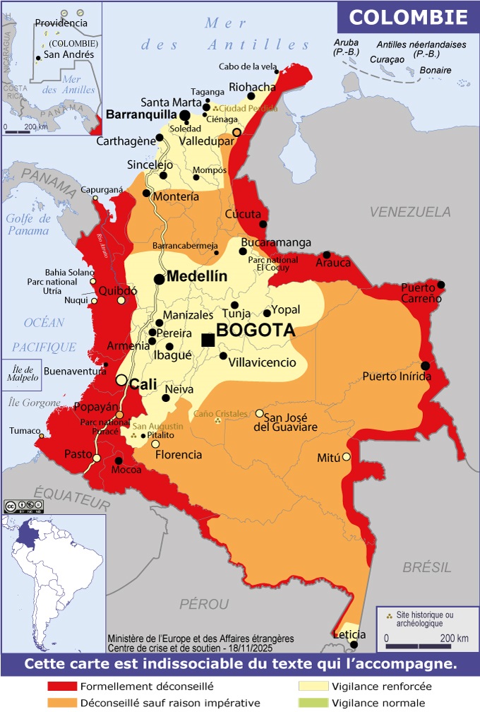 Il est recommandé aux ressortissants français qui y sont actuellement présents de faire preuve de la plus grande vigilance et prudence et de se tenir absolument à l’écart de toute manifestation ou rassemblement. De manière générale, tous les Français résidant ou de passage en Colombie sont appelés à la plus grande vigilance.
