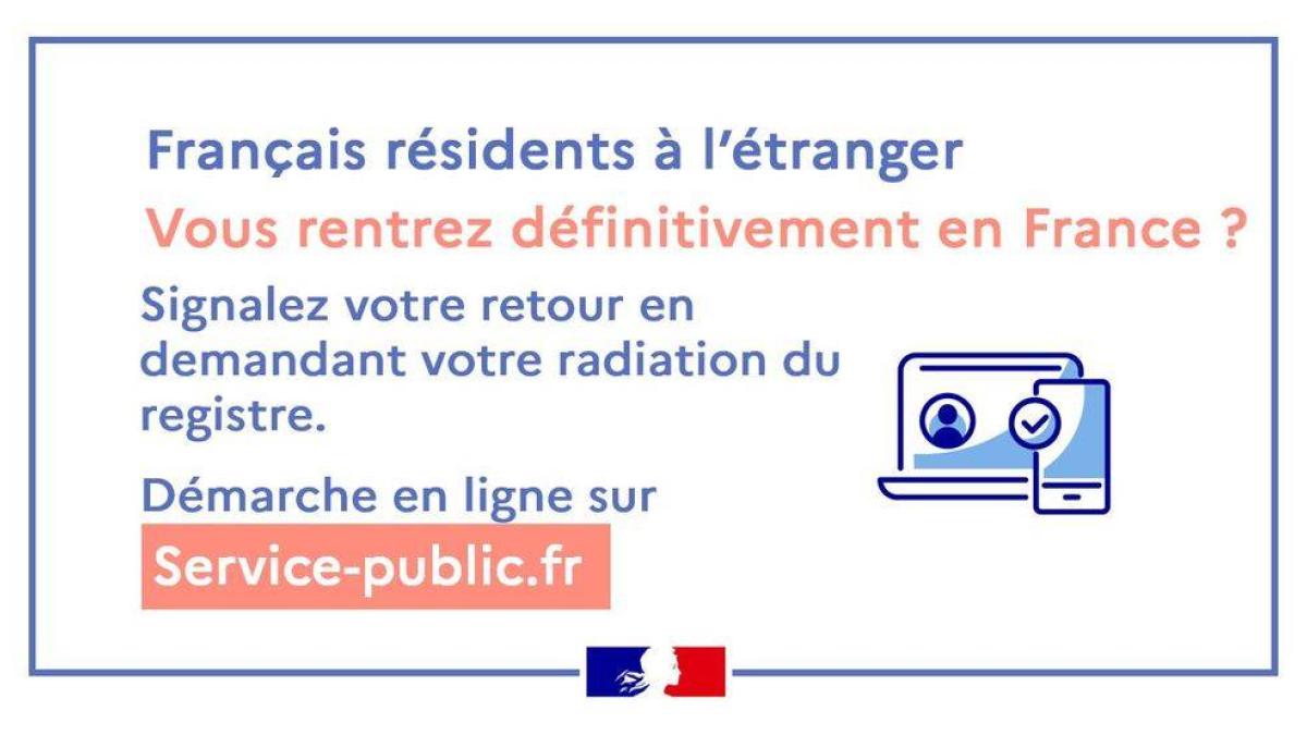 Démarches utiles avant le retour Publié le : 21 mai 2025 Mis à jour le : 14 octobre 2025 Préparation d’un retour en France Signaler mon départ au consulat Au moment de quitter votre pays de résidence, vous devez demander votre radiation du registre des Français auprès de votre consulat. Cette démarche peut se faire en ligne sur service-public.fr. Vous pourrez alors imprimer votre certificat de radiation. Vous pouvez également solliciter une attestation de changement de résidence pour faciliter les formalités douanières concernant votre déménagement. Attention, si vous aviez choisi de vous inscrire sur la liste électorale de votre poste consulaire de rattachement, veuillez noter que votre radiation du registre des Français n’entrainera pas votre radiation de cette même liste électorale. Seule l’inscription sur la liste électorale de votre nouvelle commune de résidence déclenchera votre radiation de la liste électorale consulaire. En cas de difficultés pour la démarche, découvre notre tutoriel en vidéo M’assurer que mes documents d’état civil sont à jour Vérifiez que les événements familiaux survenus pendant votre séjour (naissance, mariage) ont bien été transcrits sur les registres d’état civil de l’ambassade ou du consulat territorialement compétent. En cas de divorce, une mention devra être apposée sur votre acte de naissance et votre acte de mariage. Si le divorce a été prononcé à l’étranger, il doit faire l’objet d’une vérification d’opposabilité du procureur de la République dont dépend l’officier d’état civil qui a célébré le mariage pour les mariages célébrés en France, et du procureur de la République près le tribunal de grande instance de Nantes pour les mariages célébrés à l’étranger. Dans certaines conditions, les divorces prononcés dans un pays de l’Union européenne (à l’exception du Danemark) sont dispensés de la procédure de vérification d’opposabilité de la décision. Signaler mon changement d’adresse aux services postaux locaux Certains organismes (banque, par exemple) ou institutions administratives locales peuvent avoir besoin de vous contacter après votre départ du pays. Il est donc conseillé de signaler votre départ à la poste locale ainsi qu’aux institutions administratives pertinentes (services fiscaux, registre de population le cas échéant). Avoir en ma possession tous les documents qui pourront m’être utiles en France Il est souvent difficile d’obtenir certains justificatifs d’institutions étrangères, à distance, une fois rentré en France. Vous devez donc veiller à les obtenir avant votre départ et les garder soigneusement pendant votre déménagement. Pensez notamment à conserver vos contrats et certificats de travail, vos bulletins de salaire ainsi que vos avis d’imposition locaux. Si vous revenez d’un pays de l’Union européenne ou d’un pays ayant signé une convention de sécurité sociale avec la France, demandez également auprès des organismes de protection sociale de votre pays de résidence, les formulaires qui attesteront de la portabilité de vos droits. Si la loi locale le permet, il peut être utile de demander une copie de vos dossiers médicaux. Il est indispensable de conserver la liste des vaccinations obligatoires reçues par vos enfants mineurs.