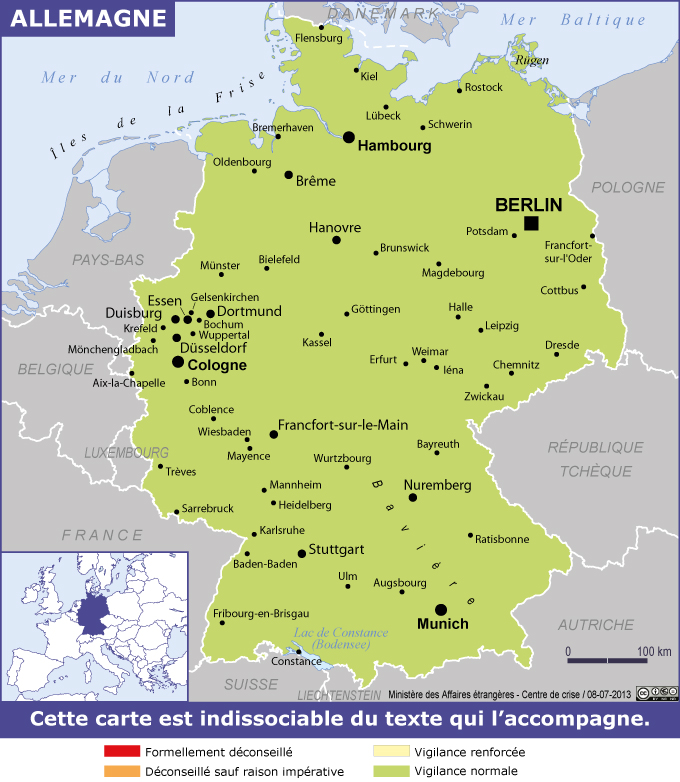 Allemagne Navigation latérale fiche pays Dans cette rubrique Allemagne Présentation de l'Allemagne Conseils aux voyageurs Dernières minutes et alertes Sécurité Entrée / séjour Santé Informations utiles Voyages d'affaires Contacts utiles Politique et économie Relations bilatérales Sécurité Date de mise à jour le : 27 mars 2026 Information toujours valable à la date du jour Imprimer Imprimer Vous voyagez à l'étranger ? Pour recevoir des alertes, inscrivez-vous sur Fil d'Ariane. S'inscrire sur Fil d'Ariane Donnez-nous votre avis Aidez-nous à améliorer notre service en répondant à notre enquête. Répondre à l'enquête utilisateurs Fermer Vérifiez que vous êtes bien assurés Avant de voyager, il est indispensable de vérifier que vous êtes bien assuré Quelle est la portée des Conseils aux Voyageurs ? Zones de vigilance Dernière actualisation le 18/03/2026, information toujours valable à la date du jour Le territoire allemand est placé en vigilance normale. Risques encourus et recommandations associées Terrorisme Il est recommandé de ne pas laisser de bagages sans surveillance, de signaler tout comportement ou objet suspect, de faire preuve de prudence dans les lieux publics et d’exercer une vigilance accrue lors d’événements sportifs ou de participation à des manifestations ou rassemblements sur la voie publique. Délinquance La petite délinquance (vols à la tire, vols par ruse) se développe dans les zones touristiques, les grandes villes, les grands aéroports, les gares centrales et les grands rassemblements festifs (événements sportifs, festivals, Oktoberfest…) Recommandations générales Il est recommandé d’éviter de transporter sur soi tous ses documents d’identité et moyens de paiement et de privilégier les distributeurs automatiques de billets situés à l’intérieur d’établissements bancaires ou de galeries commerciales plutôt que les distributeurs situés sur la voie publique. Liste des représentations françaises Ambassade de France en Allemagne Pariser Platz 5 10117 Berlin Allemagne Tel : +49 30 915 880 60 Ambassade de France en Allemagne Réseaux sociaux Facebook X Youtube Consulat général de France à Düsseldorf Martin Luther Platz 26 40212 Düsseldorf Allemagne Tel : +49 21 173748024 Consulat général de France à Düsseldorf Réseaux sociaux Facebook Consulat général de France à Francfort Hamburger Allee 26-28 (8ème étage) 60486 Francfort-sur-le-Main Allemagne Tel : +49 69 86798060 Consulat général de France à Francfort Réseaux sociaux Facebook Consulat général de France à Hambourg Heimhuder Strasse 55 20148 Hambourg Allemagne Tel : +49 40 34978100 Consulat général de France à Hambourg Réseaux sociaux Facebook Consulat général de France à Munich Heimeranstrasse 31 80339 Munich Allemagne Tel : +49 89 23128051 Consulat général de France à Munich Réseaux sociaux Facebook X Consulat général de France à Sarrebruck Am Ludwigsplatz 10 66117 Sarrebruck Allemagne Tel : +49 68 121 368 010 Consulat général de France à Sarrebruck Consulat général de France à Stuttgart Schloßstrasse 51 70174 Stuttgart Allemagne Tel : +49 71 121768016 Consulat général de France à Stuttgart Réseaux sociaux Facebook Section consulaire de l’Ambassade de France à Berlin Pariser Platz 5 10117 Berlin Allemagne Tel : +49 30 91588060 Ambassade de France en Allemagne Réseaux sociaux Facebook X Youtube