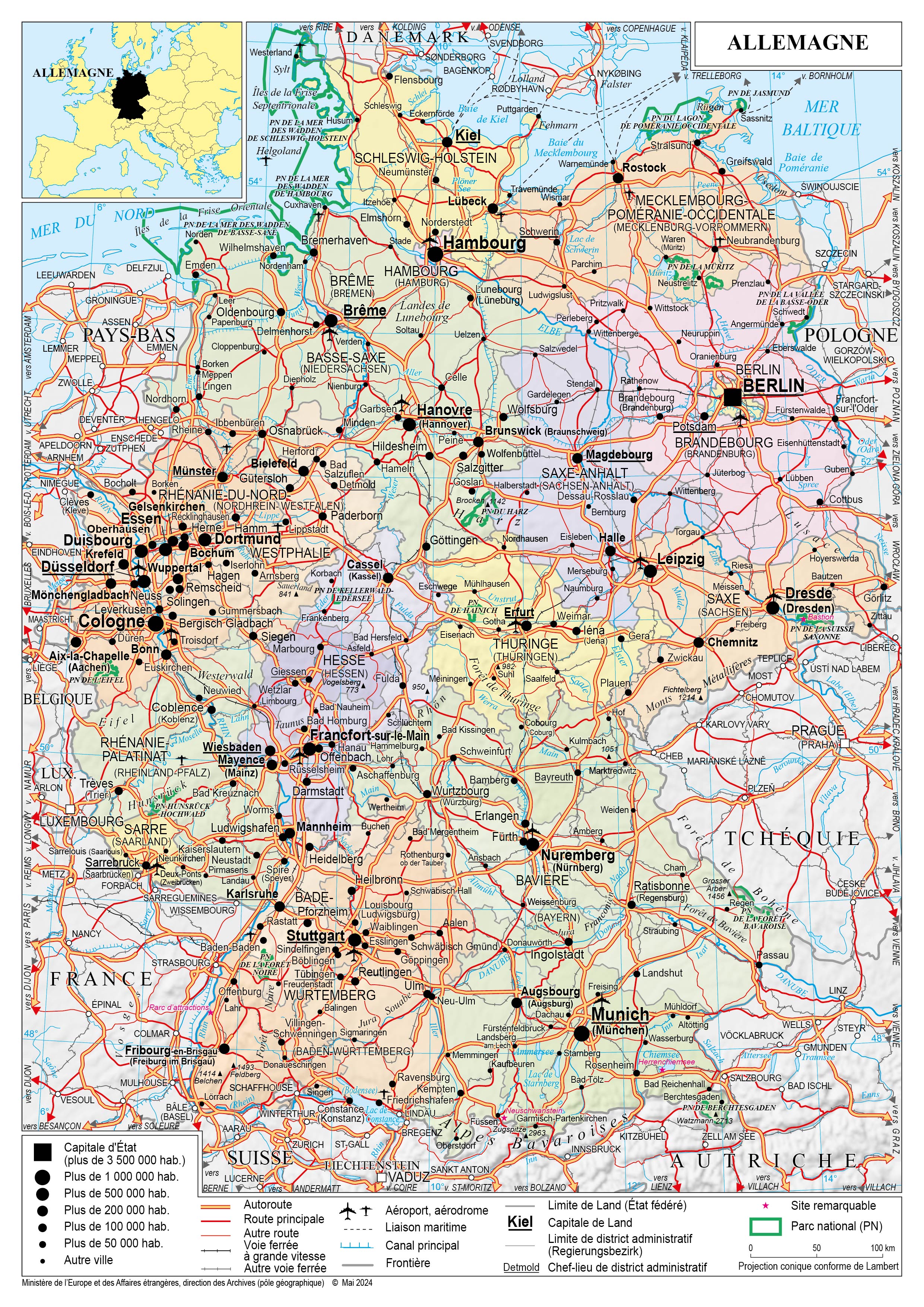 Allemagne Navigation latérale fiche pays Dans cette rubrique Allemagne Présentation de l'Allemagne Conseils aux voyageurs Dernières minutes et alertes Sécurité Entrée / séjour Santé Informations utiles Voyages d'affaires Contacts utiles Politique et économie Relations bilatérales Présentation de l'Allemagne Date de mise à jour le : 30 janvier 2026 Information toujours valable à la date du jour Présentation du pays Données générales Nom officiel : République fédérale d’AllemagneNature du régime : État fédéral - démocratie parlementaireChef de l’État : Frank-Walter Steinmeier Chef du gouvernement : Friedrich Merz Données géographiques Superficie : 357 027 km²Capitale : BerlinVilles principales : Hambourg, Munich, Cologne, Francfort-sur-le-Main, Stuttgart, Düsseldorf, Dortmund, Essen, Brême, Dresde, Leipzig, Hanovre, Nuremberg Langue officielle : allemandMonnaie : euroFête nationale : 3 octobre (jour de l’Unité allemande) Données démographiques Population (2025) : 84,6 millions d’habitants Croissance de la population (2023) : -0,08% Taux de fécondité (2024) : 1,35Espérance de vie à la naissance (2023) : 83 ans pour les femmes ; 78,3 ans pour les hommesReligions (2024) : catholicisme (23,7%), protestantisme (21,5%), Islam (3,9%)Indice de développement humain (classement ONU, 2022) : 0,947Solde migratoire (2023) : 1,9 millions d’immigrants ; 1,2 millions d’émigrantsPopulation étrangère (2023) : 13,9 millions d’habitants Politique intérieure Les fonctions de Président fédéral sont exercées par Frank-Walter Steinmeier (SPD). Ce dernier a été reconduit à ce poste en 2022 pour une durée de 5 ans. A l’issue des élections fédérales du 23 février 2025, l’alliance de la CDU et de la CSU bavaroise, conduite par Friedrich Merz a remporté 28,5% des voix, suivie de l’AfD (extrême-droite, 20,8%), du SPD (16.5%), des Verts (11,7%) et de Die Linke (extrême-gauche, 8,8%) tandis que les libéraux du FDP et le BSW de Sahra Wagenknecht n’ont pas franchi le seuil électoral de 5%. La majorité qui pourrait émerger demeure étroite (328 sièges), l’AfD disposant avec Die Linke d’une minorité de blocage constitutionnelle (un tiers des sièges) dans le nouveau Bundestag constitué le 25 mars. Le contrat de coalition qui a été présenté le 9 avril 2025, s’articule autour de trois objectifs : un renforcement de la compétitivité de l’économie allemande, un nouveau cap en matière de politique migratoire et de sécurité intérieure ainsi qu’un renforcement de la sécurité extérieure. Il a été formellement signé par la CDU/CSU et le SPD le 5 mai 2025. Lors du second vote au Bundestag le mardi 6 mai Friedrich Merz a été élu chancelier à la majorité absolue des suffrages avec 325 voix pour (la majorité étant fixée à 316 voix). Après la nomination par le président fédéral, il a prêté serment, tout comme son gouvernement. Friedrich Merz a prononcé sa première intervention en tant que chancelier devant le Bundestag, le 14 mai. Ce discours de politique générale a été l’occasion, pour le nouveau chancelier, de présenter les priorités de son gouvernement, articulées autour de trois mots d’ordre : liberté, prospérité et cohésion sociale. Au niveau des 16 Länder, seuls les chrétiens-démocrates de la CDU/CSU (centre-droit) et les sociaux-démocrates du SPD (centre-gauche) sont présents dans tous les parlements régionaux. Les gouvernements régionaux sont représentés au niveau fédéral par le Bundesrat. Le SPD, la CDU/CSU et les Verts y possèdent chacun une vingtaine de sièges sur 69. Le parti d’extrême-droite AfD n’y siège pas, les autres partis ayant toujours refusé de construire une coalition de gouvernement avec lui. Au Bundesrat, chaque Land siège séparément, il n’y a donc pas de groupe parlementaire dans cette assemblée. Tous les Länder sont dirigés par des gouvernements de coalition, à l’exception de la Sarre où le SPD gouverne seul. Politique étrangère 1 - Attachement au cadre multilatéral Le poids de l’histoire explique l’attachement allemand au cadre multilatéral et européen. L’Allemagne est le 4e contributeur au budget annuel de l’ONU (soit un peu plus de 6% du budget de l’organisation). L’Allemagne soutient une réforme du Conseil de de Sécurité des Nations Unies afin d’en élargir la composition : elle revendique officiellement une place de membre permanent depuis 2005 aux côtés du Brésil, de l’Inde et du Japon, et s’est par ailleurs portée candidate à un siège non permanent en 2027-2028. L’Allemagne soutient de manière constante l’intégration européenne (Ukraine, Moldavie, Balkans occidentaux). Comme la France, l’Allemagne souhaite mener en parallèle la réforme de l’UE et son élargissement. En matière de défense, l’OTAN occupe une position centrale dans la politique de sécurité allemande, dont l’Allemagne a réaffirmé le caractère capital depuis le déclenchement de l’agression russe contre l’Ukraine en 2022. 2 - Une diplomatie ouverte sur le mondeEn 2023, l’Allemagne était le 2e contributeur mondial en matière d’aide au développement (près de 37 milliards d’euros), dépassant l’objectif fixé par l’OCDE d’y consacrer 0,7 % de son revenu national brut (RNB) avec 0,82 %. En janvier de cette même année, elle présentait une nouvelle politique de développement en Afrique intitulée « Respect et réciprocité ». L’Allemagne co-préside également le « Compact with Africa », lancé au G20 de Hambourg en 2017, qui a pour objectif de soutenir le développement économique du continent par l’investissement privé. Grand pays exportateur, l’Allemagne promeut l’ouverture commerciale de l’UE et est favorable à la conclusion d’accords commerciaux durables. Par ailleurs, la diplomatie allemande est très attachée à la promotion des droits de l’Homme et s’engage activem