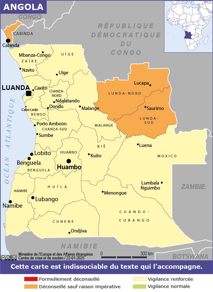 Angola Navigation latérale fiche pays Dans cette rubrique Angola Présentation de l'Angola Conseils aux voyageurs Dernières minutes et alertes Sécurité Entrée / séjour Santé Informations utiles Voyages d'affaires Contacts utiles Politique et économie Relations bilatérales Sécurité Date de mise à jour le : 01 avril 2026 Information toujours valable à la date du jour Imprimer Imprimer Vous voyagez à l'étranger ? Pour recevoir des alertes, inscrivez-vous sur Fil d'Ariane. S'inscrire sur Fil d'Ariane Donnez-nous votre avis Aidez-nous à améliorer notre service en répondant à notre enquête. Répondre à l'enquête utilisateurs Fermer Vérifiez que vous êtes bien assurés Avant de voyager, il est indispensable de vérifier que vous êtes bien assuré Quelle est la portée des Conseils aux Voyageurs ? Zones de vigilance Dernière actualisation le 18/03/2026, information toujours valable à la date du jour Zones déconseillées sauf raison impérative (en orange) Lunda Sul et Lunda Norte Les déplacements dans les provinces diamantifères de Lunda Sul et Lunda Norte sont déconseillés, sauf pour raison impérative, du fait de la présence de trafiquants. En cas d’obligation de déplacement dans ces provinces, il convient de s’assurer au préalable qu’aucune restriction de circulation n’est émise par les autorités locales. Province et ville de Cabinda Les déplacements dans la ville de Cabinda et dans sa province, foyers d’insécurité potentiels, sont déconseillés sauf raison impérative. Le reste du pays est en vigilance renforcée (en jaune) Il convient néanmoins d’être vigilant à Luanda, en fin de journée, dans le secteur d’Ilha, très fréquenté pour ses restaurants et clubs de nuit. La nuit, il est également recommandé d’éviter les municipalités en périphérie de Luanda. Risques encourus et recommandations associées Délinquance et criminalité Compte tenu de la crise économique que traverse l’Angola, la criminalité et la délinquance restent élevées. Les actes de violence se font souvent sous la menace d’arme à feu ou d’armes blanches et ont pour objectif principal le vol d’opportunité d’argent ou d’objets de valeur (téléphones portables en particulier). Les expatriés et voyageurs étrangers ne sont pas spécifiquement pris pour cibles, la criminalité touchant d’abord les citoyens angolais résidant dans les quartiers populaires. La grande majorité des actes de délinquance ont lieu dans la périphérie de Luanda, cependant le centre-ville n’est pas épargné. Il convient ainsi de respecter les règles élémentaires de prudence et de vigilance : ne pas circuler à pied ; éviter de circuler de nuit en véhicule ; s’assurer de la sécurisation des hébergements ; se renseigner préalablement à tout déplacement ; en cas d’agression, n’opposer aucune résistance. Il convient également d’être particulièrement vigilant lors de retrait ou dépôt d’argent dans les agences bancaires. Manifestations et rassemblements Des appels à manifester sont lancés régulièrement par différents groupes (partis politiques, associations, organisations étudiantes…) à Luanda, mais également dans les grandes villes de province. Dans un contexte de tensions croissantes en amont des prochaines élections (août 2027), et compte tenu des violences survenues lors de certaines manifestations (des dizaines de morts en juillet 2025), il est recommandé de faire preuve de la plus grande vigilance, et de rester à l’écart de tout attroupement. Risques naturels Durant la saison des pluies (octobre à mai), la plus grande vigilance est recommandée, en raison des phénomènes de pluies diluviennes, particulièrement dans les régions situées au nord et à l’est du pays. Ces pluies provoquent des inondations importantes et causent des dégâts sur le réseau routier. Il est déconseillé de circuler en voiture ou à pied pendant ces épisodes. Risques liés aux transports En raison de l’état dégradé du réseau routier et de la conduite dangereuse de la plupart des automobilistes, les déplacements en véhicules peuvent être dangereux. Ils doivent toujours être effectués de jour. En raison du nombre élevé d’accidents, il est déconseillé d’emprunter les transports collectifs. La présence de mines dans certains secteurs en dehors des grands axes et des principales villes est possible. Ces zones sont la plupart du temps identifiées par une signalétique adaptée. Recommandations générales Il est recommandé de : ne pas se déplacer avec des objets de valeur et d’importantes sommes d’argent ; circuler en voiture vitres fermées et portes verrouillées ; ne pas sortir des axes routiers importants et ne pas conduire de nuit ; ne pas circuler seul(e) et à pied, y compris en centre-ville ; ne pas utiliser les moyens de transport collectif locaux ; utiliser des compagnies de taxi sûres et identifiées (deux compagnies proposent à Luanda des applications qui permettent de commander des taxis par géolocalisation) ; ne pas stationner son véhicule dans des endroits peu fréquentés ou mal éclairés ; faire preuve de vigilance lors des retraits d’argent ; ne pas opposer de résistance en cas d’agression ; éviter les rassemblements. Liste des représentations françaises Ambassade de France en Angola 31/33 Rua Reverendo Pedro Neto BP 584 Luanda Angola Tel : +244 226 425 557 Ambassade de France en Angola Réseaux sociaux X Facebook