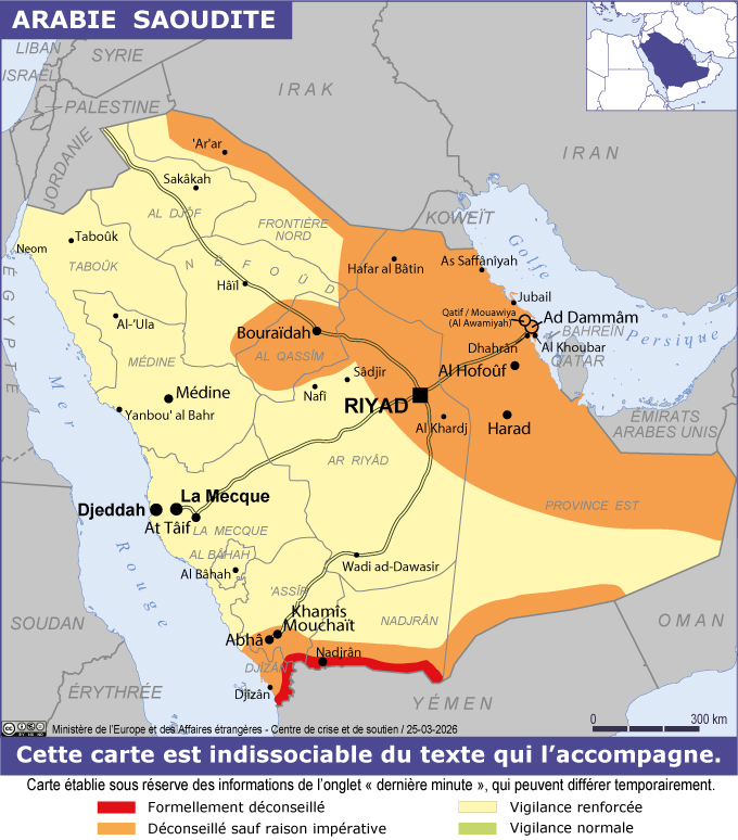 Arabie saoudite Navigation latérale fiche pays Dans cette rubrique Arabie saoudite Présentation de l'Arabie saoudite Conseils aux voyageurs Dernières minutes et alertes Sécurité Entrée / séjour Santé Informations utiles Voyages d'affaires Contacts utiles Politique et économie Relations bilatérales Sécurité Date de mise à jour le : 31 mars 2026 Information toujours valable à la date du jour Imprimer Imprimer Vous voyagez à l'étranger ? Pour recevoir des alertes, inscrivez-vous sur Fil d'Ariane. S'inscrire sur Fil d'Ariane Donnez-nous votre avis Aidez-nous à améliorer notre service en répondant à notre enquête. Répondre à l'enquête utilisateurs Fermer Vérifiez que vous êtes bien assurés Avant de voyager, il est indispensable de vérifier que vous êtes bien assuré Quelle est la portée des Conseils aux Voyageurs ? Zones de vigilance Dernière actualisation le 25/03/2026, information toujours valable à la date du jour Zones formellement déconseillées (en rouge sur la carte sécuritaire) La zone frontalière d’une vingtaine de kilomètres de profondeur dans les provinces du Najran, d’Assir et du Djizan. Compte tenu de la situation régionale, les zones ci-dessous sont déconseillées sauf raison impérative (en orange sur la carte sécuritaire) La ville et la province de Riyad. Les provinces orientales du pays. les régions de Kharj et de Shaybah. Zones déconseillées sauf raison impérative (en orange sur la carte sécuritaire) Les localités de Mouawiya (également appelée Al Awamiyah) et de Qatif (au nord de Ad Dammam). Cette zone a été le théâtre de troubles sérieux à l’ordre public. De nouveaux troubles demeurent possibles. La région d’Al Qassim, y compris la ville de Bouraïdah. Cette région a été le théâtre d’attaques terroristes visant les forces de sécurité saoudiennes ces dernières années. L’ensemble de la zone frontalière avec l’Irak. Compte tenu de l’instabilité sécuritaire en Irak (pays formellement déconseillé), il est recommandé de limiter les déplacements dans cette zone frontalière aux raisons impératives. L’ensemble de la zone frontalière avec le Yémen sur une profondeur d’une centaine de kilomètres et englobant les villes de Khamis Mouchaït et d’Abha. Compte tenu du conflit au Yémen et de la possible reprise de tirs de missiles et de drones vers le territoire saoudien en raison du non renouvellement de la trêve le 2 octobre 2022, il est recommandé de limiter les déplacements dans cette zone aux motifs impérieux. Le reste du territoire est en vigilance renforcée (en jaune sur la carte sécuritaire) Risques encourus et recommandations associées Risque terroriste Le risque terroriste reste présent en Arabie saoudite. Les ressortissants français sont appelés à faire preuve de la vigilance maximale. Des arrestations, des saisies d’armes et de munitions sont régulièrement opérées par les autorités. Les intérêts étrangers, et notamment français, ont été la cible d’attaques en 2020 et 2021 et font l’objet de menaces terroristes réitérées. Le 30 décembre 2021 à Djeddah, un véhicule du Rallye Dakar 2022, occupé par un équipage de cinq Français, a été touché par une explosion, blessant grièvement le conducteur de la voiture. Le parquet national antiterroriste français, qui a ouvert une enquête préliminaire du chef de tentative d’assassinats en relation avec une entreprise terroriste, a conclu à un acte délibéré de pose d’un engin explosif improvisé. Le 29 octobre 2020, le consulat général de France à Djeddah a subi une agression au couteau qui a visé un vigile, employé d’une société de sécurité. La cérémonie annuelle commémorant la fin de la Première Guerre mondiale, organisée à Djeddah le 11 novembre 2020, a quant à elle été la cible d’une attaque à l’engin explosif causant des blessures sévères parmi les participants. Les Français qui se rendent en Arabie saoudite doivent prendre les mesures adéquates concernant leur sécurité personnelle et faire preuve de la vigilance maximale. Conflit au Yémen - risque d’attaque aérienne L’Arabie saoudite a subi, entre janvier 2015 et la fin mars 2022, plus d’un millier de tirs de missiles et de drones explosifs en provenance du Yémen qui visaient généralement des sites stratégiques. Ces tirs concentrés en premier lieu sur le sud du pays, frontalier avec le Yémen, ont également visé les grandes métropoles (Djeddah, Riyad, Dammam). Ils ont été en général interceptés par la défense antiaérienne saoudienne mais ces interceptions ont entraîné la chute de débris dangereux. Depuis la trêve conclue entre les parties en conflit au Yémen, sous l’égide des Nations Unies en mars 2022, les tirs de missiles ou de drones en direction du territoire saoudien se sont raréfiés. Pour autant, cette trêve n’a pas été officiellement renouvelée en octobre 2022. Depuis le 7 octobre 2023, des missiles et des drones sont ainsi tirés régulièrement par les Houthis depuis les massifs montagneux du Yémen afin de frapper le territoire israélien. Certains d’entre eux survolent le territoire saoudien. Il est à noter que des hostilités se poursuivent ponctuellement dans les zones frontalières avec le Yémen. Dans ce contexte, il reste recommandé de se tenir à l’écart des infrastructures sensibles et d’éviter de se rendre dans les zones frontalières avec le Yémen. En cas d’alerte, il convient de suivre les consignes suivantes : Rester à l’abri dans la zone la plus solide des bâtiments et le plus éloigné possible des vitres. Ne pas sortir, notamment pour filmer. Ne pas toucher aux éventuels débris à terre qui pourraient être très corrosifs. Situation régionale La montée des tensions régionales peut avoir des répercussions sur la situation en Arabie Saoudite. L’évolution de la situation dans la région doit faire l’objet d’une attentio