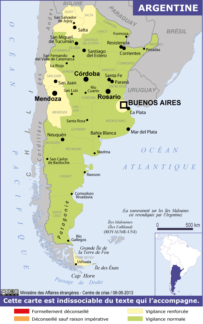 Argentine Navigation latérale fiche pays Dans cette rubrique Argentine Présentation de l'Argentine Conseils aux voyageurs Dernières minutes et alertes Sécurité Entrée / séjour Santé Informations utiles Voyages d'affaires Contacts utiles Politique et économie Relations bilatérales Sécurité Date de mise à jour le : 15 avril 2026 Information toujours valable à la date du jour Imprimer Imprimer Vous voyagez à l'étranger ? Pour recevoir des alertes, inscrivez-vous sur Fil d'Ariane. S'inscrire sur Fil d'Ariane Donnez-nous votre avis Aidez-nous à améliorer notre service en répondant à notre enquête. Répondre à l'enquête utilisateurs Fermer Vérifiez que vous êtes bien assurés Avant de voyager, il est indispensable de vérifier que vous êtes bien assuré Quelle est la portée des Conseils aux Voyageurs ? Zones de vigilance Dernière actualisation le 04/03/2026, information toujours valable à la date du jour Buenos Aires A Buenos Aires, la vigilance s’impose dans l’ensemble des quartiers, et notamment dans les zones les plus touristiques. Une attention particulière est recommandée dans les quartiers résidentiels (Recoleta, Puerto Madero, Palermo et Belgrano) et dans les quartiers populaires, notamment La Boca, où il est très vivement déconseillé de s’éloigner du Caminito, notamment les jours de match de football. De même, la rue Florida et le quartier de San Telmo, très fréquentés par les touristes, attirent nombre de voleurs à la tire. Plusieurs agressions violentes (avec arme à feu ou à l’arme blanche) y ont été signalées. La nuit, la proximité des gares de Constitucion (lieu de prostitution) et de Retiro (voisine du Barrio 31) est fortement déconseillée. De jour, il est conseillé d’y être extrêmement vigilant. Enfin, il est fortement recommandé de ne pas s’aventurer dans les bidonvilles ou « villas miserias » de Buenos Aires. La ville de Buenos Aires a mis en place un organisme chargé d’assister et d’orienter les touristes étrangers. Cet organisme, [es]Defensoria del Turista, dispose de plusieurs points de contact dans la capitale. Córdoba Il convient de redoubler de vigilance à Córdoba. Depuis peu, le centre-ville est le théâtre de nombreux vols à la détourne ou à la tire (parfois avec agression). Mendoza A Mendoza, la gare routière est le théâtre de nombreux vols à la tire.Il est conseillé d’éviter de se promener de nuit dans le grand parc de la ville en dehors des voies éclairées (Parque General San Martin).Plusieurs touristes isolés, circulant à vélo sur la route des vins, ont été agressés dans la zone rurale de Maipu. La Province de Mendoza est dotée, depuis 2008, d’une unité de police chargée de l’assistance aux touristes étrangers. En cas de problème, il est conseillé de la contacter via le 911 ou au numéro spécial de cette unité : +0261 413.21.35. Rosario La recrudescence du trafic et de la consommation de drogues est marquée à Rosario. Elle a pour conséquence une augmentation des agressions violentes et une dégradation de la situation sécuritaire dans cette ville. Chutes d’Iguazu Les voyageurs se rendant dans la région très touristique des chutes d’Iguazu devront être vigilants lors de leur séjour dans la partie brésilienne. Les vols y sont fréquents. Il est fortement recommandé aux touristes circulant par leurs propres moyens de ne pas passer la frontière de nuit en direction du Brésil ou du Paraguay avec des taxis ou des "remises" locales. Région d’El Bolson Plusieurs vols, parfois avec violence, ont été signalés dans la région d’El Bolson (Province de Rio Negro). La plus grande vigilance est recommandée aux voyageurs. Risques encourus et recommandations associées Criminalité Délinquance L’insécurité existe en Argentine, en particulier dans la capitale et les grands centres urbains. Aucun quartier n’est épargné : même les zones résidentielles sont affectées. La petite et moyenne délinquance est fréquente, notamment à Buenos Aires, à Mendoza, Rosario et Córdoba : petite escroquerie, vols parfois avec violence, agressions à la scopolamine (ou drogue du violeur). Il est conseillé de prendre garde à l’usage délictueux de cette drogue appelée localement « burundanga ». Mélangée à une boisson, des aliments, ou inhalée (par exemple sur un mouchoir), elle cause une perte de volonté, de conscience et une amnésie temporaire. À fortes doses, l’intoxication peut être mortelle. Des agressions ont été signalées à Buenos Aires, où des chauffeurs de taxis utilisent un spray pour vaporiser de la scopolamine sur le passager pour ensuite le voler. Il convient d’être vigilant, en particulier dans les zones touristiques où les agressions sont de plus en plus fréquentes et violentes (vols avec menaces d’usage d’armes à feu). Il est recommandé de respecter quelques règles simples de prudence (voir la rubrique "Recommandations générales" ci-dessous). Agressions Une recrudescence d’attaques accompagnée d’une administration de drogue ou d’anesthésiant est observée à Buenos Aires, rendant les victimes vulnérables et influençables. Les criminels droguent les victimes en introduisant le produit dans des boissons ou aliments, puis dérobent les objets de valeurs des victimes. Les voleurs s’invitent parfois au domicile des personnes, inconscientes du danger du fait de l’effet incapacitant des drogues. Le « réveil » intervient plusieurs dizaines d’heures plus tard et la victime ne se souvient plus de rien. Elles peuvent également avoir été victimes d’agressions physiques plus graves. Si la dose est trop forte, la drogue peut être mortelle. Il convient d’être extrêmement vigilant lorsque des inconnus s’approchent pour proposer de l’aide ou un prospectus, et de ne jamais quitter son verre des yeux, particulièrement dans les lieux festifs. En cas d’agression, il convient de se rendre imm