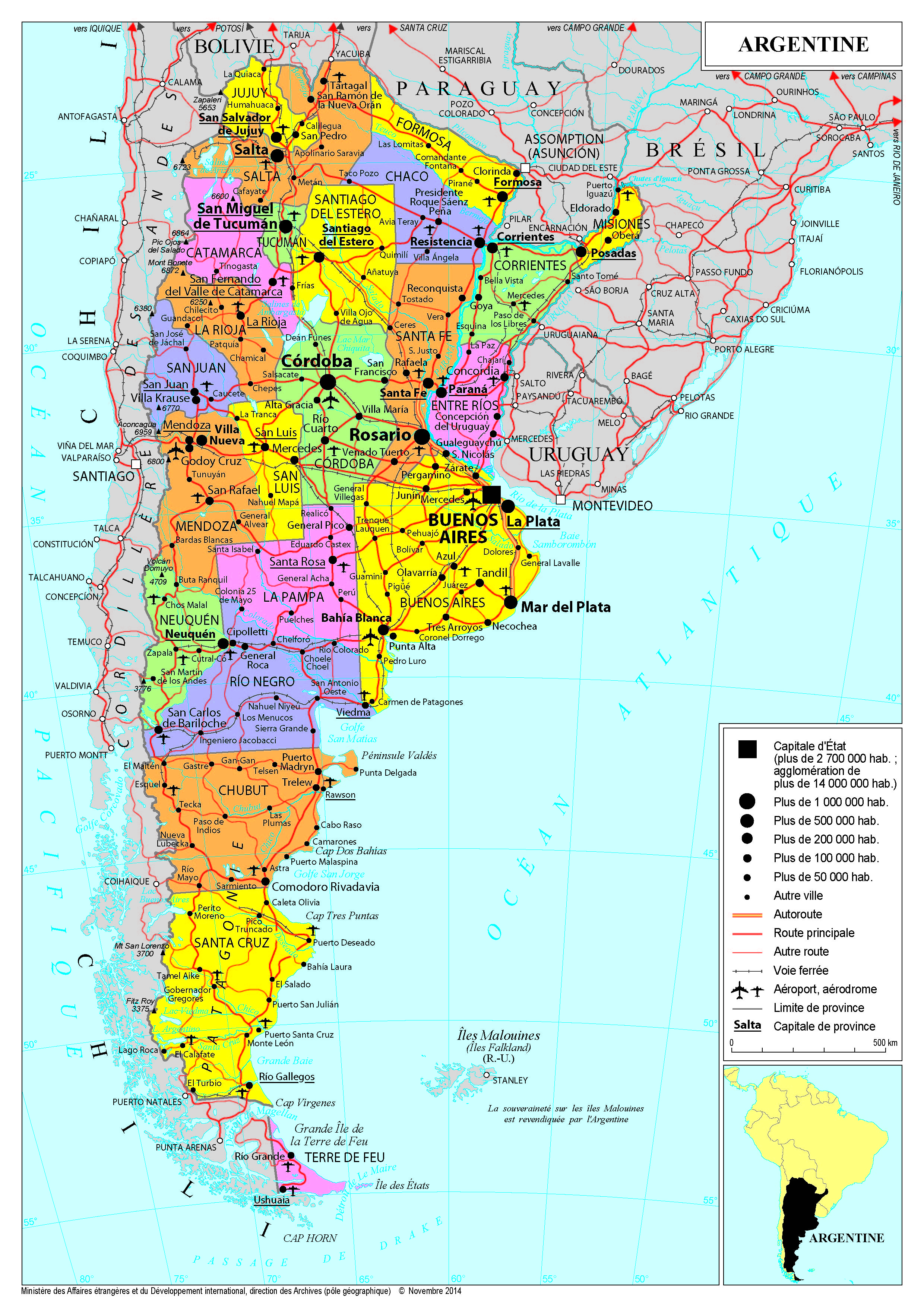 Argentine Navigation latérale fiche pays Dans cette rubrique Argentine Présentation de l'Argentine Conseils aux voyageurs Dernières minutes et alertes Sécurité Entrée / séjour Santé Informations utiles Voyages d'affaires Contacts utiles Politique et économie Relations bilatérales Présentation de l'Argentine Date de mise à jour le : 16 avril 2026 Information toujours valable à la date du jour Présentation du pays Données générales Nom officiel : République argentineNature du régime : République fédéraleChef de l’État : M. Javier Gerardo Milei (depuis le 10 décembre 2023) Données géographiques Superficie : 2,7 millions km² (8ème rang mondial)Capitale : Buenos Aires (3 millions d’habitants, 13 millions avec la grande banlieue)Villes principales : Córdoba, district de La Matanza, Rosario, Mendoza, La PlataLangue (s) officielle (s) : espagnolMonnaie : peso argentin (1 euro = 1,712.92 peso argentin, janvier 2026) Fête nationale : 25 mai (proclamation de l’indépendance le 25 mai 1810, définitivement acquise le 9 juillet 1816). Données démographiques Population : 47,6 millions d’hab. (FMI, 2025)Espérance de vie : 74.6 ans (OMS, 2021)Taux d’alphabétisation : 99 % (PNUD, 2023)Religion(s) : catholicisme 62,9 %, protestantisme/évangélisme 15,3 %, témoins de Jehovah et église de Jésus Christ 1.4%, autres 1.2 % (dont islam et judaïsme), sans religion (dont agnosticisme et athéisme) 18.9%, non spécifié 0.3% (CIA, 2019)Indice de développement humain (PNUD 2023) : 47/193 (0,865). Politique intérieure Javier Milei a remporté l’élection présidentielle de novembre 2023, avec 55,65% des suffrages. Ce dernier s’était fait connaître sur les plateaux de télévision comme chroniqueur économique avant d’entrer en politique en 2021, il a bénéficié de la lassitude des Argentins face au gouvernement péroniste précédent, marqué par ses divisions internes, les scandales de corruption et les déboires économiques. La première année de mandat a été marquée par la dévaluation de plus de 50% du peso dès son arrivée au pouvoir, la baisse de l’inflation (divisée par six par rapport à 2023) ainsi que la maîtrise des déficits publics (excédent budgétaire de 357 M USD en un an de gestion). En 2025, la priorité absolue donnée à la lutte contre l’inflation, par le soutien au peso face au dollar, a épuisé les réserves de change malgré un nouvel appui du FMI en avril. Afin de stabiliser le peso, le gouvernement américain a annoncé, début octobre 2025, un mécanisme de soutien financier à l’Argentine (paquet financier de 40 Mds USD accompagné d’achats d’obligations en dollars émises par l’Argentine). Ce soutien était toutefois explicitement conditionné à une victoire du parti présidentiel aux élections législatives de mi-mandat. Le parti du président Milei a largement remporté les élections législatives et sénatoriales du 26 octobre 2025, avec plus de 40% des suffrages, soit 10 points devant l’opposition péroniste. Obtenant dans les deux chambres nettement plus que le seuil du tiers des sièges nécessaire pour « sécuriser » les vetos présidentiels face aux propositions de loi de l’opposition, le camp miléiste poursuit des réformes d’ampleur, notamment sur la fiscalité et sur le marché du travail. Le Parlement a ainsi approuvé, le 26 décembre 2025, le premier budget en deux ans de présidence de Javier Milei. Politique étrangère L’arrivée au pouvoir du président libertarien Javier Milei a entraîné une redéfinition de la politique étrangère argentine, et un alignement sur les États-Unis et Israël. Souhaitant se démarquer de son prédécesseur péroniste, le président J. Milei a ainsi décidé que l’Argentine n’intègrerait pas les BRICS. Cette volonté de rapprochement avec Washington s’illustre également par la candidature argentine à l’OCDE et la volonté de devenir un « partenaire global » de l’OTAN. La victoire du candidat républicain a été interprétée par le président argentin comme une confirmation d'une "dynamique électorale et idéologique favorable à la droite radicale et libertarienne" non seulement dans les Amériques mais aussi sur d'autres continents. Sur le plan régional, cet alignement « occidental » se traduit par une critique ferme des régimes autoritaires latino-américains se réclamant de la gauche bolivarienne (Cuba, Nicaragua), et en particulier du régime chaviste au Venezuela. Depuis le début de l’invasion russe de l’Ukraine en février 2022, l’Argentine s’était toujours prononcée pour la défense des principes de souveraineté et d’intégrité territoriale de l’Ukraine. Il s’aligne désormais davantage sur la position des Etats-Unis depuis l’arrivée au pouvoir de Donald Trump. J. Milei prend ses distances avec le multilatéralisme et l’ONU, estimant que l’organisation remet en cause la souveraineté des États. Il a confirmé la décision de se dissocier du Pacte pour l’Avenir, considéré comme la continuation de l’Agenda 2030. L’annonce faite le 5 février 2025 par le président Javier Milei du retrait de l’Argentine de l’Organisation mondiale de la Santé (OMS) s’inscrit dans la cohérence des prises de position du président argentin vis-à-vis du multilatéralisme. L’adhésion de l’Argentine au Conseil de la paix créé par Donald Trump s’inscrit également dans ce contexte. Plus largement, le président argentin souhaite redéfinir la politique étrangère argentine autour de la défense du droit à la vie, à la liberté et à la propriété. Ainsi, le gouvernement est très favorable à la signature de l’accord UE-Mercosur – et plus généralement aux accords de libre-échange – et a exprimé ses réticences à toute régulation de l’intelligence artificielle. Situation économique Membre du G20 et du Mercosur, l’Argentine est la 3ème plus grande économie d’Amér