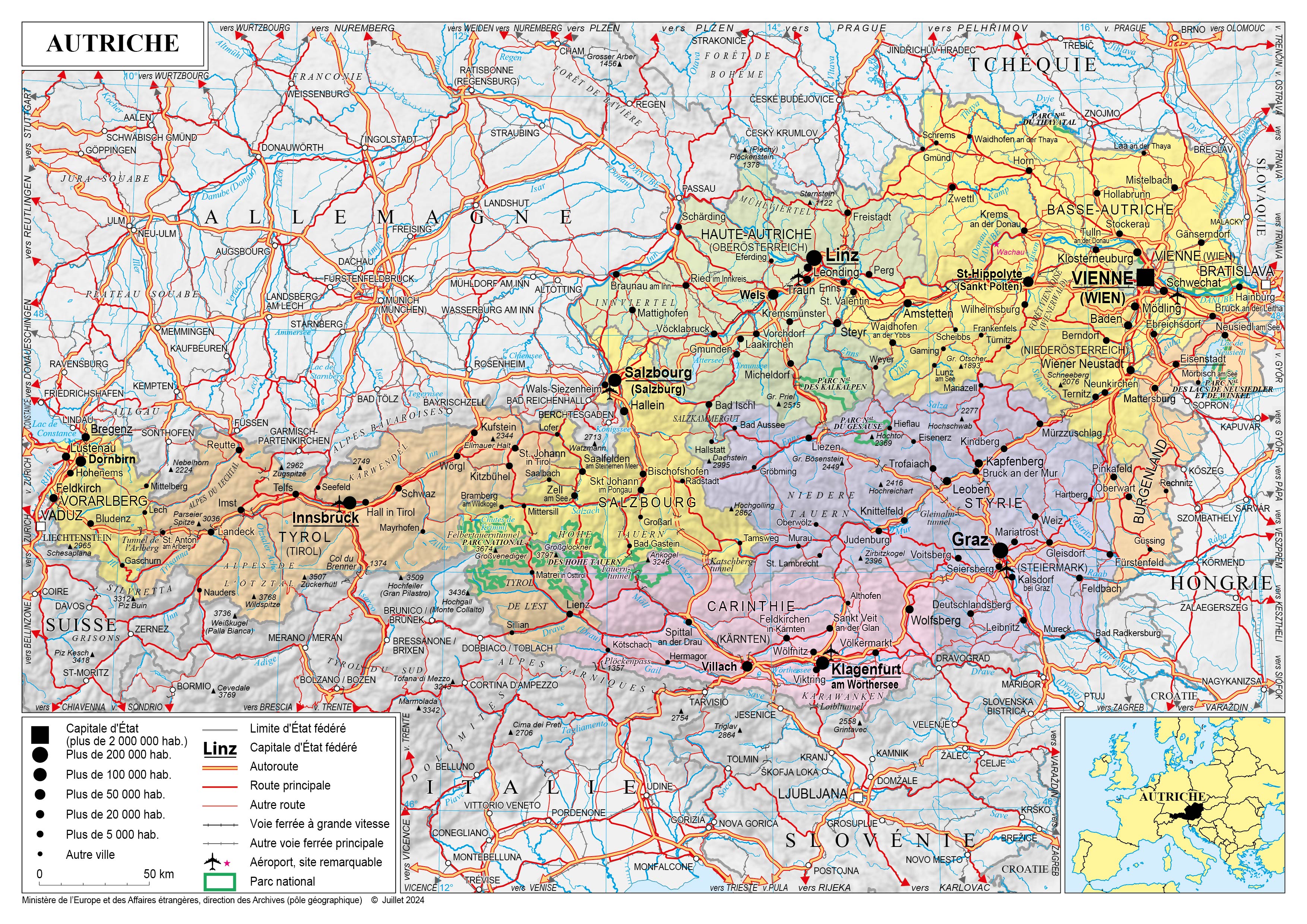 Autriche Navigation latérale fiche pays Dans cette rubrique Autriche Présentation de l'Autriche Conseils aux voyageurs Dernières minutes et alertes Sécurité Entrée / séjour Santé Informations utiles Voyages d'affaires Contacts utiles Politique et économie Relations bilatérales Présentation de l'Autriche Date de mise à jour le : 30 janvier 2026 Information toujours valable à la date du jour Présentation du pays Données générales Nom officiel : République d’AutricheNature du régime : parlementaireChef de l’Etat : M. Alexander VAN DER BELLEN (depuis le 26 janvier 2017, réélu pour 6 ans le 22 mai 2022)Chancelier (chef de gouvernement) : M. Karl NEHAMMER, investi le 6 décembre 2021 Données géographiques Superficie : 83 859 km²Capitale : VienneVilles principales : Graz, Linz, Salzbourg, InnsbruckLangue officielle : allemandMonnaie : euroFête nationale : 26 octobre Données démographiques Population : 9 106 126 (01/01/2023)Croissance démographique : + 0,96 % par an (2022)Espérance de vie : hommes 79,4 ans, femmes 84 ansTaux d’alphabétisation : 99 %Religions : catholiques romans 74% ; protestants 4,7% ; musulmans 4,2% ; autres 5,5%Minorités reconnues Croates, Slovènes, Serbes et Bosniaques représentant 4%, les Turcs environ 2%, les Allemands environ 1% et les autres ethnies environ 2%.Indice de développement humain (2021) : 0,916 Politique intérieure Après la démission le 9 octobre 2021 du Chancelier M. Alexander Kurz, mis en cause dans plusieurs affaires de corruption, puis un éphémère gouvernement dirigé par M. Alexander Schallenberg, M. Karl Nehammer est devenu chancelier fédéral le 6 décembre 2021, M. Schallenberg redevenant ministre des Affaires étrangères. La coalition au pouvoir est dominée par les conservateurs de l’ÖVP (dix ministères), tandis que les Verts n’occupent que quatre ministères, dont celui de vice-chancelier. La guerre en Ukraine a eu des conséquences sur la politique intérieure autrichienne et a entraîné un débat autour de son modèle de neutralité. 2024 est une année électorale importante en Autriche ; avec les élections européennes en juin et les élections législatives fin septembre. Le gouvernement ÖVP-Verts se maintient, malgré des dissensions au sein de la coalition (renouvellement de la loi climat, paquet anti-corruption). L’extrême-droite du FPÖ en profite largement, en étant crédité au niveau national de 26 à 28% de votes dans les sondages en mars 2024, ce qui en fait le premier parti autrichien devant le parti social-démocrate (SPÖ) et l’ÖVP (20 - 24% chacun), les libéraux de NEOS (11-15%), les Verts (9-13%), et les communistes (3%). 3 des 9 Länder sont désormais dirigés par des coalitions ÖVP-FPÖ. Cinq partis sont représentés au conseil national, l’extrême droite du FPÖ par 31 députés, l’ÖVP par 71, les libéraux de NEOS par 15, les sociaux-démocrates du SPÖ (Sozialdemokratische Partei Österreichs) par 40, et les Verts par 26. Les élections présidentielles qui ont eu lieu le 9 octobre 2022 ont conduit à la réélection avec 56,2% des suffrages du président fédéral M. Alexander van der Bellen (Vert), 78 ans, autorité morale du pays. L’ÖVP et le SPÖ se sont abstenus de présenter des candidatures concurrentes, ce qui a rendu possible sa victoire. Il a également été confronté à plusieurs candidatures se présentant comme « antisystème » : du FPÖ (17,9%), du Menschen Freiheit Grundrechte (MFG), parti sceptique des vaccins, et du Bierpartei (parti fantaisiste, qui attire principalement un électorat jeune). Lors des dernières élections régionales, les conservateurs de l’ÖVP sont arrivés en tête dans 6 Länder et les sociaux-démocrates du SPÖ dans 3. L’ÖVP gouverne en coalition avec les Verts dans le Voralberg, avec le SPÖ dans le Tyrol et en Styrie, et avec le parti de droite populiste FPÖ à Salzburg, en Haute et en Basse-Autriche. Le SPÖ gouverne en coalition avec NEOS à Vienne, avec l’ÖVP en Carinthie, et seul dans le Burgenland. Bien qu’ils conservent leurs premières places dans ces Länder, le SPÖ et l’ÖVP sont en baisse, à l’inverse du FPÖ, qui réalise des scores historiques, notamment dans le nord-ouest du pays (18,8% en Haute-Autriche, 24,2% en Basse-Autriche, et 25,8% dans le Land de Salzburg). Politique étrangère Questions européennes L’Autriche a rejoint l’UE le 1er janvier 1995, l’espace Schengen le 28 avril 1995, l’Union économique et monétaire le 1er janvier 1999. Les Autrichiens restent majoritairement attachés à leur appartenance européenne. L’Autriche a exercé 3 fois la Présidence du Conseil de l’Union européenne (1998, 2006, 2018). MigrationsFortement touchée en 2015 par la crise migratoire, l’Autriche donne à priorité à la protection des frontières extérieures mais elle s’oppose à des relocalisations obligatoires. Elle a proposé en 2022 la création d’une plateforme intergouvernementale ayant pour ambition de jouer le rôle de mécanisme d’alerte précoce pour lutter contre les migrations irrégulières dans les Balkans occidentaux. Elle s’est particulièrement investie dans les négociations sur la Pacte Asile et Migrations et a adopté une attitude très prudente sur l’extension de l’espace Schengen Balkans occidentauxUn des principaux objectifs de la diplomatie autrichienne en Europe est l’élargissement de l’UE aux 6 pays des Balkans occidentaux (Bosnie-Herzégovine, Kosovo, Macédoine du Nord, Monténégro Serbie, et Albanie), partenaires et voisins historiques de l’Autriche. L’Autriche a créé en avril 2023 un « groupe des amis des Balkans occidentaux » et souhaite qu’ils puissent être intégrés graduellement aux différentes politiques sectorielles de l’Union. L’Autriche participe à plusieurs formats régionaux, comme le format Slavkov avec la République tchèque et la Slovaquie ou le format C5 avec les mêmes pays, plus l