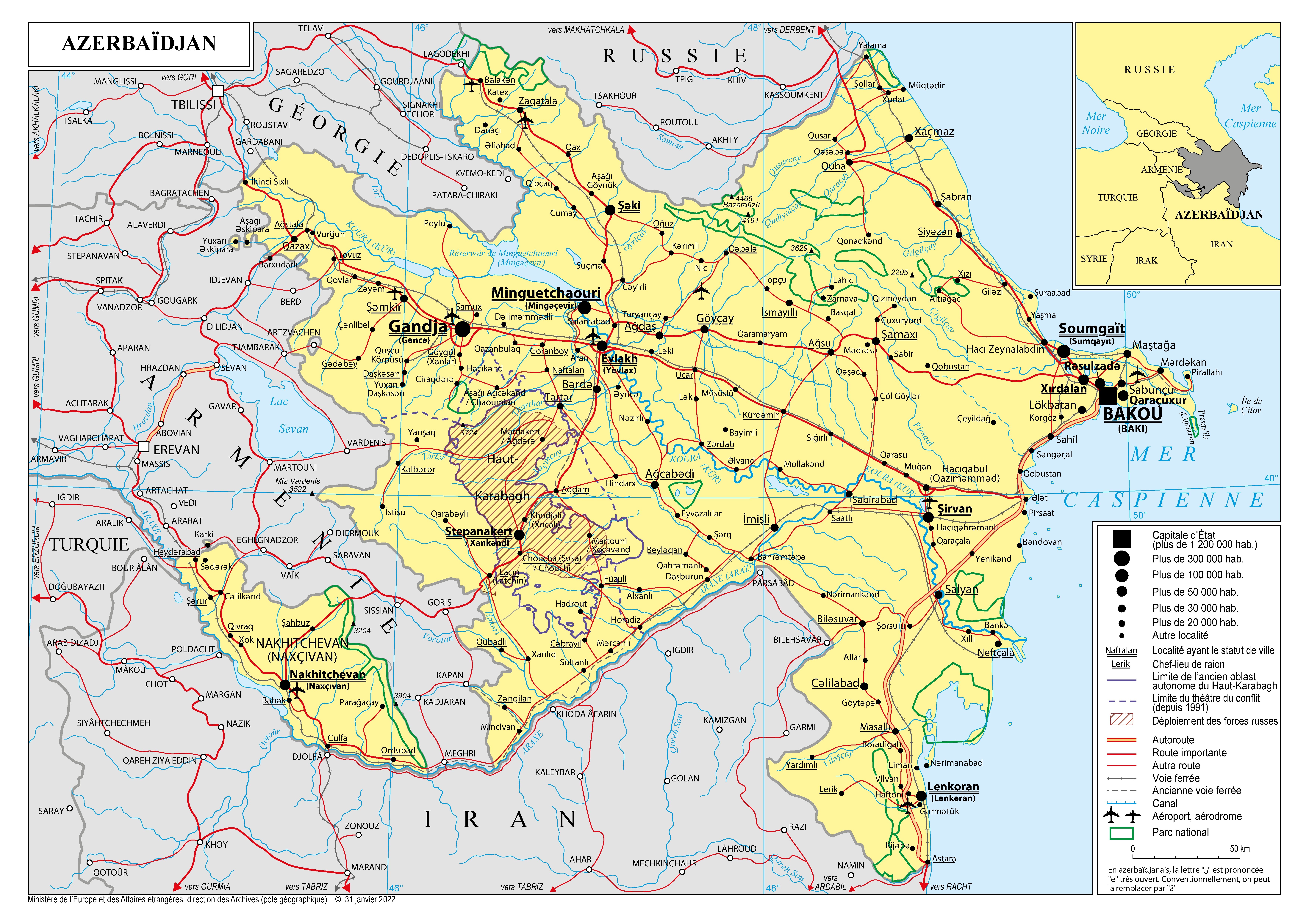Azerbaïdjan Navigation latérale fiche pays Dans cette rubrique Azerbaïdjan Présentation de l'Azerbaïdjan Conseils aux voyageurs Dernières minutes et alertes Sécurité Entrée / séjour Santé Informations utiles Voyages d'affaires Contacts utiles Politique et économie Relations bilatérales Présentation de l'Azerbaïdjan Date de mise à jour le : 30 janvier 2026 Information toujours valable à la date du jour Présentation du pays Données générales Nom officiel : République d’AzerbaïdjanNature du régime : République parlementaireChef de l’État : Président de la République : Ilham Aliyev (depuis 2003)Première vice-présidente de la République : Mehriban Aliyeva (depuis 2017) Données géographiques Superficie : 86 600 km²Capitale : BakouVilles principales : Soumgaït, Gandja, Lenkeran, ShekiLangue officielle : azerbaïdjanais ou azériMonnaie : manatFête nationale : 28 mai (déclaration d’Indépendance en 1918) Données démographiques Population (2021) : 10,3 millions d’habitantsTaux de croissance démographique (2021) : 1,39%Densité (2021) : 117 hab/km²Espérance de vie (2021) : 73,2Taux d’alphabétisation (2016) : 99,8%Religion(s) : musulmans (96%, dont chiites 65-70% et sunnites 30-35%), chrétiens et juifs (environ 4%).Indice de développement humain (2018) : 0,756 (88ème rang) Politique intérieure Ilham Aliyev, qui a succédé à son père Heydar Aliyev en 2003, a été réélu président de la République pour un 4ème mandat consécutif le 11 avril 2018, avec 86% des suffrages. Son mandat est de sept ans, en application de la réforme constitutionnelle approuvée par référendum le 26 septembre 2016 (90% de oui). Son épouse, Mehriban Aliyeva, a été confirmée dans son poste de première vice-présidente de la République, créé par la même révision constitutionnelle. Des élections législatives anticipées se sont tenues le 9 février 2020. Elles avaient été convoquées par le président Aliyev afin de renouveler la composition du Parlement en vue de mettre en œuvre les réformes économiques et sociales initiées par le Gouvernement après la crise économique de 2015-2017. Le parti présidentiel « Nouvel Azerbaïdjan » en est le grand vainqueur, remportant la majorité absolue des sièges. Selon le Bureau des institutions démocratiques et des droits de l’homme (BIDDH) de l’OSCE, la législation restrictive et l’environnement politique n’ont pas permis une véritable concurrence. Politique étrangère La politique étrangère azerbaïdjanaise est dominée par le dossier du conflit du Haut-Karabagh qui l’oppose à l’Arménie au sujet du sort de cette ancienne région autonome de l’Azerbaïdjan soviétique, dont une partie du territoire et les sept districts adjacents sont revenus sous le contrôle de Bakou au terme de la guerre des 44 jours qui a opposé l’Azerbaïdjan à l’Arménie à l’automne 2020. L’Azerbaïdjan cherche à diversifier ses partenariats et entretient des relations denses avec ses grands voisins (Russie, Turquie, Iran) ainsi qu’avec l’Union européenne, en faisant valoir son rôle de carrefour des voies internationales de transport et de fournisseur de matières premières. Bakou a accueilli en 2019 le sommet du Mouvement des non-alignés, dont l’Azerbaïdjan assure la présidence jusqu’en 2022. Situation économique Les données suivantes reflètent l’impact de la crise du Covid sur les indicateurs économiques PIB (2020) : 42,61 milliards USDPIB par habitant (2020) : 5 072 USDCroissance (2020) : -11% %Chômage (au sens du BIT) (2019) : 5,0 %Inflation (2019) : 2,6 %Solde budgétaire (2015) : -2,1%Dette extérieure (2019) : 19% du PIBRéserves de change (2019) : 51 Mds USDBalance commerciale (2018) : + 7,78 milliards USDPrincipaux clients (2019) : Italie , Turquie , Russie, GrècePrincipaux fournisseurs (2019) : Russie, Turquie, Chine, États-Unis Part des principaux secteurs d’activités dans le PIB (2020) : agriculture : 5,7 % industrie : 48,7 % services : 45,6 % Exportations de la France vers l’Azerbaïdjan (2019) : 111,9 M€ (22ème fournisseur en 2020)Importations françaises depuis l’Azerbaïdjan (2020) : M€ (14ème client en 2018) Liste des représentations françaises Ambassade de France en Azerbaïdjan 7 rue Rassul Rza 1000 BAKOU Azerbaïdjan Tel : +994 12 490 8100 Ambassade de France en Azerbaïdjan Réseaux sociaux Facebook X Instagram