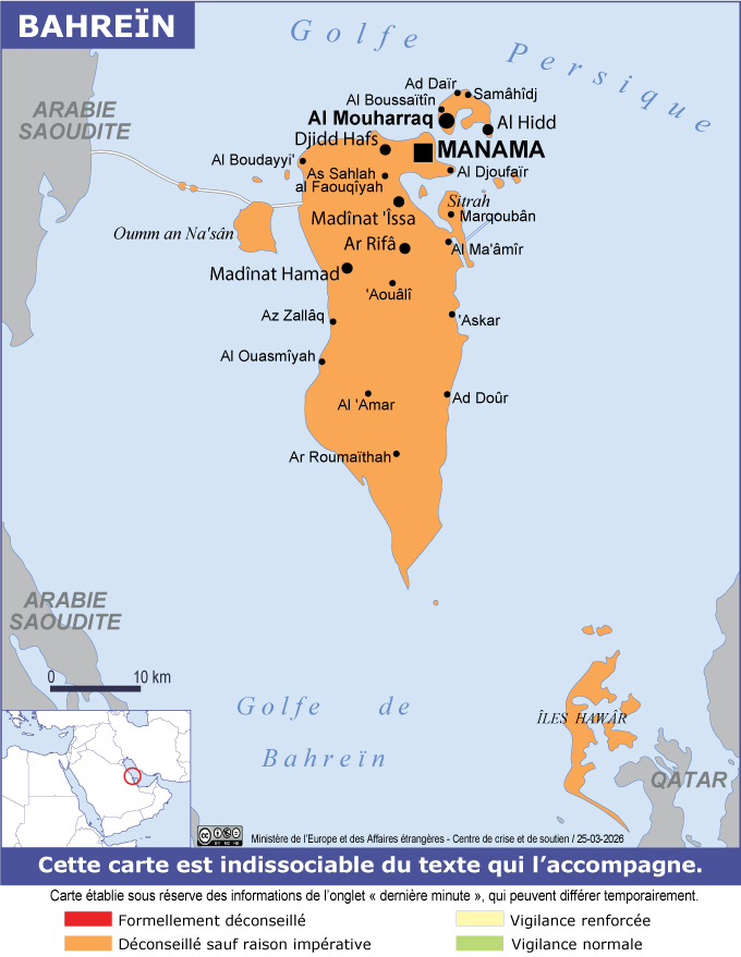 Bahreïn Navigation latérale fiche pays Dans cette rubrique Bahreïn Présentation du Bahreïn Conseils aux voyageurs Dernières minutes et alertes Sécurité Entrée / séjour Santé Informations utiles Voyages d'affaires Contacts utiles Politique et économie Relations bilatérales Sécurité Date de mise à jour le : 31 mars 2026 Information toujours valable à la date du jour Imprimer Imprimer Vous voyagez à l'étranger ? Pour recevoir des alertes, inscrivez-vous sur Fil d'Ariane. S'inscrire sur Fil d'Ariane Donnez-nous votre avis Aidez-nous à améliorer notre service en répondant à notre enquête. Répondre à l'enquête utilisateurs Fermer Vérifiez que vous êtes bien assurés Avant de voyager, il est indispensable de vérifier que vous êtes bien assuré Quelle est la portée des Conseils aux Voyageurs ? Zones de vigilance Dernière actualisation le 25/03/2026, information toujours valable à la date du jour Il demeure déconseillé aux ressortissants français, sauf pour des raisons impératives, de se rendre à Bahreïn. L’accès à l’extrême sud de l’île est interdit (zone militaire). Il est défendu d’emprunter les routes signalées par un panneau "private road". De manière générale, il est déconseillé de s’approcher de sites militaires. Dans le contexte de la crise au Moyen-Orient, la prise de photos de sites ou de scènes sensibles est passible de poursuites. Risques encourus et recommandations associées Situation régionale Compte tenu de la situation régionale, les voyages vers Bahreïn sont déconseillés. L’évolution de la situation dans la région doit faire l’objet d’une attention constante et soutenue. Risque terroriste régional La menace terroriste à Bahreïn est relativement peu élevée mais le contexte régional doit inciter à se tenir informé, et à adopter un comportement prudent et vigilant. Manifestations La situation régionale pourrait avoir des conséquences sur la situation sécuritaire intérieure. Des situations de tensions locales ou régionales peuvent subvenir et donner lieu à des rassemblements. Bien que les Français ne soient pas ciblés, il convient d’être vigilant et de se tenir à distance des rassemblements qui peuvent prendre forme à l’occasion de la survenue d’une tension ou lors de la célébration d’évènements politiques ou religieux (période d’élections, anniversaire du soulèvement de février 2011, fêtes de l’Achoura par exemple). Ces rassemblements peuvent générer des difficultés de circulation, notamment dans l’après-midi et en soirée. Ils se tiennent pour l’essentiel près des axes de circulation (Budaiya Highway, à l’ouest de Manama) et des localités de Diraz, Saar et Sitra. En cas d’incident ou dans ce contexte, des heurts entre manifestants et forces de l’ordre ne sont pas à exclure. Certains quartiers de la capitale Manama et de l’île de Muharraq peuvent également faire l’objet de rassemblements ponctuels. Arnaques A Bahreïn comme dans de nombreux pays, les ressortissants français peuvent être la cible d’arnaques en tous genres ayant pour principal objectif d’extorquer les voyageurs. Il est recommandé de consulter le guide de prévention contre les arnaques. Les escroqueries les plus courantes concernent l’usurpation d’identité, la collecte de données personnelles et bancaires par téléphone, la vente en ligne, la location. Dans tous les cas, il est recommandé d’être vigilant, de vérifier systématiquement le sérieux des sociétés auxquelles vous vous adressez, notamment avant versement de toute caution ou avance pécuniaire.Si un voyageur est victime d’une arnaque, il peut effectuer un signalement sur la plateforme Pharos ainsi qu’aux autorités locales sur le site dédié du ministère de l’Intérieur. Circulation routière Malgré un réseau routier excellent, la circulation peut être dangereuse du fait d’une part, du non-respect des limitations de vitesse et des distances de sécurité, et, d’autre part, des changements de files intempestifs. Il est conseillé d’adopter une conduite prudente et vigilante. Recommandations générales Il est indispensable d’avoir sur soi un document d’identité. En cas de contrôle, l’absence de pièce d’identité peut entraîner le paiement d’une amende importante.La société bahreïnienne est tolérante mais il est recommandé de respecter les habitudes sociales et religieuses du pays (voir rubrique Infos utiles). Liste des représentations françaises Ambassade de France au Royaume de Bahreïn Diplomatic Area 319 - Villa 51 A - Road 1901 - Manama Town 319 PO Box 11134 Manama 319 Bahreïn Tel : +33 1 75 79 41 80 Ambassade de France au Royaume de Bahreïn Réseaux sociaux Facebook YouTube Instagram Section consulaire de l’Ambassade de France à Manama Diplomatic Area 319 - Villa 51 A - Road 1901 Manama 319 Bahreïn Tel : +33 1 75 79 41 80 Ambassade de France à Bahrein Réseaux sociaux Facebook Youtube Instagram