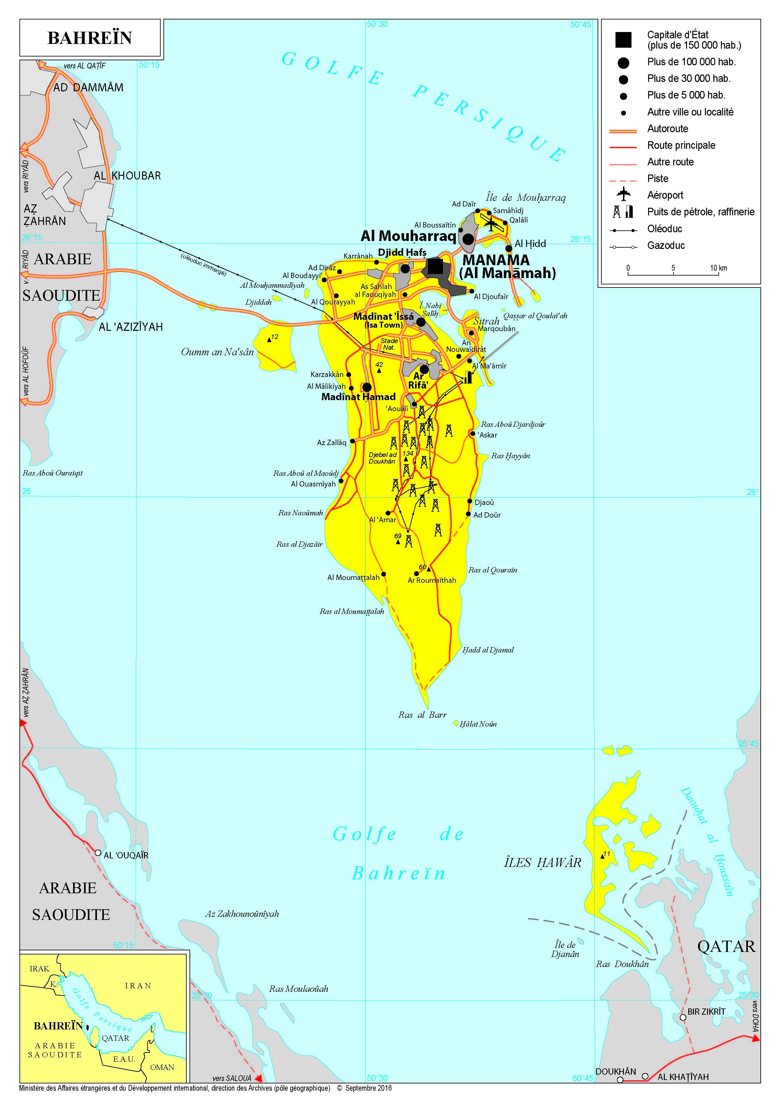 Bahreïn Navigation latérale fiche pays Dans cette rubrique Bahreïn Présentation du Bahreïn Conseils aux voyageurs Dernières minutes et alertes Sécurité Entrée / séjour Santé Informations utiles Voyages d'affaires Contacts utiles Politique et économie Relations bilatérales Présentation du Bahreïn Date de mise à jour le : 30 janvier 2026 Information toujours valable à la date du jour Présentation du pays Données générales Nom officiel : Royaume de BahreïnNature du régime : monarchie constitutionnelleChef de l’État : Sa Majesté Hamad bin Isa AL KHALIFA Données géographiques Superficie : 760 km² répartis sur 33 îles, dont certaines inhabitéesCapitale : ManamaVilles principales : Muharraq, Riffa, Jidhafs, Hamad Town, Isa TownLangue officielle : arabeMonnaie : dinar bahreïnienFête nationale : 16 décembre Données démographiques Population : 1 504 365 d’habitants (2021) dont 47,8% de bahreinisDensité : 1851 hab/km²Croissance démographique : 1.76 (2020)Espérance de vie : 77 ans (2021)Taux d’alphabétisation : 95.7 %Religions : islam (religion officielle), hindouisme, christianisme (nombreuses congrégations pour les populations expatriées)Indice de développement humain (2021) : 0.875/1 (35e sur 191) Politique intérieure Pleinement indépendant depuis août 1971, monarchie depuis 2002, Bahreïn est dirigé par le Roi Hamad bin Isa Al Khalifa, arrivé au pouvoir il y a plus de 20 ans, en 1999, après le décès de son père, l’Émir Isa. L’équilibre à la tête du royaume s’était stabilisé pendant une quinzaine d’années autour d’un triumvirat Roi - Premier Ministre - Prince héritier. Au décès du Premier ministre Khalifa bin Salman Al Khalifa, en novembre 2020, le Prince héritier Salman bin Hamad Al Khalifa a immédiatement été nommé Premier ministre. Le Roi Hamad a mené à son arrivée au pouvoir un programme ambitieux de réformes politiques et sociales avec notamment l’adoption, en 2001, d’une charte d’action nationale, aboutissant à la création d’une monarchie constitutionnelle. La constitution de 2002 a mis en place un parlement bicaméral, avec une chambre haute (Majlis Al Choura) composée de parlementaires nommés par le Roi et une chambre basse élue (Majlis Al Nawab). A la suite du dernier scrutin, en novembre 2018, sans la participation des mouvements politiques d’opposition dissous, la Chambre des Représentants est dominée par une majorité d’indépendants. Le Royaume se présente comme une société ouverte, dans différents domaines, qu’il s’agisse de la coexistence religieuse, de la tolérance sociétale, de la place des femmes, ou bien encore des évolutions du droit du travail ou des réformes de la justice. Bahreïn a aussi connu plusieurs moments de tensions politiques et sociales internes depuis 30 ans, particulièrement en 2011 quand les autorités bahreïniennes ont dû, lors des Printemps arabes, faire appel aux forces armées et de police d’autres pays du Golfe pour l’aider à rétablir l’ordre, soulevant de nombreuses questions face à l’usage clairement excessif de la force, constaté en 2013 par la commission d’enquête indépendante qui avait été nommée par le Roi de Bahreïn. Par ailleurs, plusieurs cellules terroristes ont été démantelées ces dernières années. Bahreïn fait aussi face à plusieurs défis internes comme la place de la communauté chiite et sa meilleure intégration au sein du Royaume, des difficultés liées aux limites du modèle économique de développement de Bahreïn, le souhait d’une liberté d’expression accrue et d’un espace politique plus diversifié. Le Royaume fait également face à des critiques liées à la situation des droits de l’Homme qu’il s’efforce d’améliorer, à l’image du recours croissant aux peines alternatives. Le Royaume a poursuivi ses efforts, y compris pendant la crise du Covid-19 avec un important soutien financier, pour fournir à la population bahreïnie protection sanitaire (masques, tests, traitements), emplois (politique de "bahreïnisation"), débouchés et même logements pour les populations les plus défavorisées. L’ambitieuse "Vision 2030", portée par le Prince héritier, renforce la diversification de l’économie engagée depuis des années mais devenue désormais impérative du fait de la diminution de la rente pétrolière, en se focalisant sur plusieurs secteurs prioritaires dont la finance, notamment islamique, le tourisme et l’industrie (aluminium dont Bahreïn est désormais le premier producteur au monde après la Chine). Politique étrangère Les relations avec le Royaume-Uni et les États-UnisBahreïn entretient, d’abord, des relations historiques avec le Royaume-Uni. Londres a en effet exercé son protectorat sur l’archipel jusqu’en 1971. Les deux pays ont aussi célébré en 2016 le bicentenaire de leurs relations. Avec les États-Unis, la relation privilégiée est officiellement qualifiée de « stratégique ». Washington a d’ailleurs accordé en 2001 au Royaume de Bahreïn le statut d’« allié majeur hors OTAN ». Les États-Unis entretiennent avec Bahreïn une alliance militaire étroite, avec la signature en 1991, d’un accord de coopération de défense. Manama accueille le commandement de la Ve flotte américaine et le Commandement central des Forces navales (USNAVCENT). Manama s’est aussi engagé en septembre 2020 dans un processus de normalisation de ses relations avec Israël, directement inspiré par Washington. Relations avec les autres pays du Conseil de coopération des États arabes du Golfe (CCEAG)Le CCEAG est une enceinte privilégiée pour la diplomatie bahreïnienne, le Royaume y œuvrant en permanence pour l’adoption de positions unies. Le Royaume entretient des liens très étroits et anciens avec les Émirats arabes unis et, davantage avec l’Arabie saoudite à laquelle il est relié par un pont-digue de 25 km. Outre l’aide pét