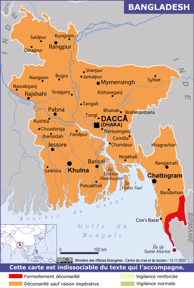 Bangladesh Navigation latérale fiche pays Dans cette rubrique Bangladesh Présentation du Bangladesh Conseils aux voyageurs Dernières minutes et alertes Sécurité Entrée / séjour Santé Informations utiles Voyages d'affaires Contacts utiles Politique et économie Relations bilatérales Sécurité Date de mise à jour le : 31 mars 2026 Information toujours valable à la date du jour Imprimer Imprimer Vous voyagez à l'étranger ? Pour recevoir des alertes, inscrivez-vous sur Fil d'Ariane. S'inscrire sur Fil d'Ariane Donnez-nous votre avis Aidez-nous à améliorer notre service en répondant à notre enquête. Répondre à l'enquête utilisateurs Fermer Vérifiez que vous êtes bien assurés Avant de voyager, il est indispensable de vérifier que vous êtes bien assuré Quelle est la portée des Conseils aux Voyageurs ? Zones de vigilance Dernière actualisation le 06/03/2026, information toujours valable à la date du jour Zones formellement déconseillées (rouge) Régions frontalières de la Birmanie Dans le contexte de tensions liées à l’afflux de réfugiés Rohingyas au Bangladesh, il est formellement déconseillé de se rendre dans les zones frontalières de la Birmanie, ainsi que l’île de Saint-Martin, sujettes aux trafics de drogues et d’êtres humains ainsi qu’à la piraterie maritime dans le golfe du Bengale. Les arrestations par la police et les garde-frontières de personnes voyageant dans ces zones frontalières sont fréquentes. Zones déconseillées sauf raison impérative (orange) Tout déplacement au Bangladesh est déconseillé sauf raison impérative. La région des Chittagong Hills Tracks (districts de Khagrachari, Rangamati et de Bandarban) est particulièrement déconseillée en raison de conflits récurrents entre différentes communautés. Depuis le 7 janvier 2015, les conditions d’accès des étrangers aux trois districts de Chittagong Hill Tracts (Rangamati, Khagrachari et Bandarban) ont été durcies : une autorisation doit être demandée au ministère de l’Intérieur au moins un mois à l’avance ; les étrangers ne sont autorisés à visiter les districts qu’après autorisation écrite des autorités ; en cas d’accord, tout entretien avec des membres des minorités ethniques de ces régions ne peut se faire qu’en présence de représentants de l’armée, de la police aux frontières ou de l’administration locale. Par ailleurs, hormis les régions frontalières de la Birmanie (formellement déconseillées), ainsi que la région des Chittagong Hill Tracts, mentionnée ci-dessous, le reste du territoire est déconseillé sauf raison impérative du fait du risque terroriste. Le numéro d’appel d’urgence pour joindre les services d’urgence (police, pompiers et secours) est le 999. En cas de catastrophes naturelles, le 1090 est à la disposition de la population pour les informations et conduites à tenir. Risques encourus et recommandations associées Risque terroriste Bien que les derniers attentats sur le territoire bangladais remontent à 2019, il convient de rester vigilant au Bangladesh eu égard au risque terroriste qui s’est accru ; les Français résidents ou de passage sont appelés à se tenir à l’écart de tout rassemblement, à être prudents à l’occasion des déplacements, en évitant les trajets de nuit, et à privilégier les hôtels et restaurants ayant mis en place des contrôles de sécurité. Agitation politique et sociale Les manifestations politiques ou sociales sont de plus en plus fréquentes au Bangladesh et peuvent parfois être soudaines et devenir violentes. Il convient de rester à l’écart de tout rassemblement et, notamment à l’approche des élections, de se tenir informé des éventuelles manifestations prévues. Délinquance La délinquance de rue (vols à l’arraché notamment) est en forte augmentation, et plus particulièrement la nuit dans la capitale. Il convient d’éviter les trajets à pied ou en pousse-pousse en soirée à Dacca, et de rester particulièrement vigilant de jour comme de nuit lors de tout déplacement avec effets personnels via ces modes de transport dans l’ensemble du pays. Violences sexuelles De nombreux cas de harcèlements ou d’agressions sexuelles sont signalés, notamment dans les transports en commun et dans la rue. Dès l’arrivée au Bangladesh, il est essentiel, en particulier pour les femmes et a fortiori celles voyageant seules, de prendre certaines précautions : tenue vestimentaire : porter de préférence des vêtements longs et amples et garder les épaules couvertes. déplacements : il est fortement conseillé aux femmes de ne pas sortir seules le soir, et en particulier d’éviter de se retrouver seules par exemple avec un chauffeur de taxi, un employé d’hôtel, un guide, etc. Risques naturels Durant la mousson (de juin à fin septembre), le niveau des eaux monte, y compris à Dacca. Les inondations sont habituelles durant cette période et se produisent avec des préavis parfois très courts. Les routes sont fréquemment coupées durant cette saison. Les déplacements par voie terrestre doivent être entrepris avec précaution, avec des véhicules appropriés et en tenant compte des bulletins météorologiques. Durant la saison des orages (imprévisibles, soudains et d’une rare violence), d’avril à la fin du mois de mai, il est formellement déconseillé d’emprunter les bateaux ou les ferries sur les voies fluviales comme dans le golfe du Bengale. Le Bangladesh est entouré par des régions à forte sismicité et est de plus en plus souvent sujet à des séismes de magnitude modeste. Spécialement à Dacca, où les constructions sont érigées sur des sédiments fluviaux, il est recommandé de prendre connaissance de la fiche des risques naturels liés aux séismes. Liste des représentations françaises Ambassade de France au Bangladesh Felani Avenue - Baridhara Diplomatic Enclave Dacca - 1212 Bangladesh Tel : +880 2 55 66 8