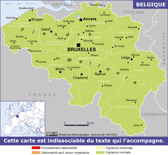 Belgique Navigation latérale fiche pays Dans cette rubrique Belgique Présentation de la Belgique Conseils aux voyageurs Dernières minutes et alertes Sécurité Entrée / séjour Santé Informations utiles Voyages d'affaires Contacts utiles Politique et économie Relations bilatérales Sécurité Date de mise à jour le : 27 mars 2026 Information toujours valable à la date du jour Imprimer Imprimer Vous voyagez à l'étranger ? Pour recevoir des alertes, inscrivez-vous sur Fil d'Ariane. S'inscrire sur Fil d'Ariane Donnez-nous votre avis Aidez-nous à améliorer notre service en répondant à notre enquête. Répondre à l'enquête utilisateurs Fermer Vérifiez que vous êtes bien assurés Avant de voyager, il est indispensable de vérifier que vous êtes bien assuré Quelle est la portée des Conseils aux Voyageurs ? Zones de vigilance Dernière actualisation le 18/03/2026, information toujours valable à la date du jour Le territoire belge est placé en vigilance normale. Risques sécuritaires et recommandations associées Risque terroriste Le niveau d’alerte terroriste pour l’ensemble du pays fixé par les autorités locales est actuellement de niveau 2 (menace considérée comme peu vraisemblable). Il est recommandé de se conformer en toutes occasions aux instructions des autorités locales et en particulier de faire preuve de vigilance dans les transports publics, les lieux les plus fréquentés et aux abords des institutions internationales, nombreuses à Bruxelles. En cas d’urgence, composer le 112. Vigilance dans les gares Il convient d’être extrêmement vigilant vis-à-vis des pickpockets qui sévissent régulièrement dans les gares de Bruxelles, plus particulièrement dans celle de Bruxelles-Midi, gare d’arrivée des trains "Thalys" Paris/Bruxelles/Amsterdam. Les voyageurs sont invités à surveiller très attentivement leurs effets personnels lors de l’accès ou de la sortie du train, durant l’attente dans les halls de ces gares et sur les quais des stations de métro attenantes, ainsi que dans les cafés et restaurants, dans la gare et les lieux environnants. Liste des représentations françaises Ambassade de France en Belgique 65, rue Ducale 1000 Bruxelles Belgique Tel : +32 2 548 87 11 Ambassade de France en Belgique Réseaux sociaux Facebook x Consulat général de France à Bruxelles 42, boulevard du Régent BP 82 1000 Bruxelles Belgique Tel : +32 2 620 05 20 Consulat général de France à Bruxelles Réseaux sociaux Youtube Facebook Instagram X LinkedIn Représentation de la France auprès du Comité politique et de sécurité de l’Union européenne (COPS) | Bruxelles COPS 14 place de Louvain 1000 Bruxelles Belgique Tel : (32) 2 229 86 00 Représentation de la France auprès du Comité politique et de sécurité de l’Unio… Représentation permanente de la France au Conseil de l’Organisation du Traité de l’Atlantique Nord (OTAN) | Bruxelles OTAN Siège de l'OTAN Boulevard Léopold III 1110 Bruxelles Belgique Tel : (32) 2 727 90 04 Représentation permanente de la France au Conseil de l’OTAN Réseaux sociaux X Représentation permanente de la France auprès de l’Union européenne | Bruxelles UE 14 place de Louvain 1000 Bruxelles Belgique Tel : +32 2 229 82 11 Représentation permanente de la France auprès de l’Union européenne Réseaux sociaux X Instagram Facebook