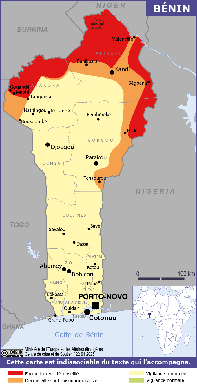Bénin Navigation latérale fiche pays Dans cette rubrique Bénin Présentation du Bénin Conseils aux voyageurs Dernières minutes et alertes Sécurité Risques naturels Entrée / séjour Santé Informations utiles Voyages d'affaires Contacts utiles Politique et économie Relations bilatérales Sécurité Date de mise à jour le : 03 avril 2026 Information toujours valable à la date du jour Imprimer Imprimer Vous voyagez à l'étranger ? Pour recevoir des alertes, inscrivez-vous sur Fil d'Ariane. S'inscrire sur Fil d'Ariane Donnez-nous votre avis Aidez-nous à améliorer notre service en répondant à notre enquête. Répondre à l'enquête utilisateurs Fermer Vérifiez que vous êtes bien assurés Avant de voyager, il est indispensable de vérifier que vous êtes bien assuré Quelle est la portée des Conseils aux Voyageurs ? Dernière actualisation le 28/01/2025, toujours en vigueur le 30/05/2025 Zones de vigilance Zones formellement déconseillées En raison d’activités possibles de groupes armés et du risque d’enlèvement, il est formellement déconseillé de se rendre dans : les zones frontalières du Burkina Faso et du Niger ; la totalité des parcs nationaux de la Pendjari et du W, les zones mitoyennes à ces parcs ; la ville de Banikoara et ses environs immédiats ; la frontière nord-ouest avec le Togo ; la frontière nord-est avec le Nigéria jusqu’aux environs de la ville de Nikki. Zones déconseillées sauf raison impérative Les zones suivantes sont déconseillées sauf raison impérative : le centre du département de l’Atakora, y compris les villes de Tanguiéta, Natitingou, Boukoumbé et Kouandé, où le risque d’enlèvement visant les Occidentaux est avéré ; une bande allant de la ville de Kandi à Tchaourou comprenant la ville de Nikki, dans les départements de l’Alibori et du Borgou. Zones de vigilance renforcée Le reste du pays est placé en zone de vigilance renforcée. Une vigilance particulière est conseillée dans les zones frontalières ainsi que dans les zones isolées ou à faible densité de population. A Cotonou, il convient d’éviter la nuit les quartiers du port et ceux qui longent des voies ferrées du centre-ville. Les plages de la capitale ne sont pas sûres, de jour comme de nuit. Il est recommandé d’être vigilant dans les lieux très fréquentés, notamment le marché de Dantokpa où les vols sont fréquents. Risques encourus et recommandations associées Risques liés aux transports Les accidents de la route constituent une cause importante de mortalité, souvent liés à la vétusté des véhicules en circulation (notamment des poids lourds), au mauvais état de certaines routes, ainsi qu’au non-respect des limitations de vitesse. Il est déconseillé de circuler de nuit, la signalisation étant souvent absente, les routes peu éclairées et les véhicules circulant régulièrement tous feux éteints. Des « coupeurs de route » peuvent sévir sur les axes secondaires, dans les zones isolées. Il convient d’éviter de circuler sur ces routes, notamment la nuit. Délinquance La criminalité est peu élevée au Bénin. Toutefois, des cambriolages et des agressions, parfois avec violence, ont été signalés. Il convient de rester vigilant, de surveiller ses objets personnels et d’éviter les déplacements de nuit, particulièrement seul et à pied. Cybercriminalité La cybercriminalité est en augmentation au Bénin. Il convient de se montrer vigilant, notamment lorsqu’une aide financière ou un achat est sollicité. D’une manière générale, il est recommandé de ne pas effectuer de versements dès lors qu’il existe le moindre doute. Avant tout achat, il convient de se renseigner sur l’existence au Bénin du fournisseur, de la société commerciale ou de la personne privée, soit auprès du ministère de l’industrie et du commerce extérieur, soit sur des annuaires internationaux en ligne. Terrorisme Compte tenu du contexte régional, le risque terroriste ne peut être totalement écarté au Bénin. En mai 2019, deux touristes français ont été enlevés dans le parc national de la Pendjari et leur guide tué. Des attaques aux frontières nord du Bénin ont causé, depuis novembre 2021, plusieurs morts, notamment parmi les forces de défense et les gardes forestiers. Les attentats de Grand Bassam en 2016 en Côte d’Ivoire et les évènements de 2018 au Burkina Faso ont également montré que les groupes terroristes de la région ciblent les lieux de divertissement et hôtels où séjournent les étrangers. Il est recommandé d’observer la plus grande vigilance et de s’assurer que les accès à ces lieux sont sécurisés. Recommandations générales De manière générale, il est recommandé de : ne pas montrer de signe ostentatoire de richesse, éviter de transporter des sommes d’argent importantes, laisser les objets de valeur en lieu sûr (ex : les coffres des hôtels) ; laisser les documents d’identité et de voyage dans des lieux sécurisés et se munir de photocopies ; privilégier l’usage de distributeurs intérieurs et éviter de manipuler des sommes d’argent importantes en public ; éviter de circuler de nuit ; être vigilant dans la préparation de ses déplacements et informer des personnes de confiance de ses trajets ; ne pas emprunter de taxis-motos, les accidents étant fréquents ; ne pas prendre de photographies sans autorisation préalable. Activités sportives à risque Baignades Les baignades sont déconseillées toute l’année sur les plages du littoral, en raison de la barre et des courants violents qui font plusieurs victimes chaque année. Liste des représentations françaises Ambassade de France au Bénin Avenue Jean-Paul II Cotonou Bénin Tel : +229 21 36 55 33 Ambassade de France au Bénin Réseaux sociaux Facebook X YouTube Section consulaire de l’Ambassade de France à Cotonou rue 651A BP 605 Cotonou Bénin Tel : +33 3 73 88 01 68 Ambassade de France au Bénin R