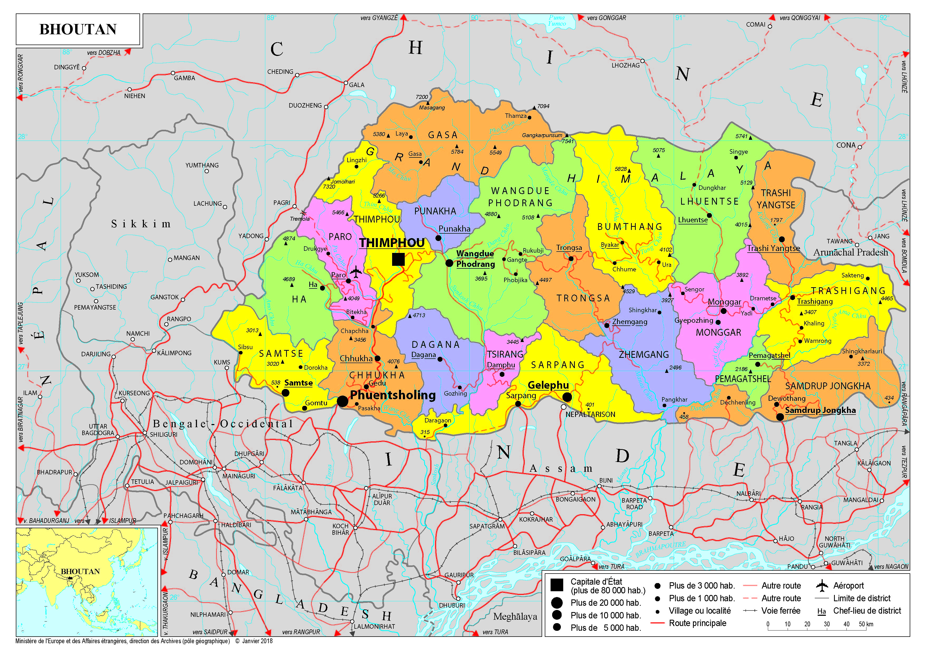 Bhoutan Navigation latérale fiche pays Dans cette rubrique Bhoutan Présentation du Bhoutan Conseils aux voyageurs Dernières minutes et alertes Sécurité Entrée / séjour Santé Informations utiles Voyages d'affaires Contacts utiles Politique et économie Relations bilatérales Présentation du Bhoutan Date de mise à jour le : 30 janvier 2026 Information toujours valable à la date du jour Présentation du pays Données générales Nom officiel : Royaume du BhoutanNature du régime : Monarchie constitutionnelle (depuis juillet 2008)Chef de l’État : M. Jigme Khesar Namgyel Wangchuck (Roi-dragon)Chef du gouvernement : M. Tshering Tobgay (Premier ministre depuis janvier 2023)Ministre des affaires étrangères et du commerce extérieur : M. D. N. DungyelFête nationale : 17 décembre (anniversaire du couronnement du 1er roi en 1907) Données géographiques Superficie : 38 394 km²Capitale : ThimphouVilles principales :Punakha ; Phuentsholing ; Paro.Langue officielle : Dzongkha (dialecte tibétain)Langues courantes : divers dialectes tibétains et népalaisMonnaie : Ngultrum (Nu) parité avec la Roupie indienne également en circulation Données démographiques Population : 786395 habitants (Banque mondiale, 2023)Densité : 38 21 habitants/km² (Banque mondiale, 2022)Croissance démographique : +0,7% (Banque mondiale, 2023)Espérance de vie : 73 ans (Banque mondiale, 2023)Taux d’alphabétisation : 52,8%Religion(s) : bouddhisme lamaïque (75%), hindouisme (25%)Indice de développement humain : 0,681 (125e rang mondial sur 193, PNUD 2024) Politique intérieure Pays enclavé au cœur de l’Himalaya entre l’Inde et la Chine, le Bhoutan se caractérise par des montagnes escarpées et des vallées profondes. En 2008, le pays est passé pacifiquement d’une monarchie absolue à une monarchie constitutionnelle. L’indice de bonheur national brut qui l’a rendu célèbre est inscrit dans sa constitution de 2008 et guide son développement. Depuis 2008, des élections sont organisées tous les 5 ans. Les dernières élections à la chambre haute se sont tenues le 20 avril 2023 afin d’élire pour cinq ans 20 des 25 membres du Conseil national (les 5 autres sont nommés par le roi). Les 4e élections législatives ont conduit en janvier 2024 au renouvellement des 47 sièges de l’Assemblée nationale et à la nomination d’un nouveau Premier ministre, M. Tshering Tobgay, du Parti démocratique populaire, qui avait déjà occupé cette fonction de 2013 à 2018. Le Bhoutan a rouvert ses frontières le 23 septembre 2022, imposant une « taxe de développement » (Sustainable Development Fee – SDF) de 200 USD par personne et par jour aux visiteurs séjournant dans le pays afin de contribuer à un tourisme vert et financer l’entretien des forêts, les écoles et le développement des hôpitaux. Cette taxe a été ramenée à 100 USD à l’automne 2023 afin d’encourager la reprise du tourisme. Le Bhoutan est engagé dans d’importantes réformes notamment au niveau des politiques fiscales, judiciaire et relatives à la fonction publique (avec une réduction du nombre de ministères). Le Bhoutan est confronté depuis plusieurs années à un problème d’employabilité de sa population (19% de jeunes sont sans emploi) à l’origine d’une émigration massive notamment vers l’Australie et le Moyen- Orient. Parmi les solutions envisagées figurent le projet de création d’une région autonome spéciale G.M.C (Gelephu Mindfulness City) dont l’attractivité future est censée Politique étrangère Les relations extérieures du Bhoutan sont centrées sur sa relation avec l’Inde. L’économie du Bhoutan reste fortement dépendante de l’Inde pour sa balance commerciale et les revenus issus de la vente d’énergie hydroélectrique. Depuis le traité d’amitié de 1949, actualisé en 2007, New Delhi est le « conseiller » de Thimphou dans la conduite de sa politique étrangère. Le mMinistre des Aaffaires extérieures indien, S. Jaishankar s’est rendu en visite au Bhoutan le 28 avril 2022. Le roi du Bhoutan, Jigme Khesar Namgyel Wangchuck, était en visite à New Delhi en avril 2023 et il s’est entretenu avec le Premier ministre indien Narendra Modi. Les deux pays ont à cette occasion publié une déclaration conjointe intitulée « cadre pour un partenariat élargi entre l’Inde et le Bhoutan ». Le Premier ministre indien Narendra Modi s’est rendu à Thimphou en mars 2024. Le Bhoutan n’entretient pas de relations diplomatiques avec la Chine. Des négociations ont été entamées à partir de 1984 en vue de délimiter les frontières entre les deux Etats. Ont ainsi été signé deux accords en 1988 et en 1998, sans toutefois mettre un terme aux différends. Depuis juillet 2020, Pékin revendique également la région orientale du Sakteng. Les négociations entre Thimphou et Pékin ont abouti à la signature en octobre 2021 d’une « feuille de route en trois étapes pour accélérer les pourparlers sur leur différend frontalier ». Le Bhoutan a refusé d’adhérer à l’initiative des Nouvelles routes de la soie ou d’accepter toute autre forme d’aide financière proposée par Pékin (subventions, prêts). Les relations avec le Népal ont récemment été marquées par la question des 90 000 réfugiés bhoutanais ayant fui le pays dans les années 1980 et 1990. Le Bhoutan considérant qu’ils ont quitté le pays de façon volontaire et le Népal refusant de les reconnaître, des procédures de réinstallation ont été organisées dans plusieurs pays à travers le monde par le bureau du Haut-Commissariat des Nations uUnies pour les réfugiés de Katmandou. L’Union européenne (UE) entretient des relations diplomatiques avec le Bhoutan via sa représentation à Delhi. L’UE était par exemple observatrice lors des premières élections organisées au Bhoutan en 2008. Le partenariat UE-Bhoutan se résume en trois priorités pour la période 2021-2027 : chan
