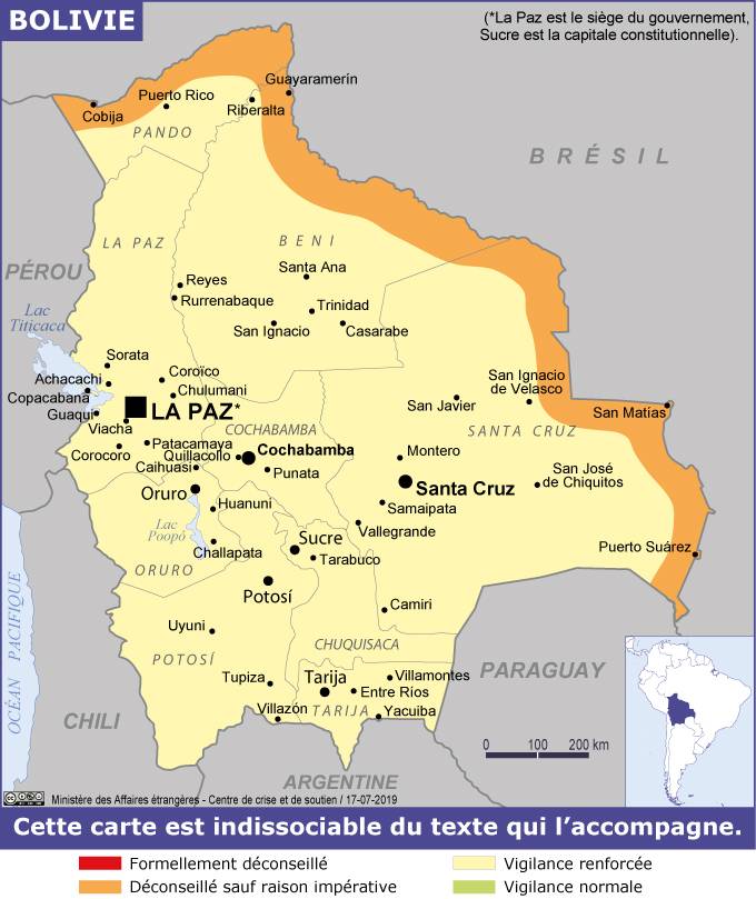 Bolivie Navigation latérale fiche pays Dans cette rubrique Bolivie Présentation de la Bolivie Conseils aux voyageurs Dernières minutes et alertes Sécurité Entrée / séjour Santé Informations utiles Voyages d'affaires Contacts utiles Politique et économie Relations bilatérales Sécurité Date de mise à jour le : 31 mars 2026 Information toujours valable à la date du jour Imprimer Imprimer Vous voyagez à l'étranger ? Pour recevoir des alertes, inscrivez-vous sur Fil d'Ariane. S'inscrire sur Fil d'Ariane Donnez-nous votre avis Aidez-nous à améliorer notre service en répondant à notre enquête. Répondre à l'enquête utilisateurs Fermer Vérifiez que vous êtes bien assurés Avant de voyager, il est indispensable de vérifier que vous êtes bien assuré Quelle est la portée des Conseils aux Voyageurs ? Zones de vigilance Dernière actualisation le 17/03/2026, information toujours valable à la date du jour Zones déconseillées sauf raison impérative (orange sur la carte) En raison des trafics (stupéfiants, contrebande) et de l’importante quantité d’armes en circulation, il est déconseillé, sauf raison impérative, de se rendre ou de séjourner dans la zone frontalière avec le Brésil. Il est recommandé de ne pas s’attarder lors du passage aux frontières terrestres avec le Brésil, notamment à Guayaramerin (département de Béni). Zone de vigilance renforcée (en jaune sur la carte) Le reste du pays est placé en vigilance renforcée. Il est recommandé de s’inscrire sur le service Fil d’Ariane, notamment dans le cas de déplacements dans des zones isolées (Salar de Uyuni, Sud Lipez, Sajama, Amazonie) ou dans des régions difficiles d’accès, et surtout en saison des pluies (de décembre à avril pour les Yungas, l’Alto Beni, le Beni, etc.) afin de renseigner sur la plate-forme les itinéraires prévus. Terminal d’autobus de La Paz De nombreux touristes passant par le terminal d’autobus de La Paz sont victimes de vol. Il est recommandé d’être particulièrement attentif à ses bagages. Santa Cruz La délinquance est plus élevée dans la région de Santa Cruz que dans le reste du pays (possibilité d’agressions armées). Il convient d’être particulièrement vigilant lors de ses déplacements. El Alto Il convient d’être attentif aux pickpockets qui sévissent sur la Feria, et de ne pas s’y rendre avec des objets de valeur. Abords et îles du Lac Titicaca Il est recommandé d’être attentif à l’état des embarcations.Certaines parties de l’Isla del Sol sont parfois interdites aux visiteurs en raison de conflits entre communautés, il convient de bien se renseigner auprès des locaux avant d’entamer des promenades sans guide.Il convient d’anticiper des retards importants lors des trajets en bateau, les bateliers préférant attendre le remplissage des embarcations pour commencer la traversée. Salar d’Uyuni et sud Lipez Il convient, dans cette région désertique, de se protéger contre la réverbération le jour, et contre le froid la nuit. A noter que les déplacements la nuit dans le sud Lipez, et particulièrement à la frontière avec le Chili, sont à proscrire à moins d’être accompagné par une agence dûment autorisée par les autorités locales. Des contrôles de police peuvent avoir lieu. On recense régulièrement des accidents - parfois mortels - de véhicules 4x4 d’agences de tourisme circulant sur le Salar de Uyuni. Il est fortement recommandé de sélectionner une agence de tourisme sérieuse (les recommandations sur les sites de voyages ne sont pas toujours fiables), de s’assurer du bon état général du véhicule et de refuser avec fermeté de voyager dans un véhicule qui ne disposerait pas de toutes les ceintures de sécurité. Il est conseillé de veiller à ce que la vitesse du véhicule ne dépasse pas les 80 km/h. Les trous de la croûte de sel peuvent en effet provoquer une perte de contrôle du véhicule en cas de vitesse trop élevée. Il est préférable d’éviter de circuler avec son propre véhicule sur le salar d’Uyuni, particulièrement durant la saison des pluies, en raison du risque élevé d’embourbement du véhicule et du manque de structures locales en mesure de porter assistance. La région d’Uyuni et du sud Lipez ne dispose pas d’une bonne couverture réseau. En conséquence, il est recommandé de prévenir ses proches avant l’organisation d’un tour de plusieurs jours dans cette région. Route des Yungas La route cycliste reliant La Paz à Coroico, surnommée la « route de la mort », est un axe dangereux. En raison de l’étroitesse de la chaussée bordée par des ravins, la descente en vélo est réservée aux cyclistes confirmés. Il est vivement recommandé de sélectionner une agence de tourisme sérieuse, de s’assurer du bon état des vélos et des protections (casques, genouillères, coudières) et de rester prudent dans sa conduite. Andinisme Il est impératif de faire appel à des guides locaux formés, y compris pour les alpinistes expérimentés. Il existe une association de guides de haute montagne certifiés.Il est également recommandé aux alpinistes de vérifier que leur contrat d’assurance contient des dispositions d’assistance au-delà de 5 000 mètres. Une acclimatation d’au moins dix jours est fortement recommandée avant toute ascension.De grandes variations thermiques peuvent être enregistrées, notamment à La Paz (entre 15 et 22° C à l’ombre le jour, beaucoup plus lorsqu’on est exposé au soleil ; 0° C ou moins la nuit). En dehors des périodes pluvieuses (de décembre à mai), l’atmosphère est très sèche (40 % au moins d’humidité d’avril à septembre). Dans toute la région altiplanique (3 000 mètres d’altitude et plus), il convient de se protéger efficacement contre le soleil (crème solaire protection totale -UVA et UVB-, port d’un couvre-chef, de manches longues, de lunettes de soleil filtration montag