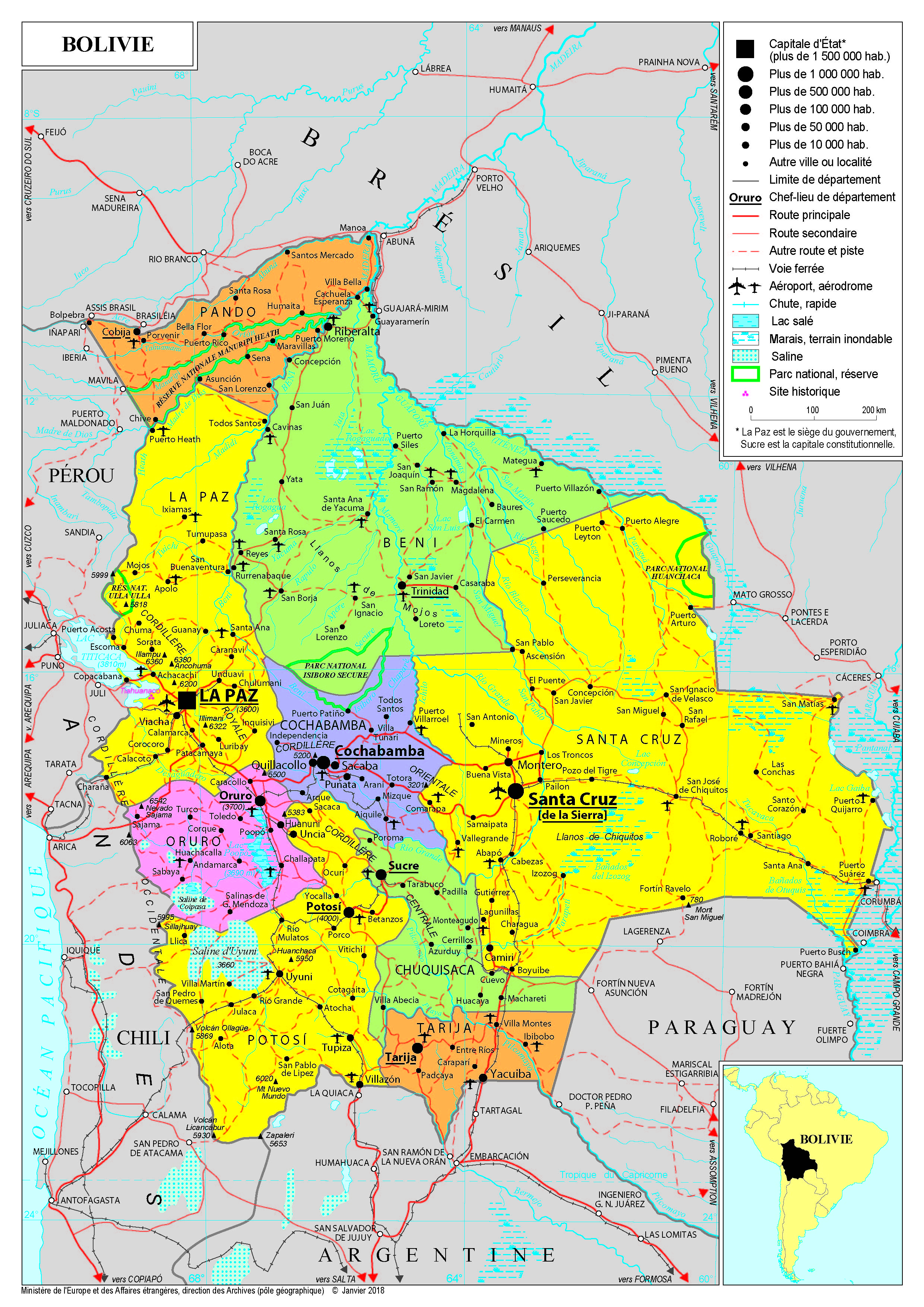 Bolivie Navigation latérale fiche pays Dans cette rubrique Bolivie Présentation de la Bolivie Conseils aux voyageurs Dernières minutes et alertes Sécurité Entrée / séjour Santé Informations utiles Voyages d'affaires Contacts utiles Politique et économie Relations bilatérales Présentation de la Bolivie Date de mise à jour le : 30 janvier 2026 Information toujours valable à la date du jour Présentation du pays Données générales Nom officiel : État plurinational de BolivieNature du régime : République présidentiellePrésident : Luis Alberto ARCE CATACORA Données géographiques Superficie : 1 098 580 km²Capitales : La Paz : capitale administrative (siège des pouvoirs exécutif et législatif) Sucre : capitale constitutionnelle Villes principales : Santa Cruz de la Sierra (1,6 million), capitale économique ; Cochabamba (620 000) ; Oruro (215 000), Tarija (195 000), Potosí (150 000).Langues officielles : espagnol et 36 langues indigènesMonnaie : boliviano 1 BOB = 0,13 EUR au 15/02/2023Fête nationale : 6 août Données démographiques Population (2023 - Banque mondiale) : 12,3 millions d’habitantsDensité : 10 habitants/km²Croissance démographique (2023 – Banque mondiale) : 1,23 %Espérance de vie (2020 - PNUD) : 71,5 ansTaux d’alphabétisation (2020 - PNUD) : 92,5 %Religion(s) : catholicisme (95 %), églises protestantesIndice de développement humain (2021) : 0,692 (118e rang mondial) Politique intérieure À la tête du pays entre 2005 et 2019, Evo Morales (MAS – Movimiento al Socialismo - Mouvement vers le socialisme) a engagé la Bolivie dans un processus de profondes transformations sociales, économiques et politiques, rendu possible par des politiques de redistribution du revenu national et des richesses tirées de l’industrie extractive, et par la mise en place de programmes sociaux, d’accès à l’éducation et à la santé, dans un contexte de croissance soutenue. La Bolivie a connu une importante crise politique et institutionnelle dans la suite des élections d’octobre 2019, auxquelles Evo Morales se présentait pour un 4e mandat contesté (un referendum avait rejeté en 2016 la possibilité d’une révision de la Constitution sur le nombre de mandats possibles). Le premier tour des élections a été entaché de soupçons d’irrégularités, notamment documentées par un rapport présenté par l’Organisation des Etats américains (OEA), à la demande des autorités boliviennes. Alors qu’Evo Morales avait été proclamé vainqueur dès le premier tour par le tribunal suprême électoral, de nombreuses manifestations et violences ont éclaté dans tout le pays, conduisant à l’annulation de ces élections, puis à la démission d’Evo Morales. La deuxième vice-présidente du Sénat, l’opposante de droite Jeanine Añez, a été proclamée le 12 novembre 2019 présidente par intérim. La gestion du gouvernement de transition a été marquée par de nombreuses tensions politiques, doublées d’une crise sanitaire, sociale et économique, conséquence de la pandémie de covid-19. Les élections d’octobre 2020 ont consacré une large victoire du candidat de gauche du MAS, Luis Arce, qui l’a emporté avec 55 % des voix et plus de 25 points d’avance sur son principal concurrent, le centriste Carlos Mesa. Le débat autour des événements de 2019-2020 continue d’occuper une place importante dans la vie politique bolivienne. Plusieurs anciens responsables du gouvernement par intérim et des forces de sécurité font l’objet d’enquêtes ou de mandats d’arrêt pour leur rôle dans le cadre d’un coup d’Etat présumé en novembre 2019. L’ancienne présidente par intérim Jeanine Añez a été condamnée en juin 2022 à 10 ans de prison, un procès dénoncé comme politique par ses partisans. Le gouverneur de Santa Cruz et opposant Luis Camacho a également été arrêté en décembre 2022. La question de l’indépendance et de l’impartialité de la justice sont par ailleurs centrales dans le débat public, alors que le Rapporteur spécial des Nations Unies sur l’indépendance des juges a soulevé à l’issue de sa visite en février 2022 l’importance d’une réforme d’ampleur. La gestion de Luis Arce s’est concentrée sur les conséquences sociales et économiques de la crise sanitaire, alors que la Bolivie a été profondément affectée par la pandémie de Covid-19. Certaines réformes proposées n’ont pu voir le jour du fait de diverses contestations sociales, en particulier dans le département de Santa Cruz. À l’automne 2022, la région de Santa Cruz a connu d’importantes mobilisations en lien avec la décision du gouvernement de reporter le recensement national à 2024. Fin 2022, des brefs remous ont également eu lieu suite à l’arrestation de et son gouverneur, l’opposant Luis Camacho. Dans la perspective de la prochaine élection présidentielle prévue en octobre 2025, le MAS connaît par ailleurs des tensions entre diverses tendances au sein du parti. Le 26 juin 2024, un rassemblement de plusieurs unités militaires au centre de La Paz a laissé craindre un risque de renversement du gouvernement. Déjouée en quelques heures, cette tentative a été condamnée de manière unanime par la communauté internationale. Politique étrangère La victoire d’Evo Morales en 2005, suivie de l’entrée de la Bolivie dans l’Alliance bolivarienne pour les peuples de notre Amérique (ALBA, créée en 2004 par le Vénézuéla et Cuba) a conduit le pays à adopter un discours anti-impérialiste et hostile aux États-Unis : critiques envers l’Organisation des États américains (OEA), positions favorables à l’Iran (avec lequel la Bolivie a établi des relations diplomatiques en 2007), rapprochement avec la Chine et la Russie. La Bolivie a ainsi rompu ses relations avec Israël en 2009, pour protester contre l’offensive à Gaza, et reconnu l’État palestinien en décembre 2010. Les relatio