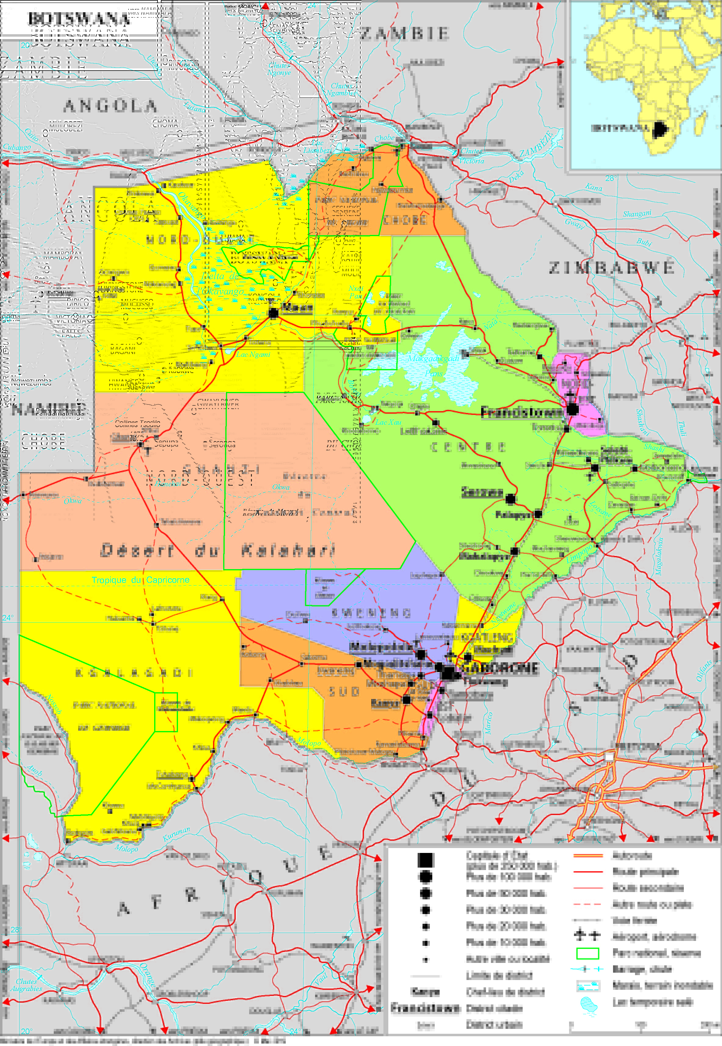 Botswana Navigation latérale fiche pays Dans cette rubrique Botswana Présentation du Botswana Conseils aux voyageurs Dernières minutes et alertes Sécurité Entrée / séjour Santé Informations utiles Voyages d'affaires Contacts utiles Politique et économie Relations bilatérales Présentation du Botswana Date de mise à jour le : 27 mars 2026 Information toujours valable à la date du jour Présentation du pays Présentation du pays Données générales Nom officiel : République du BotswanaNature du régime : présidentielChef de l’Etat : Duma Boko (depuis le 01/11/2024) Données géographiques Superficie : 581 730 km²Capitale : GaboroneVilles principales : Gaborone, Francistown, MolepololeLangues officielles : anglais et tswana Données démographiques Population : 2,7 millions d’habitantsCroissance démographique : +1,7% Espérance de vie : 69,2 ans Taux d’alphabétisation : 94%Indice de développement humain : 0,708 ; 114ème/192Religions : christianisme (79%) ; et présence d’autres petites communautés musulmane, hindouiste et bouddhiste Politique intérieure Le Botswana est une démocratie parlementaire stable. Le pays est souvent cité en exemple pour sa bonne gouvernance et sa bonne culture démocratique. Le Botswana a connu un tournant politique majeur lors des élections générales du 30 octobre 2024. La Coalition Umbrella for Democratic Change (UDC), principal parti d’opposition de centre-gauche, a remporté à la surprise générale la majorité absolue au Parlement (36 sièges sur 61), permettant à son chef, Duma Boko, d’accéder à la présidence. Cette alternance historique, qui a mis fin à 58 ans de règne sans partage du Botswana Democratic Party (BDP) dans un contexte de forte lassitude à l’égard du pouvoir sortant, ne reflète toutefois pas une progression nette du score électoral de la coalition (37,22% en 2024) par rapport à 2019 (35,9%), mais est d’abord une conséquence du mode de scrutin (système uninominal majoritaire à un tour).Cette alternance politique ne s’accompagne par ailleurs pas d’un mandat économique clair. Le programme électoral de la coalition, qui réunit trois partis aux orientations idéologiques diverses, présente un catalogue hétérogène de mesures parfois contradictoires, et des tensions internes sont déjà perceptibles au sein du gouvernement d’alliance. Le Botswana reste par ailleurs confronté à des défis structurels de long terme : chômage élevé, inégalités marquées, persistance de la pauvreté. Politique étrangère Le Botswana entretient une diplomatie modeste, mais active. Il accueille le siège de la Communauté de Développement de l’Afrique australe (SADC). Il entretient notamment d’étroites relations avec l’Afrique du Sud, pour des raisons historiques, géographiques et économiques, son économie étant intrinsèquement liée à celle de l’Afrique du Sud par l’Union Douanière d’Afrique australe (SACU). L’Afrique du Sud est de très loin son premier partenaire commercial (77% du marché) et le premier investisseur étranger (80% du stock). Le pays n’a plus de contentieux territorial majeur avec ses voisins depuis l’arrêt de la Cour internationale de Justice sur la bande de Caprivi, disputée avec la Namibie (1999) et le traité de démarcation frontalière, signé avec ce même pays en février 2018. Sur l’agression russe en contre l’Ukraine, le Botswana a constamment dénoncé les agissements russes et rappelé son attachement au droit international et au respect de l’intégrité territoriale. Le Président Boko a réaffirmé cette ligne lors de sa réélection. Il n’en demeure pas moins que le Botswana s’est abstenu lors du vote de la résolution soutenant l’Ukraine en février 2025 à l’Assemblée générale des Nations Unies. La coopération avec l’Union européenne est importante, notamment dans le secteur de l’éducation. Le Botswana a coordonné, au sein de la SADC, les négociations d’un Accord de Partenariat économique (APE UE-SADC) signé en juillet 2014, permettant le maintien de l’accès en franchise de droits et sans contingent des produits botswanais au marché européen. Situation économique Alors qu’elle avait crû de 3,2% en 2023, l’économie botswanaise s’est contractée de 3,0 % en 2024, touchée de plein fouet par les difficultés du secteur minier (-27,2% en 2024), dans un contexte marqué par un ralentissement de la demande mondiale et une baisse des cours du diamant. L’économie a également pâti de la sécheresse sévère due du phénomène El Nino, qui a fortement touché le secteur agricole (-2,1 %). Seul le dynamisme du secteur des services (+4,4 %) a permis de limiter la contraction. À court terme, les difficultés du secteur minier devraient persister. Le secteur fait en effet face à des conditions de prix défavorables dans un environnement international incertain (International Diamond Index Price en recul de 4% sur le premier semestre 2025, et de près de 42% depuis le point haut de mars 2022). Les mesures de traçabilité mises en place par le G7 depuis le 1er mars 2024 pour exclure du marché les diamants russes semblent par ailleurs pénaliser l’activité botswanaise. Dans ce contexte, Debswana (coentreprise entre le gouvernement botswanais et De Beers) a réduit sa production de 27 % en 2024 à 17,93 millions de carats, et prévoit une nouvelle baisse de 16 % à 15 millions de carats en 2025. Le FMI anticipe ainsi une nouvelle contraction de l’économie en 2025 (prévision de -0,4 %), avant un rebond à +2,3 % en 2026. L’inflation moyenne s’est établie à 2,8 % en 2024 (après 5,1 % en 2023). Elle se maintient en-deçà de sa fourchette cible (3% à 6 %) depuis septembre 2024, s’établissant à 1,9% sur un an en mai 2025. Cette évolution reflète principalement des effets de base favorables (notamment sur les carburants et le transport) et une hausse modérée des prix alimentaire