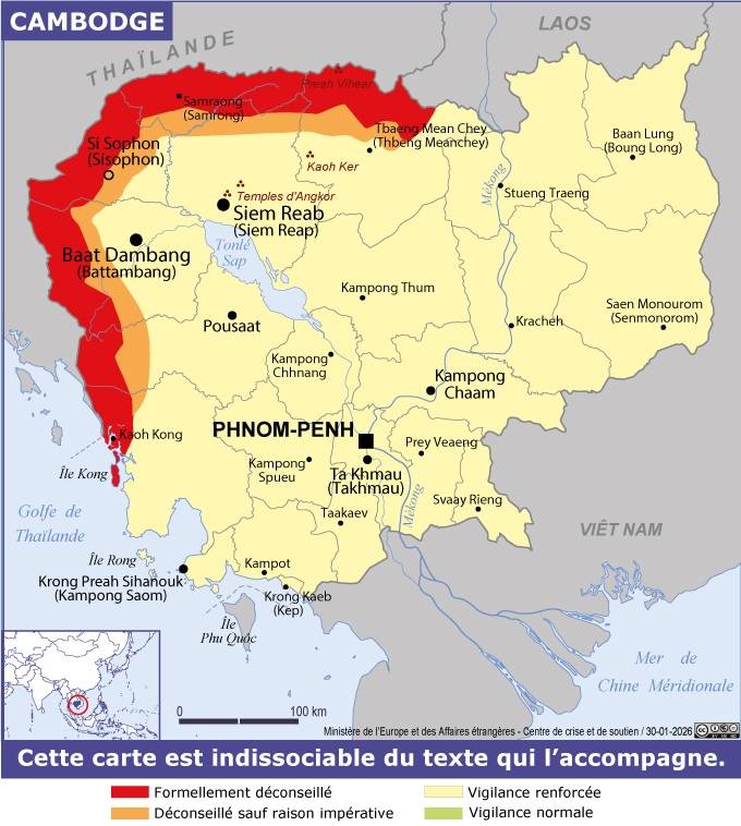 Cambodge Navigation latérale fiche pays Dans cette rubrique Cambodge Présentation du Cambodge Conseils aux voyageurs Dernières minutes et alertes Sécurité Entrée / séjour Santé Informations utiles Voyages d'affaires Contacts utiles Politique et économie Relations bilatérales Sécurité Date de mise à jour le : 31 mars 2026 Information toujours valable à la date du jour Imprimer Imprimer Vous voyagez à l'étranger ? Pour recevoir des alertes, inscrivez-vous sur Fil d'Ariane. S'inscrire sur Fil d'Ariane Donnez-nous votre avis Aidez-nous à améliorer notre service en répondant à notre enquête. Répondre à l'enquête utilisateurs Fermer Vérifiez que vous êtes bien assurés Avant de voyager, il est indispensable de vérifier que vous êtes bien assuré Quelle est la portée des Conseils aux Voyageurs ? Zones de vigilance Dernière actualisation le 05/03/2026, information toujours valable à la date du jour Il est recommandé, à Phnom Penh comme dans les principaux centres urbains, notamment à Siem Reap et Sihanoukville/Kompong Som, de faire preuve de prudence lors des déplacements de nuit, particulièrement à pied, en cyclo-pousse, en tuk-tuk ou en moto-taxi. Zones formellement déconseillées Les déplacements restent dangereux et formellement déconseillés dans une zone allant jusqu’à 30 km de la frontière (zone rouge). Les déplacements sont par ailleurs déconseillés, sauf raison impérative (zone orange), dans les régions qui se situent à une distance allant de 30 à 50 km de la frontière. Risques encourus et recommandations associées Frontière avec la Thaïlande Un cessez-le-feu est intervenu entre le Cambodge et la Thaïlande le 27 décembre 2025. La situation dans les zones frontalières demeure cependant fragile.En conséquence, les déplacements restent dangereux et formellement déconseillés dans une zone allant jusqu’à 30 km de la frontière (zone rouge). Les déplacements sont par ailleurs déconseillés, sauf raison impérative (zone orange), dans les régions qui se situent à une distance allant de 30 à 50 km de la frontière. Toute visite touristique est à proscrire dans ces régions. Il est recommandé de suivre très régulièrement les informations et les consignes des autorités locales. Vols et agressions Des agressions, vols à l’arraché et arnaques aux touristes sont régulièrement signalés dans la capitale et dans les principales villes de province. La plupart des vols à l’arraché concernent les sacs à main et besaces en bandoulière, les téléphones portables et les petits bagages. Il est donc fortement déconseillé de laisser apparents des sacs, que ce soit lors des déplacements à pied, en deux-roues ou en tuk-tuk. Ces vols peuvent s’accompagner d’agressions physiques ou provoquer des chutes susceptibles d’occasionner des blessures graves. Des agressions sexuelles sont en outre déplorées chaque année. L’attention des femmes voyageant seules est appelée, en particulier la nuit et dans certains quartiers (rues des bars à Phnom Penh mais également dans les villes de provinces). La nuit tombée, il convient d’éviter de se retrouver seul dans les zones peu fréquentées, d’éviter tout contact avec des inconnus et de privilégier les déplacements en voiture plutôt qu’en tuk-tuk. La plus grande attention est aussi recommandée dans les bars, ou lors de rencontres au moyen d’applications dédiées ou de réseaux sociaux et qui peuvent éventuellement se dérouler à domicile. Ces rencontres sont régulièrement l’occasion d’administrer de la drogue aux victimes (soumission chimique) qui sont ensuite détroussées de leurs biens de valeur et de leurs avoirs en banque. Il convient de sécuriser ses applications bancaires mobiles (désactiver la reconnaissance faciale ou digitale par exemple). Utilisation de véhicules à deux roues La circulation au Cambodge ne respecte pas les codes et habitudes européennes et les accidents de deux-roues sont très fréquents. Il est rappelé que le port du casque est obligatoire et qu’être titulaire d’une assurance est indispensable pour couvrir les frais liés à une hospitalisation et à un rapatriement ainsi qu’aux blessures causées au tiers (accident responsable) et aux dégâts matériels. En cas d’accident, rester sur place et appeler la police, ainsi que les secours en cas de blessés. Garder son calme et éviter le conflit direct avec l’autre partie engagée (les caméras de surveillance sont nombreuses en milieu urbain et elles pourront aider à déterminer les causes et les responsabilités). Donner sa version des faits à la police. Criminalité Une grande méfiance doit être apportée aux propositions alléchantes d’emploi dans le domaine de la « gestion dématérialisée de dossiers » ou de « démarchage par internet ». Ces emplois aboutissent en effet régulièrement à des situations de privation de la liberté : les employés sont privés de leur passeport au motif que des formalités de droit de séjour (délivrance des permis et visa de travail) doivent être accomplies par l’employeur, et l’objet du travail réel relève de l’escroquerie en ligne. Le logement est souvent fourni mais l’employé ne peut en sortir et se trouve de fait séquestré. Des cas d’enlèvement à ces fins de ressortissants de tierces nationalités sont régulièrement rapportés. Saison des pluies Des orages violents et des inondations importantes, y compris des crues soudaines, peuvent survenir, durant la saison des pluies de juin à novembre. Ces inondations peuvent perturber les déplacements dans certaines provinces.Durant cette période, il est recommandé de s’informer auprès des voyagistes et des autorités locales avant tout déplacement dans des régions affectées et d’éviter tout déplacement aux abords des cours d’eau en crue.Le site de la Commission du Mékong fournit des informations sur le niveau de crue du Mékon