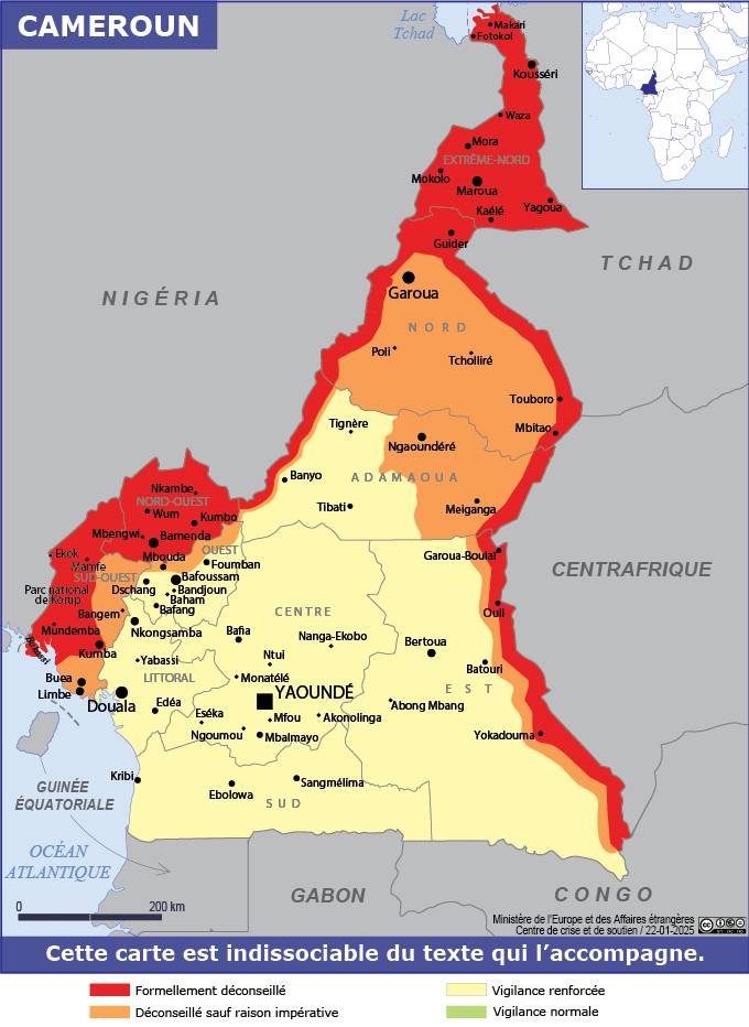 Cameroun Navigation latérale fiche pays Dans cette rubrique Cameroun Présentation du Cameroun Conseils aux voyageurs Dernières minutes et alertes Sécurité Entrée / séjour Santé Informations utiles Voyages d'affaires Contacts utiles Politique et économie Relations bilatérales Sécurité Date de mise à jour le : 15 avril 2026 Information toujours valable à la date du jour Imprimer Imprimer Vous voyagez à l'étranger ? Pour recevoir des alertes, inscrivez-vous sur Fil d'Ariane. S'inscrire sur Fil d'Ariane Donnez-nous votre avis Aidez-nous à améliorer notre service en répondant à notre enquête. Répondre à l'enquête utilisateurs Fermer Vérifiez que vous êtes bien assurés Avant de voyager, il est indispensable de vérifier que vous êtes bien assuré Quelle est la portée des Conseils aux Voyageurs ? Zones de vigilance Dernière actualisation le 05/03/2026, information toujours valable à la date du jour Zones formellement déconseillées (rouge) Région de l’Extrême-Nord : toute la région de l’Extrême-Nord du Cameroun est formellement déconseillée du fait d’opérations militaires, du risque terroriste et du risque d’enlèvements, y compris les Monts Mandara en dépit de l’inscription au patrimoine mondial de l’UNESCO des sites Diy-Biy en juillet 2025. Il s’agit d’un site refuge de groupes terroristes ; les enlèvements et les attaques meurtrières sont fréquents. Région du Nord : le département du Mayo-Louti, voisin de la région de l’Extrême-Nord, est formellement déconseillé. Frontière nigériane : l’ensemble de la frontière avec le Nigéria est formellement déconseillée sur une profondeur de 30 km, du fait d’incursions de groupes terroristes ou criminels à partir du Nigéria (Boko Haram, miliciens du Delta du Niger, etc.). Frontière avec la République centrafricaine (RCA) et avec le Tchad : il est formellement déconseillé de se rendre dans une bande de 30 km le long de la frontière du Cameroun, du lac Tchad jusqu’au sud de la RCA en raison de la situation sécuritaire en RCA et de la porosité des frontières à des bandes armées (braconniers, bandits, trafiquants, etc.). Les villes de Garoua-Boulaï, de Touboro et de Yokadouma sont situées sur des axes routiers importants à proximité de la frontière est du Cameroun, dans des zones formellement déconseillées. La traversée des zones rouges doit se faire sous escorte militaire pour les personnes empruntant les routes suivantes : l’axe reliant Yaoundé à N’Gaoundéré via Garoua-Boulaï ; l’axe reliant Garoua et N’Gaoundéré à Moundou (Tchad) via Touboro ; l’axe reliant Bertoua à Yokadouma. Région du Nord-Ouest : toute la région est formellement déconseillée du fait d’opérations militaires, du risque terroriste et du risque d’enlèvement. Région du Sud-Ouest : tout déplacement dans la presqu’île de Bakassi est formellement déconseillé, compte tenu de l’isolement et des problèmes d’insécurité liés notamment aux activités de contrebandiers qui affectent ce territoire rétrocédé au Cameroun par le Nigéria en 2008. Le parc national de Korup se trouve en partie dans la zone frontalière avec le Nigéria. Il est formellement déconseillé de s’y rendre.Enfin, depuis l’intensification de la crise dans les régions du Nord-Ouest et du Sud-Ouest, il convient d’éviter formellement la partie à l’ouest des villes de Kumba et de Mamfe. Zones déconseillées sauf raison impérative (orange) Région du Nord et départements de la Vina et du Mbéré dans l’Adamaoua : dans les régions du Nord, à l’exception du département du Mayo-Louti, et dans l’Est de l’Adamaoua (départements de la Vina et du Mbéré), le risque terroriste est moins élevé que dans l’Extrême-Nord. Toutefois, des incidents de sécurité sont régulièrement signalés : coupeurs de route, découvertes de caches d’armes, infiltration d’éléments armés incontrôlés venus de l’extérieur, enlèvements visant principalement des éleveurs locaux.Les ressortissants français vivant dans ces régions sont invités à signaler leur présence ou celle de Français de passage ainsi que leurs déplacements dans cette zone à la section consulaire de l’ambassade de France à Yaoundé, via son adresse mail.En cas de séjour visible (réunion amenant plusieurs Français à séjourner ou travailler au même endroit pendant plusieurs jours), une protection militaire est très recommandée (contacter la gendarmerie). Les voyages de nuit sont vivement déconseillés. Région du Sud-Ouest : au-delà des axes et zones formellement déconseillés, cette région connaît une insécurité croissante et des actes terroristes meurtriers. En conséquence, il est expressément recommandé d’observer les conseils suivants : suivre les recommandations susceptibles d’être formulées par les autorités locales ; respecter les couvre-feux décidés par les autorités ; se tenir à l’écart des rassemblements ou manifestations ; éviter de se déplacer de façon ostensible pendant les « journées villes mortes ».Pour tout déplacement dans cette région, qui ne saurait être entrepris que pour des raisons impérieuses, il convient de solliciter une escorte (gendarmerie ou bataillon d’intervention rapide – contacter le service de l’attaché de sécurité intérieure de l’ambassade de France – Tél. : +237 2 22 22 79 17 ou +237 2 22 22 79 18). Région de l’Ouest : les zones frontalières avec les régions du Nord-Ouest et du Sud-Ouest, les abords du lac Bamendji, dans un rayon de 20 km depuis la rive, (y compris les sites touristiques se trouvant dans cette zone, notamment le lac de Petpenoun) et l’axe D66 reliant Kouomboum et Kouhouat sont déconseillés sauf raison impérative. Zones en vigilance renforcée (jaune) Régions du Littoral et du Sud : les visites des chutes d’Ekom (entre Bafang et Nkongsamba) doivent être organisées en groupe et il 