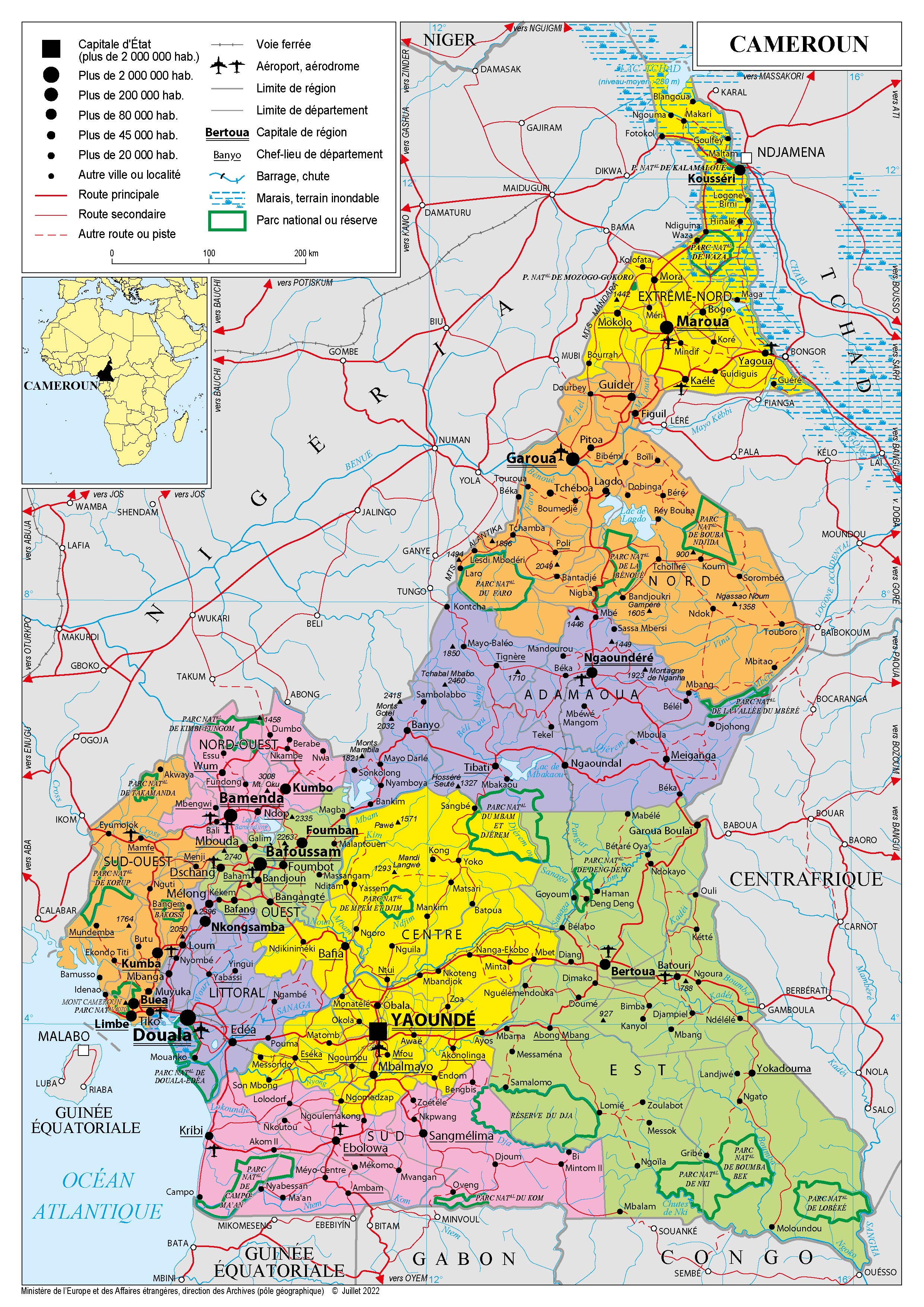 Cameroun Navigation latérale fiche pays Dans cette rubrique Cameroun Présentation du Cameroun Conseils aux voyageurs Dernières minutes et alertes Sécurité Entrée / séjour Santé Informations utiles Voyages d'affaires Contacts utiles Politique et économie Relations bilatérales Présentation du Cameroun Date de mise à jour le : 21 janvier 2026 Information toujours valable à la date du jour Présentation du pays Données générales Nom officiel : République du Cameroun / Republic of CameroonNature du régime : RépubliqueChef d’État : M. Paul Biya, Président de la RépubliqueChef du gouvernement : M. Joseph Dion Nguté, Premier ministre Données géographiques Superficie : 475 442 km²Capitale : YaoundéVilles principales : Douala, Yaoundé, Bafoussam, Garoua, MarouaLangue officielle : français, anglais Monnaie : Franc CFA (1EUR = 655,43 XAF)Fête nationale : 20 mai Données démographiques Population : 27,9 millions d’habitants (2022)Croissance démographique : 2,6 % (2022)Espérance de vie : 60 ans (2021)Religion(s) : Christianisme (35-40 %), Islam (15-20 %), animisme (45 %)Indice de développement humain : 151e (PNUD, 2021) Politique intérieure Le Rassemblement démocratique du peuple camerounais (RDPC), parti du Président Paul Biya, au pouvoir depuis 1982, a largement remporté les derniers scrutins électoraux. Le Président Biya a été reconduit dans ses fonctions lors de la présidentielle du 7 octobre 2018, où il a remporté 71,28 % des suffrages exprimés. Maurice Kamto est arrivé en deuxième position avec 14,23 % des voix, tandis que Cabral Libii et Joshua Osih ont recueilli respectivement 6,28 % et 3,35 % des suffrages. Le RDPC a obtenu 84 % des sièges à l’Assemblée nationale et 87 % des sièges de conseillers municipaux lors des élections législatives et municipales de février 2020. Les élections régionales, qui se sont déroulées pour la première fois au Cameroun le 6 décembre 2020, ont également vu la victoire du RDPC sur la majeure partie du territoire (9 régions sur 10). Une partie de l’opposition, dont le Mouvement pour la renaissance du Cameroun (MRC) de Maurice Kamto, a boycotté les scrutins législatifs, municipal et régional. Après avoir appelé à la mobilisation pour une manifestation interdite le 22 septembre 2020, Maurice Kamto a été assigné à résidence, jusqu’au lendemain des élections régionales. De nombreux militants du MRC ont été arrêtés et plusieurs d’entre eux sont encore en détention. Maurice Kamto avait déjà été inculpé en janvier 2019 pour « rébellion, insurrection et hostilité contre la patrie » suite à la tenue de manifestations interdites, et incarcéré plusieurs mois. Depuis novembre 2016, les régions anglophones du Nord-Ouest et du Sud-Ouest (NOSO) du Cameroun connaissent des mouvements de contestation, animés par des revendications d’indépendance, qui ont évolué en affrontements armés opposant les forces camerounaises aux sécessionnistes. La dégradation de la situation sécuritaire s’est accompagnée de nombreuses violations des droits de l’Homme, a provoqué une grave crise humanitaire et entravé les activités économiques dans ces régions. Un « Grand dialogue national », conduit par le Premier ministre, a été organisé à l’automne 2019. Dans la foulée, une loi sur la promotion des langues officielles et une autre portant code général des collectivités territoriales décentralisées, qui prévoit notamment la mise en place d’un statut spécial pour les régions du NOSO, ont été adoptées. Politique étrangère Par sa situation géographique, le Cameroun est la porte d’entrée naturelle de l’Afrique centrale, désenclavant la République centrafricaine et le Tchad. Les attaques menées depuis 2013 par le groupe terroriste Boko Haram ont conduit les autorités camerounaises à renforcer le dispositif militaire dans le Nord du pays. L’action du Cameroun s’inscrit notamment dans le cadre de la Force multinationale Mixte (FMM), mise en place en 2015 par les pays de la région (Nigéria, Niger, Tchad, Cameroun et Bénin), en déployant environ 2 000 hommes dans l’Extrême-Nord. Celle-ci a contribué à réduire la pression exercée par Boko Haram, mais la menace demeure active. Le Cameroun accueille sur son territoire environ 118 000 réfugiés nigérians. Le Cameroun, qui partage une frontière de près de 800 km avec la République centrafricaine, contribue à la MINUSCA à hauteur d’un bataillon (750 hommes) et de près de 280 forces de sécurité. Principale voie de communication commerciale de la RCA avec l’extérieur, via le port de Douala, le Cameroun accueille près de 350 000 réfugiés centrafricains sur son territoire. Le Cameroun a accueilli, en juin 2013, le sommet des chefs d’État et de gouvernement de la Communauté économique des États de l’Afrique de l’Ouest (CEDEAO), de la Communauté économique des États de l’Afrique centrale (CEEAC) et de la Commission du golfe de Guinée sur la sûreté et la sécurité maritime dans le golfe de Guinée. Au cours de ce sommet, une architecture régionale de lutte contre la piraterie a été adoptée, coiffée par le centre interrégional de coordination (CIC), inauguré à Yaoundé et officiellement actif depuis 2017. Membre de l’Organisation de la conférence islamique (OCI) depuis 1975, Yaoundé a rejoint l’Organisation internationale de la Francophonie (OIF) en 1991 et le Commonwealth en 1995. Yaoundé a ratifié en juillet 2014 un accord de partenariat économique intérimaire avec l’Union européenne, entré en vigueur en août 2016. Le Cameroun a bénéficié d’une enveloppe de 282 millions EUR au titre du 11e FED (2014-2020). Un programme indicatif pluriannuel de 178 millions EUR a été adopté pour la période 2021-2024, qui identifie trois priorités : (i) la gouvernance, la démocratisation, la paix et la stabilisation (36M€), (ii) la croissance inclu