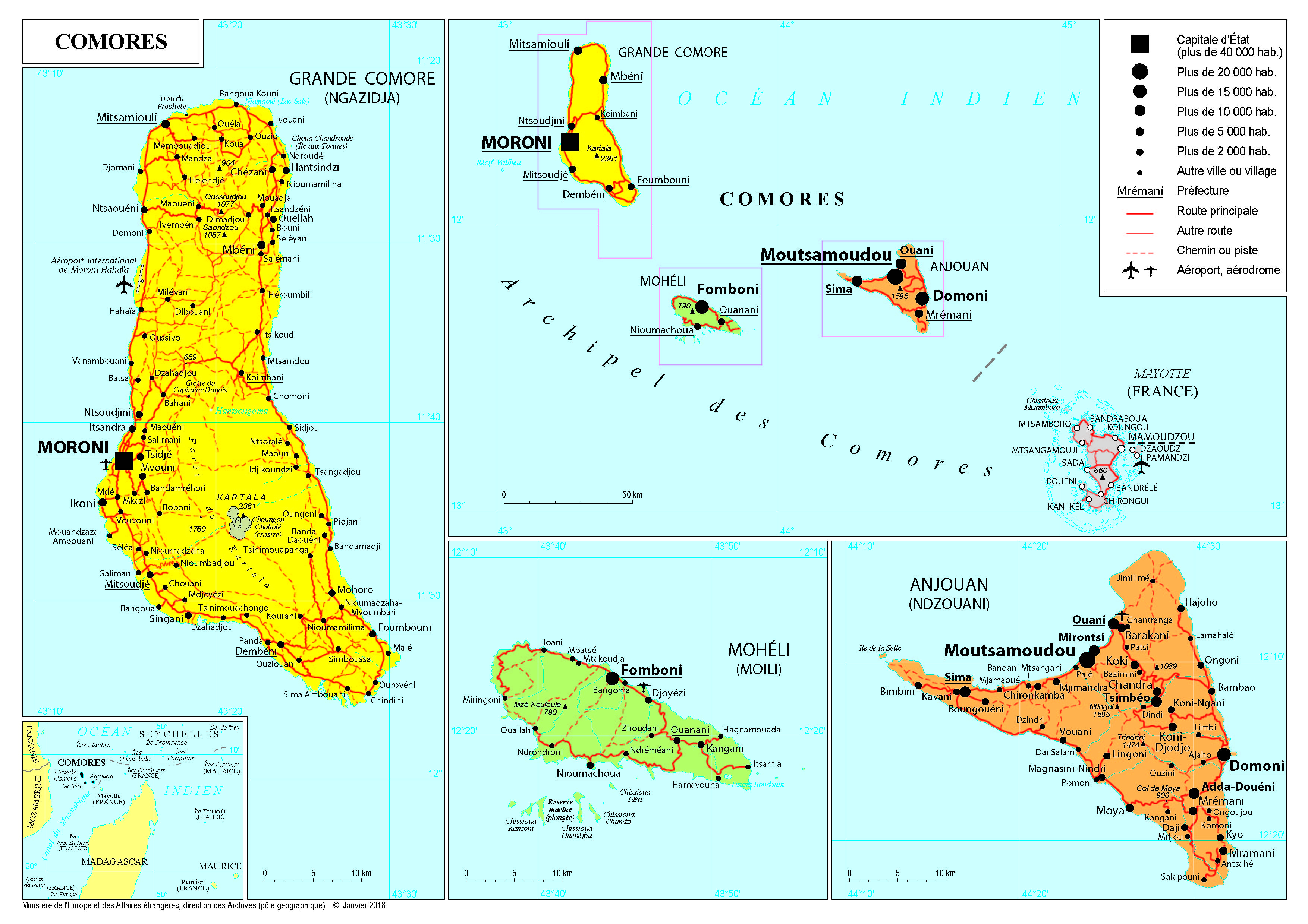 Comores Navigation latérale fiche pays Dans cette rubrique Comores Présentation des Comores Conseils aux voyageurs Dernières minutes et alertes Sécurité Entrée / séjour Santé Informations utiles Voyages d'affaires Contacts utiles Politique et économie Relations bilatérales Présentation des Comores Date de mise à jour le : 21 janvier 2026 Information toujours valable à la date du jour Présentation du pays Données générales Nom officiel : Union des ComoresNature du régime : présidentielChef de l’État et du gouvernement : AZALI Assoumani, depuis le 26 mai 2016, réélu le 27 mars 2019 puis le 14 janvier 2024. Données géographiques Superficie : 1862 km²Capitale : MoroniVilles principales : Moroni (Grande Comore), Mutsamudu (Anjouan), Fomboni (Mohéli)Langues officielles : comorien, français, arabe Langues courantes : comorien, françaisMonnaie : franc comorien (492 FC = 1 €, taux fixe, zone franc)Fête nationale : 6 juillet (indépendance en 1975) Données démographiques Population : 870 000 (Banque mondiale, 2024)Population vivant à l’étranger : 562 000 (Banque mondiale, 2015)Densité : 441 habitants/km² (Banque mondiale, 2021)Croissance démographique : 1,8 % (Banque mondiale, 2022)Espérance de vie à la naissance : 63,7 ans (PNUD, 2022)Taux d’alphabétisation (population des 15-24 ans) : 82 % (Banque mondiale, 2022)Religions : islam sunnite de rite chaféite (98 %, religion officielle), catholicisme (2 %)Indice de développement humain : 152ème sur 189 pays (PNUD, 2022)Indice de gouvernance Mo Ibrahim : 40ème sur 54 pays (2023) Politique intérieure Depuis son indépendance en 1975, l’Union des Comores a connu plusieurs coups d’État et crises indépendantistes. Celles d’Anjouan en 1996, puis de Mohéli en 1997, ont été résolues en 2001 par l’« Accord-cadre de réconciliation de Fomboni » et l’adoption d’une nouvelle Constitution accordant une grande autonomie à chaque île et un calendrier quinquennal de présidence tournante entre les trois îles.Après la réforme constitutionnelle de 2018 adoptée par référendum, des élections présidentielles se sont déroulées le dimanche 24 mars 2019 et ont donné Azali Assoumani vainqueur avec 59,05 % des voix. Les scrutins locaux (élections des Gouverneurs des îles en 2019, élections législatives et municipales en 2020 - boycottées par l’opposition) confirment cette victoire de la mouvance présidentielle. Le Président Azali a été réélu le 14 janvier 2024 avec 62,97 % des votes contre 20,26 % pour le candidat arrivé en deuxième position, Salim Issa Abdillah (parti JUWA).Les élections des gouverneurs, tenues le même jour, ont proclamé vainqueurs trois candidats du parti présidentiel : Zaidou Youssouf à la tête de l’île d’Anjouan, Mze Mohamed Ibrahim pour l’île de Grande Comore et Chamina Ben Mohamed pour l’île de Mohéli. Les élections législatives qui se sont tenues en janvier 2025 ont confirmé le contrôle du parti présidentiel sur l’Assemblée nationale avec 31 sièges sur 33 obtenus par la CRC (Convention pour le renouveau des Comores). Politique étrangère L’Union des Comores appartient à l’Organisation de la Conférence islamique et à la Ligue arabe. Elle fait partie du Marché commun d’Afrique Orientale et Australe (COMESA), de la Commission de l’océan Indien (COI, dont elle assure la présidence en 2025-2026), de l’Association des États riverains de l’océan Indien (IORA) et de la Communauté de développement d’Afrique australe (SADC). L’Union des Comores est également membre de l’Organisation mondiale du commerce (OMC) depuis le 27 février 2024. Entre 2006 et 2011, le Président Sambi a développé des relations avec les pays arabes (Arabie saoudite, Émirats arabes unis, Koweït, Qatar, Libye) et l’Iran, avec la signature de plusieurs accords de coopération et l’amorce d’une coopération militaire. L’Union des Comores a depuis rompu ses relations avec l’Iran (2016) puis avec le Qatar (7 juin 2017), en soutien à l’Arabie saoudite. Les relations avec la Chine se sont fortement développées (construction d’infrastructures, appui dans le secteur de la santé, actions de formation professionnelle, aide budgétaire). L’Union européenne est le premier partenaire économique et commercial des Comores tant pour les importations (26,2 % des importations comoriennes) que pour les exportations (44,1 % des exportations comoriennes) et les IDE entrants. Les échanges avec l’UE sont favorisés par un Accord de Partenariat économique intermédiaire ratifié par les Comores en 2019. Situation économique PIB : 1 242 519,41 milliards de dollars courants, classé au rang des pays « à revenu intermédiaire de tranche inférieure » (BM 2022)PIB par habitant (en dollars courants) : 1 484,9 (BM 2022)Taux de croissance du PIB : 2,4 % (BM 2022)Taux d’inflation : 12,4 % (BM 2022)Déficit budgétaire : 3,6 % du PIB (Direction Général du Trésor français, 2022)Déficit commercial : 16,9 % du PIB (Direction Général du Trésor français, 2022)Climat des affaires : 164ème sur 190 pays (classement Doing Business 2022)Exportations : UE, Inde, Madagascar, Émirats arabes unisImportations : UE, Émirats arabes unis, Pakistan, Chine Les Comores ont été admises, en 2019, au rang des pays à revenu intermédiaire de tranche inférieure. Près de 45 % de la population vit sous le seuil de pauvreté (Banque mondiale, 2024) et le revenu par habitant reste faible. Le pays figure au 152ème rang sur 189 en termes d’indice de développement humain (IDH, 2022).L’économie comorienne se caractérise par : L’agriculture, qui représente 32 % du PIB, repose sur trois produits principaux : vanille, girofle et ylang-ylang. L’industrie (12 % du PIB) est peu développée. Les services (55 % du PIB) correspondent principalement à des activités de commerce et d’hôtellerie-restauration. En 2024, l’économie des Comores 