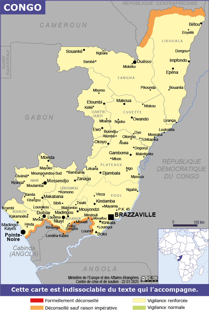 Congo Navigation latérale fiche pays Dans cette rubrique Congo Présentation du Congo Conseils aux voyageurs Dernières minutes et alertes Sécurité Entrée / séjour Santé Informations utiles Voyages d'affaires Contacts utiles Politique et économie Relations bilatérales Sécurité Date de mise à jour le : 07 avril 2026 Information toujours valable à la date du jour Imprimer Imprimer Vous voyagez à l'étranger ? Pour recevoir des alertes, inscrivez-vous sur Fil d'Ariane. S'inscrire sur Fil d'Ariane Donnez-nous votre avis Aidez-nous à améliorer notre service en répondant à notre enquête. Répondre à l'enquête utilisateurs Fermer Vérifiez que vous êtes bien assurés Avant de voyager, il est indispensable de vérifier que vous êtes bien assuré Quelle est la portée des Conseils aux Voyageurs ? Zones de vigilance Dernière actualisation le 05/03/2026, information toujours valable à la date du jour Zones déconseillées sauf raison impérative (en orange sur la carte) Frontière nord avec la République Centrafricaine (RCA) Il est déconseillé, sauf raison impérative, de se rendre dans une bande de 30 km de large le long de la frontière entre la République du Congo et le sud de la RCA, en raison de la situation sécuritaire en RCA, de la porosité des frontières, et de la présence dans cette zone de délinquants, braconniers et trafiquants. Frontières sud avec la République démocratique du Congo (RDC) et le Cabinda (Angola) La zone frontalière avec, d’une part, le Cabinda (Angola) et, d’autre part, la RDC, au sud du pays, est un foyer d’insécurité potentiel, en raison de la porosité des frontières et de l’existence de nombreux trafics. Les déplacements dans cette zone, à l’intérieur d’une bande frontalière de 10 km de large, sont déconseillés sauf raison impérative. Frontières avec les autres pays voisins Plus généralement, toutes les frontières terrestres avec les pays voisins (Cameroun, Gabon, RDC) sont des zones potentiellement à risque, en raison des trafics qui peuvent s’y dérouler. Le franchissement inopiné d’une frontière peut conduire à une arrestation sur un territoire pour lequel le voyageur ne dispose pas de visa. Zones en vigilance renforcée (en jaune sur la carte) Une vigilance renforcée s’impose sur l’ensemble du territoire de la République du Congo, et plus particulièrement dans le département du Pool. Région limitrophe du département de la Bouenza et du Pool Le département du Pool, situé au sud du pays près de la capitale, a été le théâtre d’agitations et d’affrontements armés depuis les années 1990. La situation dans la région s’est progressivement stabilisée après la signature d’un accord de cessez-le-feu, en décembre 2017. Le trafic routier est revenu à la normale sur les grands axes, et le trafic marchandises a repris sur la ligne de chemin de fer Congo-Océan (CFCO) qui relie Brazzaville à Pointe. Il est désormais possible de se déplacer dans le département du Pool, en empruntant notamment la RN1 Brazzaville-Kinkala-Mindouli-Dolisie-Pointe-Noire ainsi que l’axe qui part de PK 45 au nord de Brazzaville et rejoint la RN1 à Mindouli. Une vigilance accrue est cependant recommandée sur ces axes, comme dans l’ensemble du département du Pool, en raison du non-achèvement du processus de désarmement, démobilisation et réinsertion des ex-rebelles, toujours présents dans la zone. Comme sur l’ensemble du territoire, les déplacements interurbains doivent impérativement être effectués de jour, en convoi de deux véhicules 4x4 en bon état et bien équipés (équipements de secours, eau, alimentation, réserve de carburant, moyens de communication satellites). Les déplacements en dehors de l’axe RN1 doivent être soigneusement préparés, tout déplacement de nuit étant prohibé sauf nécessité impérative. Il est prudent de rendre visite aux autorités administratives ou traditionnelles locales, généralement très accessibles, pour signaler sa présence. Brazzaville Le niveau d’insécurité est faible, notamment dans les quartiers du centre où séjournent la plupart des étrangers. Il convient néanmoins d’être vigilant lors des déplacements nocturnes et de circuler avec prudence. Des barrières de contrôle tenues par la force publique sont en effet mises en place, y compris dans le centre-ville, dès qu’un regain de tensions est observé (périodes électorales notamment). Il convient d’être particulièrement vigilant dans les quartiers excentrés de la ville. Pointe-Noire La criminalité dans le centre-ville de Pointe-Noire est limitée. Il convient néanmoins de rester vigilant : sur le front de mer. Les promenades sur la plage au-delà de l’ancien wharf, vers le sud, sont déconseillées à toute heure de la journée et de la nuit, en raison de la présence régulière de groupes de délinquants. dans les quartiers périphériques de Pointe-Noire. dans le centre-ville, la nuit, en raison de la circulation automobile dangereuse (nombreux excès de vitesse, conducteurs en état d’ébriété). sur la route de Dolisie. La traversée du massif de Mayombe n’est pas sans danger, en raison du trafic des grumiers, de la vitesse excessive des véhicules ou de leur mauvais entretien, qui peuvent provoquer des accidents graves. Risques encourus et recommandations associées Il est recommandé aux voyageurs français, avant un voyage de moins de 6 mois en République du Congo, de s’inscrire sur la plateforme Ariane, ce qui permet de recevoir des alertes de sécurité. Lors de ses déplacements en ville, il est conseillé de toujours avoir sur soi la photocopie de son passeport (y compris la page avec le visa) et de conserver son passeport original au domicile. En revanche, lors des déplacements interurbains, il est vivement recommandé de se munir de l’original du passeport contenant le visa. L’impossibilité de présenter le passeport lors d