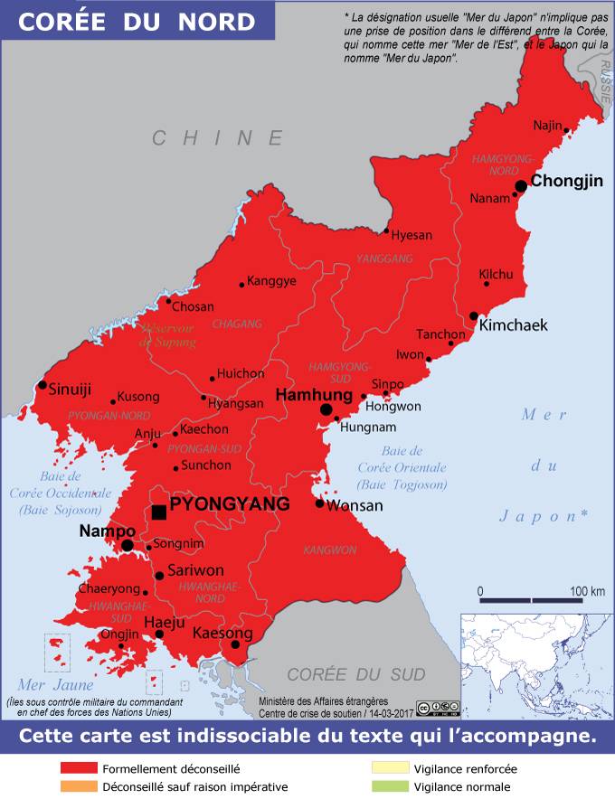 Corée du Nord Navigation latérale fiche pays Dans cette rubrique Corée du Nord Présentation de la Corée du Nord Conseils aux voyageurs Dernières minutes et alertes Sécurité Entrée / séjour Santé Informations utiles Contacts utiles Politique et économie Relations bilatérales Sécurité Date de mise à jour le : 27 mars 2026 Information toujours valable à la date du jour Imprimer Imprimer Vous voyagez à l'étranger ? Pour recevoir des alertes, inscrivez-vous sur Fil d'Ariane. S'inscrire sur Fil d'Ariane Donnez-nous votre avis Aidez-nous à améliorer notre service en répondant à notre enquête. Répondre à l'enquête utilisateurs Fermer Vérifiez que vous êtes bien assurés Avant de voyager, il est indispensable de vérifier que vous êtes bien assuré Quelle est la portée des Conseils aux Voyageurs ? Zones de vigilance Dernière actualisation le 05/03/2026, information toujours valable à la date du jour L’intégralité du territoire nord-coréen est formellement déconseillée (rouge sur la carte des Conseils aux voyageurs). La France n’a pas de relations diplomatiques avec la République populaire démocratique de Corée (RPDC). En cas de difficulté, l’ambassade de France en Chine est compétente pour porter assistance aux Français se trouvant en Corée du Nord, sous réserve des contraintes pouvant être imposées par les autorités nord-coréennes. Le caractère répressif du régime nord-coréen, le non-respect des droits et des libertés des individus, la poursuite de tirs balistiques et d’essais nucléaires et l’attitude de provocation vis-à-vis de la communauté internationale créent un climat d’incertitude et d’imprévisibilité. Les déplacements en Corée du Nord sont formellement déconseillés jusqu’à nouvel ordre. Risques encourus et recommandations associées Recommandations et interdictions Les voyageurs doivent veiller à ne pas exprimer de critiques et d’observations relatives au système politique et son dirigeant. Des gestes en apparence bénins peuvent être considérés par les autorités nord-coréennes comme un manque de respect et un crime grave passible de lourdes peines. Les motifs de détention ne sont pas systématiquement notifiés et les procédures prévues par la loi ne sont généralement pas respectées. En cas d’arrestation, aucune assistance juridique n’est prévue pour les ressortissants étrangers ; les autorités nord-coréennes se réservent le droit de refuser les visites consulaires. Toute activité non autorisée de nature politique ou religieuse, y compris la possession de bibles ou autres documents à caractère religieux, risque d’entraîner une interpellation. Les étrangers peuvent être verbalisés, voire arrêtés, s’ils sont surpris en train d’effectuer des achats dans des magasins non autorisés aux touristes ou des opérations de change de devises dans des bureaux non-officiels.Les autorités nord-coréennes cherchent à décourager tout contact entre les Coréens du Nord et les étrangers. Voyage en avion à destination de la Corée du Nord Pyongyang est desservie depuis Pékin par Air China et Air Koryo, compagnie aérienne nationale de Corée du Nord. Air Koryo exploite également des lignes régulières vers Shenyang et Vladivostok et des vols occasionnels vers d’autres villes de Corée du Nord. Tous les aéronefs exploités par Air Koryo, à l’exception de deux Tupolev 204, se sont vu refuser l’autorisation d’exploiter des services vers l’UE pour violation des normes de sécurité internationales. Des incidents récurrents affectent les vols de cette compagnie. Les dispositifs de prise en charge et d’accompagnement des voyageurs ne sont pas suffisants. Il est conseillé aux voyageurs étrangers d’éviter d’utiliser Air Koryo tant que les conditions de sécurité essentielles ne seront pas respectées. Situation d’urgence En cas de crise ouverte, les possibilités d’évacuation sont limitées. Les liaisons aériennes sont peu nombreuses et insatisfaisantes en termes de sécurité. Les routes menant aux frontières chinoises ou russes sont en mauvais état et susceptibles de devenir rapidement congestionnées. Des autorisations de circulation sont nécessaires. Risques naturels La mousson s’étend de la fin juin à août. Les pluies diluviennes peuvent causer des inondations et des glissements de terrain. Les typhons peuvent se produire en août et en septembre. Ces tempêtes peuvent être très meurtrières et endommager considérablement les infrastructures. Les voyageurs doivent se tenir informés des prévisions météorologiques régionales avant un déplacement en Corée du Nord et sont invités à consulter la rubrique Risques naturels. Produits stupéfiants La possession, la consommation et le trafic de produits stupéfiants entraînent des sanctions sévères. Les personnes reconnues coupables peuvent être condamnées à des amendes élevées ainsi qu’à des peines d’emprisonnement.