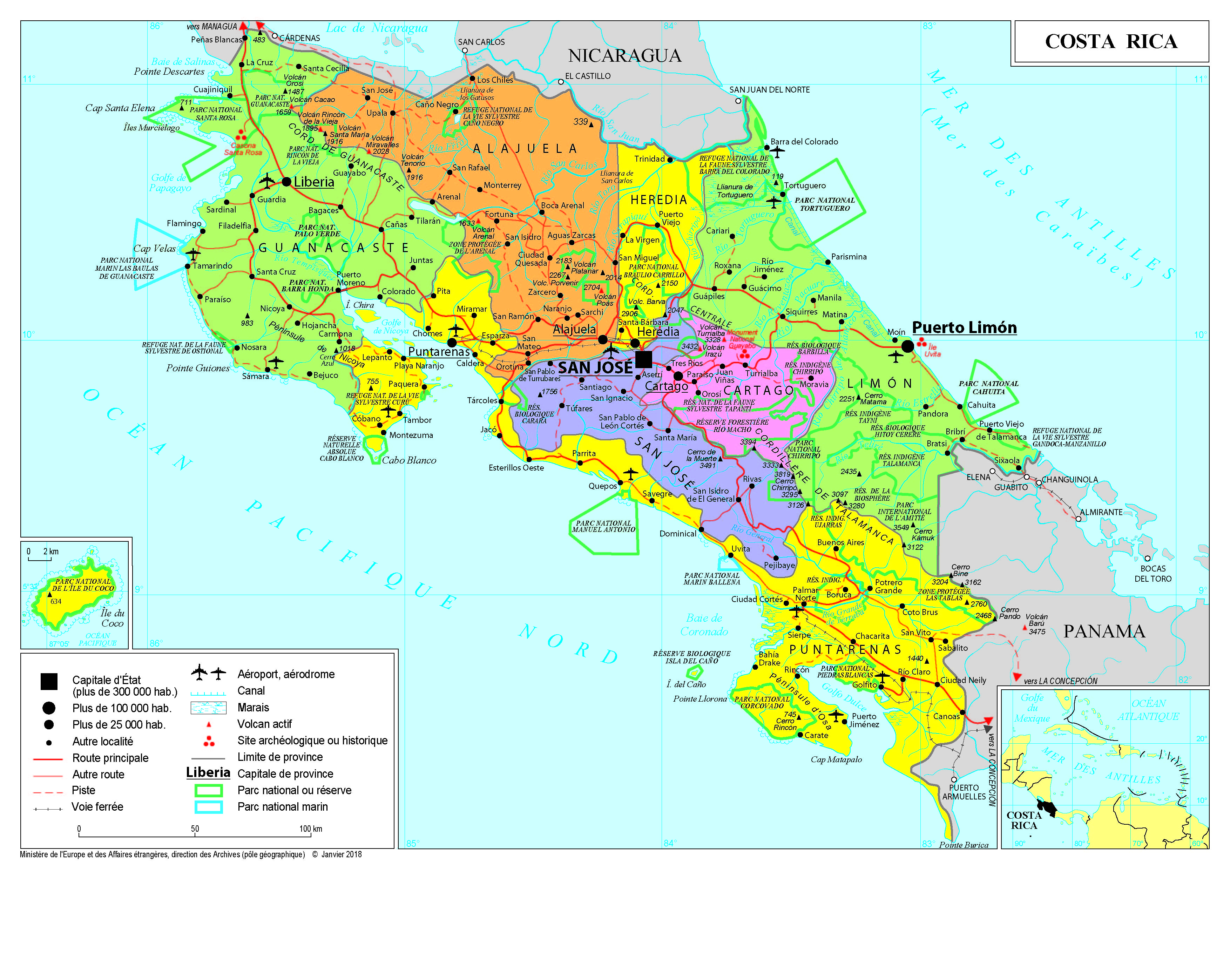 Costa Rica Navigation latérale fiche pays Dans cette rubrique Costa Rica Présentation du Costa Rica Conseils aux voyageurs Dernières minutes et alertes Sécurité Entrée / séjour Santé Informations utiles Voyages d'affaires Contacts utiles Politique et économie Relations bilatérales Présentation du Costa Rica Date de mise à jour le : 16 janvier 2026 Information toujours valable à la date du jour Présentation du pays Données générales Nom officiel : République du Costa RicaNature du régime : république démocratique unitaire dotée d’un régime présidentielChef de l’État (et du gouvernement) : Rodrigo Chaves Robles Données géographiques Superficie : 51 100 km²Capitale : San JoseVilles principales : Alajuela, Cartago, Heredia, Liberia, Puerto Limón, PuntarenaLangue officielle : espagnolMonnaie : Colón costaricienFête nationale : 15 septembre Données démographiques Population : 5 180 829 habitants (Banque mondiale 2022)Densité : 100 hab/km² (Banque mondiale 2020)Croissance démographique : 0,5 % (Banque mondiale 2022)Espérance de vie : 77 ans (Banque mondiale, 2022)Taux d’alphabétisation : 98 % (Banque mondiale, 2021)Religion (s) : catholique (47,5%), évangélique ou pentecôtiste (19,8%), témoins de Jéhovah (1,4%), protestantisme (1,2%)Indice de développement humain : 0,810 (62ème rang mondial PNUD, 2019) Politique intérieure Rodrigo Chaves Robles a été élu président le 3 avril 2022, avec 52,9% des voix, succédant à Carlos Alvarado (2018-2022). Economiste de formation, Rodrigo Chaves a travaillé pendant 27 ans au sein de la Banque Mondiale. Alors qu’il était encore peu du monde politique, il avait été nommé ministre de l’Economie du gouvernement Alvarado en novembre 2019 – poste duquel il avait démissionné au bout de 6 mois, avant de rejoindre le parti progrès social démocratique (PSD). Libéral sur les sujets économiques, il est conservateur sur les sujets sociétaux, s’opposant notamment à l’avortement et à la « théorie du genre ». Rodrigo Chaves doit composer avec une Assemblée législative morcelée et profondément renouvelée suite aux élections législatives du 6 février 2022. Le parti de la libération nationale (PLN - opposition) dispose du principal groupe parlementaire (19 députés) tandis que le parti présidentiel, Progrès social démocratique (PSD), ne détient que 10 sièges sur les 57 que compte l’Assemblée. La lutte contre la criminalité (record de 907 homicides en 2023) est devenue une priorité du gouvernement. En avril 2023, le président Chaves a présenté un plan visant à lutter contre la hausse de la criminalité, qui prévoit notamment une augmentation des effectifs policiers et la création d’un centre de commandement et de contrôle. La crise migratoire à laquelle est confronté le pays (en 2023, près de 400 000 personnes ont franchi la frontière entre le Panama et le Costa Rica, contre 248 000 en 2022) est considérée comme une urgence nationale (décret exécutif du 29/09/2023). Situation économique Le Costa Rica présente une situation économique enviable en Amérique centrale, dont il a longtemps été le pôle de stabilité. Il s’est doté d’un système de protection sociale de haut niveau et a réussi à réduire fortement la pauvreté (le PIB par habitant est l’un des plus élevés d’Amérique latine). Le niveau général d’éducation et la qualification de la main-d’œuvre costaricienne sont les principaux avantages comparatifs de ce pays dans la région.Après une décennie de croissance régulière et de diversification, le Costa Rica a intégré l’OCDE en mai 2021. Le pays s’est doté en 2019 d’un plan national de décarbonation, qui fixe des objectifs ambitieux en matière de transition énergétique d’ici 2050, en particulier dans les domaines des transports et de l’industrie. La crise sanitaire a accentué la dégradation des finances publiques (endettement à 68% du PIB en 2022) et conduit à une augmentation du taux de chômage (24%) et de la pauvreté (23%). L’économie a néanmoins retrouvé son niveau d’avant-crise grâce à la reprise des échanges commerciaux et la relance du tourisme (13,2% du PIB). Le Costa Rica a enregistré le taux de croissance le plus élevé des pays de l’OCDE en 2023 (5%) et l’inflation, estimée à 5% en 2023, est en recul. Ces résultats économiques favorables – obtenus grâce à une réduction drastique des investissements publics ces dernières années – ont cependant contribué à creuser les inégalités économiques et sociales. L’accès aux financements internationaux revêt une importance cruciale pour le pays. L’Etat a emprunté 1,5 Mds $ en 2020 et signé en 2021 avec le FMI une facilité d’1,8 Md $. Le pays bénéficie également d’un prêt de 725 M$ au titre de la Facilité pour la résilience et la durabilité (FRD) du FMI. L’assainissement des finances publiques, la réduction du coût de la vie et l’allègement des procédures administratives entravant l’action du secteur privé constituent les priorités économiques du gouvernement. Liste des représentations françaises Ambassade de France au Costa Rica De la Mitsubishi - 200m sur y 25m oeste Curridabat 10177 San José, San José 1000 Costa Rica Tel : +506 22 34 42 01 Ambassade de France au Costa Rica Réseaux sociaux Facebook X YouTube