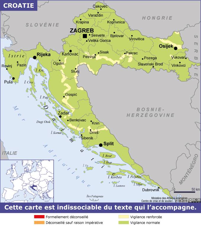Croatie Navigation latérale fiche pays Dans cette rubrique Croatie Présentation de la Croatie Conseils aux voyageurs Dernières minutes et alertes Sécurité Entrée / séjour Santé Informations utiles Voyages d'affaires Contacts utiles Politique et économie Relations bilatérales Sécurité Date de mise à jour le : 27 mars 2026 Information toujours valable à la date du jour Imprimer Imprimer Vous voyagez à l'étranger ? Pour recevoir des alertes, inscrivez-vous sur Fil d'Ariane. S'inscrire sur Fil d'Ariane Donnez-nous votre avis Aidez-nous à améliorer notre service en répondant à notre enquête. Répondre à l'enquête utilisateurs Fermer Vérifiez que vous êtes bien assurés Avant de voyager, il est indispensable de vérifier que vous êtes bien assuré Quelle est la portée des Conseils aux Voyageurs ? Zones de vigilance Dernière actualisation le 05/03/2026, information toujours valable à la date du jour L’ensemble du territoire croate est placé en vigilance normale (vert), à l’exception des régions minées qui figurent en vigilance renforcée (jaune) sur la carte sécuritaire ci-dessous. Présence de mines Il demeure un petit nombre de zones minées en Croatie, résultant du conflit des années 1991-1995. Selon les informations de la direction de la sécurité civile, environ 8800 mines subsistent encore dans un territoire qui englobe 4 comtés et 23 villes et municipalités et représente, en tout, 71,3 kilomètres carrés. Les sites dangereux sont signalés par 3250 panneaux. Ce sont à 98% des forêts et des zones forestières, les installations civiles, les bâtiments d’exploitation et presque toutes les terres agricoles arables ayant été déminés. La carte des zones minées, actualisée en temps réel, est désormais accessible sur une application gratuite, MINE.info (téléchargeable sur les plateformes habituelles). Pour des informations précises, consulter le site du Centre croate pour le déminage (en anglais), ou contacter le Bureau gouvernemental pour le déminage (00385/0 1 630 39 90, info@mine.vlada.hr). Risques encourus et recommandations associées Risques naturels Risque sismique La Croatie est une terre sismique dans le prolongement de l’Italie du nord et des Balkans du sud. Elle est entièrement traversée par une ceinture sismique de Dubrovnik à Zadar, avec un prolongement vers Zagreb. Le risque sismique moyen est de 3 à 4 sur une échelle de 5. Chaque année sont enregistrées des secousses d’intensité faible à modérée. Un séisme d’une magnitude de 6,4 s’est produit dans le centre de la Croatie le 29 décembre 2020, suivi de nombreuses répliques. En cas de séisme, il convient de se conformer aux instructions des autorités locales. Pour plus d’informations sur la conduite à tenir en cas de séisme, consulter la fiche Séismes. Risque de feux de forêt D’importants feux de forêt sévissent pendant la période estivale, en particulier le long du littoral. Il convient donc de faire preuve d’une vigilance accrue et de respecter les mesures de prévention contre le déclenchement des incendies. Manifestations et rassemblements Les grands rassemblements nationalistes ou sportifs, particulièrement ceux liés au football, peuvent être l’occasion de violences. Pendant la période estivale, les festivaliers sont incités à faire preuve de la plus grande vigilance pour éviter les comportements à risque et l’effet d’entraînement de groupe. En raison de la présence de mines proches de la zone de certains festivals, notamment le « Momento Demento », il est recommandé de ne pas s’éloigner des lieux balisés. Délinquance La délinquance de voie publique (vols, agressions, violences) est limitée. Il convient d’appliquer des règles de prudence élémentaire (voir rubrique « Recommandations générales » ci-dessous), en particulier pendant la période touristique, dans les zones de forte affluence, et sur la côte (présence notamment de pickpockets). Risque industriel La centrale de Krško (copropriété de la Croatie et de la Slovénie), située en Slovénie, est située sur une faille sismique. Elle se trouve sur la rive gauche de la rivière Sava (3km de la ville de Krško), à 70 km à l’est de Ljubljana et 35 km au nord de Zagreb. Recommandations générales De manière générale, il est recommandé de : Veiller à ce que ses documents d’identité soient en cours de validité et n’aient pas été déclarés perdus ou volés. Les autorités croates confisquent, lors des contrôles, les documents qui ont été déclarés perdus ou volés. Il est alors nécessaire de se faire établir un laissez-passer consulaire pour rentrer en France ; Dans les zones identifiées comme minées : prêter la plus grande attention aux pancartes et écriteaux, ne pas s’écarter des routes principales ou des chemins balisés, ne pas camper dans des maisons abandonnées ou sur des terrains proches et se renseigner localement sur les conditions de sécurité et de circulation. Afin de mieux anticiper les situations d’urgence : S’enregistrer sur le fil d’Ariane du ministère de l’Europe et des affaires étrangères pour pouvoir être facilement contacté par les autorités françaises en cas de besoin. Consulter les réseaux sociaux de la protection civile croate (DUZS) : Facebook et X (en anglais et croate). Consulter le site en anglais du centre d’information de l’Autoclub croate (HAK), qui fournit en temps réel des informations relatives aux conditions de circulation, y compris aux postes-frontières. Conserver sur soi le numéro de sa compagnie d’assurance, ainsi que les numéros d’urgence européens et croates (voir ci-contre). Activités sportives à risque Pratique d’activités sportives à risque De nombreux accidents surviennent chaque été. Il est important de bien respecter les précautions indispensables à la pratique des sports à risque en Croatie (canyoning, plongée, escalade, del