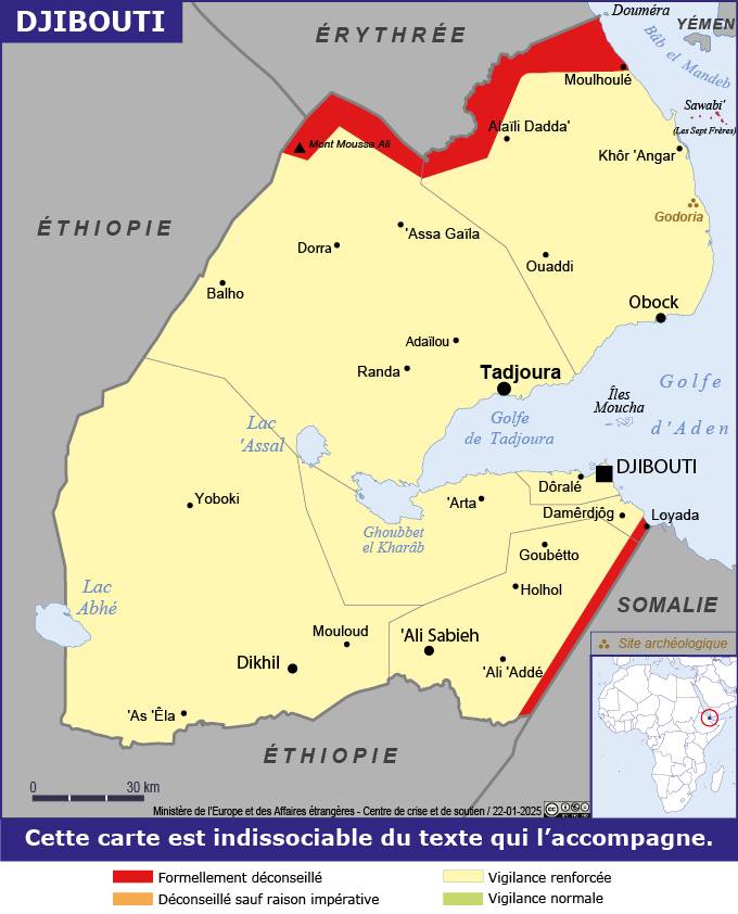 Djibouti Navigation latérale fiche pays Dans cette rubrique Djibouti Présentation de Djibouti Conseils aux voyageurs Dernières minutes et alertes Sécurité Entrée / séjour Santé Informations utiles Voyages d'affaires Contacts utiles Politique et économie Relations bilatérales Sécurité Date de mise à jour le : 02 avril 2026 Information toujours valable à la date du jour Imprimer Imprimer Vous voyagez à l'étranger ? Pour recevoir des alertes, inscrivez-vous sur Fil d'Ariane. S'inscrire sur Fil d'Ariane Donnez-nous votre avis Aidez-nous à améliorer notre service en répondant à notre enquête. Répondre à l'enquête utilisateurs Fermer Vérifiez que vous êtes bien assurés Avant de voyager, il est indispensable de vérifier que vous êtes bien assuré Quelle est la portée des Conseils aux Voyageurs ? Zones de vigilance Dernière actualisation le 05/03/2026, information toujours valable à la date du jour Zones formellement déconseillées (en rouge sur la carte) Il est possible de circuler librement dans le pays mais les frontières terrestres et maritimes sont à éviter. Au nord, en raison du différend frontalier entre l’Érythrée et Djibouti, il demeure formellement déconseillé d’approcher la zone frontalière par voie terrestre, maritime ou aérienne. Au sud-est du pays, les délimitations frontalières entre Djibouti et le Somaliland sont incertaines. Après le "Refuge Décan", la zone traversée par la route venant de Djibouti en direction de la ville frontière de Loyada est à éviter car elle n’offre pas toutes les conditions de sécurité. Piraterie maritime Malgré des améliorations récentes liées à une forte présence aérienne et navale internationale et à l’armement des navires marchands, les attaques avec prises d’otages restent possibles. Les actes de piraterie maritime peuvent avoir lieu à partir du détroit de Bab el Mandeb, dans le golfe d’Aden et le long des côtes somaliennes ou yéménites ainsi que dans une grande partie du nord-ouest de l’océan Indien. La navigation au sud de la mer Rouge, dans le golfe d’Aden et au large de la Corne de l’Afrique est fortement déconseillée, notamment aux navires dont la vitesse est inférieure à 15 nœuds et dont le franc-bord est bas sur l’eau (hauteur inférieure à 2 mètres). Ils représentent des proies de choix pour les pirates.Pour toute navigation maritime dans le monde, contacter le MICA Center afin de prendre connaissance de la Coopération Navale Volontaire : MICA Center : par téléphone (+33 298 14 99 17) ou par courriel à mica-watchkeeper.fct@def.gouv.fr En cas de présence dans cette zone, il est recommandé de se signaler au MSCHOA (Maritime Security Centre - Horn of Africa, coopération navale volontaire mis en place dans le cadre de l’opération Atalante : tél. +44 1923958547 et +44 19239588700, fax +44 1923958520, courriel : postmaster@mschoa.org) et à la cellule de permanence de l’Autorité française dans cette zone maritime : État-major ALINDIEN COMFOR EAU – cellule MICA OI : par téléphone (+971 265 74 265) ou par courriel à alindien-comfor-eau-mica-io.contact.fct@intradef.gouv.fr Depuis la France, centre MSCIO de Brest : par téléphone (+33 2 98 22 21 70) ou par courriel à postmaster@mscio.eu Voir également la fiche Piraterie maritime de ce site. Archipel des Sept-frères (Sawabi) L’archipel des Sept-frères, connu pour ses sites de plongée sous-marine et comme une zone maritime propice à la pêche sportive au gros, est un lieu à risque en raison de la proximité de l’Érythrée au nord, du Yémen à l’est (17 km à vol d’oiseau) et des dangers liés à la piraterie maritime dans le détroit de Bab el Mandeb. De manière très exceptionnelle, il est possible de s’y rendre en s’inscrivant à des excursions organisées, sous leur responsabilité, par des agences touristiques installées à Djibouti et ayant recueilli l’accord des autorités djiboutiennes. Toute autre forme de fréquentation est formellement déconseillée. Il est formellement déconseillé de se rendre par soi-même dans cet archipel. Il est fortement recommandé de signaler tout déplacement dans cette zone à l’ambassade de France à Djibouti. Zones de vigilance renforcée (en jaune sur la carte) En dehors des zones rouges, l’intégralité du pays est en zone de vigilance renforcée. Il est possible d’y circuler en respectant les Recommandations générales listées ci-après. L’attention des voyageurs est attirée sur le contrôle que les autorités militaires djiboutiennes exercent sur l’accès à une zone au nord des villes situées sur l’axe Balho, Adaïlou, Ouaddhi, Godoria. Des barrages sont installés par les Forces armées djiboutiennes (FAD) sur les principaux itinéraires. Tout déplacement dans cette zone peut être soumis à l’autorisation des FAD, de manière épisodique, et sans préavis, voire même temporairement interdit. Il convient de respecter strictement les consignes édictées par les FAD aux barrages concernés. Vigilance particulière Compte-tenu des contraintes sécuritaires imposées par les autorités djiboutiennes, l’accès aux sites de l’Oued Kalou et du mont Moussa Ali sont interdits, même à des fins touristiques. De manière plus générale, des barrages et des contrôles peuvent être organisés sur le réseau routier du pays. Il est impératif de s’y soumettre et d’adopter une attitude respectueuse et courtoise à l’égard des forces de sécurité locales. Risques encourus et recommandations associées Terrorisme Voisine de l’Éthiopie, de la Somalie, de l’Érythrée et, du Yémen par la mer, la République de Djibouti fait figure d’îlot de stabilité dans une zone sensible. Cette stabilité est renforcée par la présence de forces militaires de différents pays qui y sont stationnées. Son port, d’importance stratégique, sert d’escale à de nombreuses marines étrangères. Un contingen