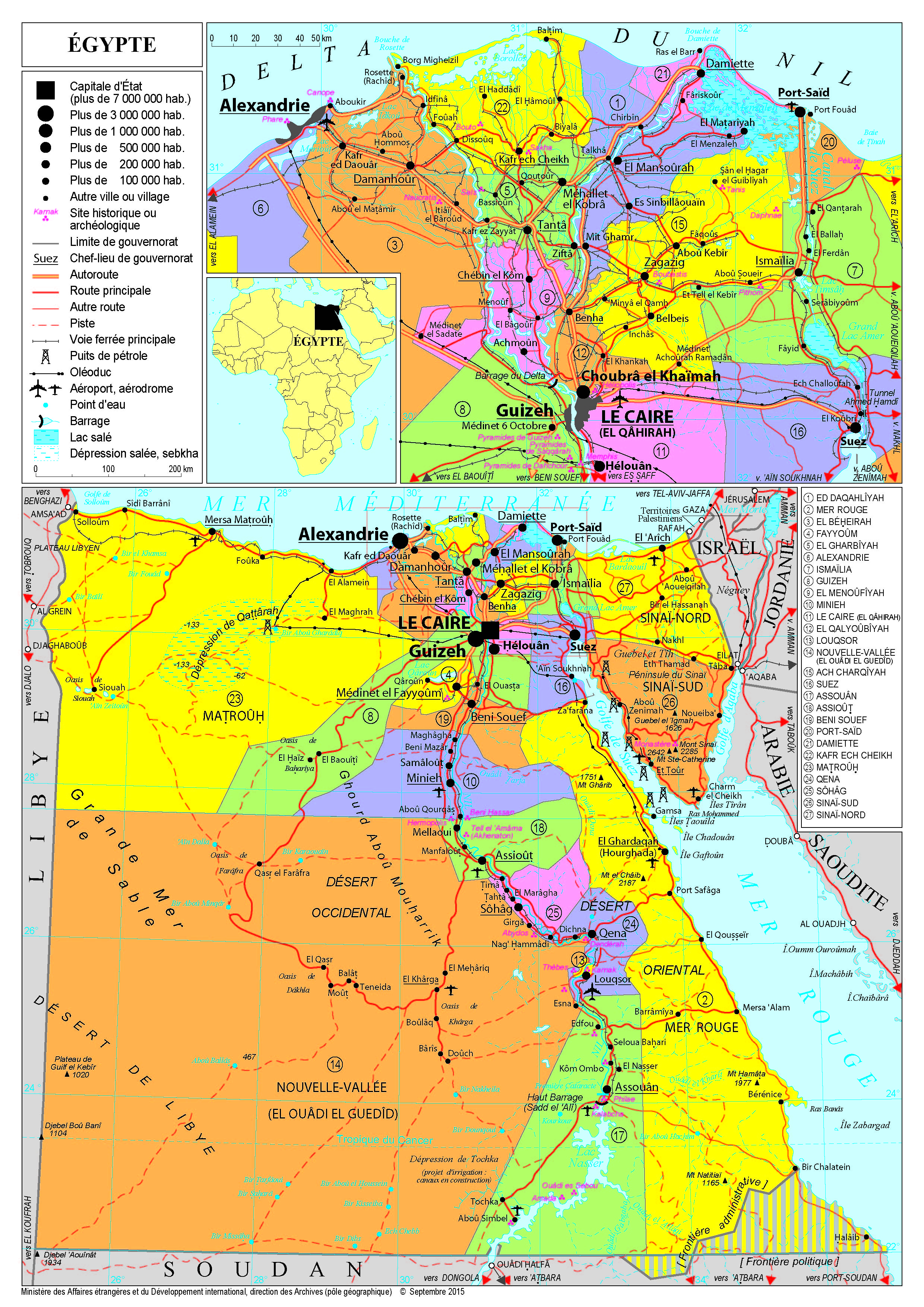 Égypte Navigation latérale fiche pays Dans cette rubrique Égypte Présentation de l’Égypte Conseils aux voyageurs Dernières minutes et alertes Sécurité Entrée / séjour Santé Informations utiles Voyages d'affaires Contacts utiles Politique et économie Relations bilatérales Présentation de l’Égypte Date de mise à jour le : 30 janvier 2026 Information toujours valable à la date du jour Présentation du pays Données générales Nom officiel : République arabe d’ÉgypteChef de l’État : Abdel Fattah Al Sissi (depuis le 8 juin 2014)Chef du gouvernement : Moustapha Madbouli Données géographiques Superficie : 1 002 000 km²Capitale : Le Caire (22 millions d’habitants)Villes principales : Alexandrie (4,1 millions d’habitants), Port-Saïd, Assiout, Louxor, AssouanLangue officielle : arabeMonnaie : Livre égyptienne (1 € ≈ 54.17 LE)Fête nationale : 23 juillet (en commémoration de la révolution des officiers libres du 23 juillet 1952) Données démographiques Population (2022) : 106,2 M d’habitants en ÉgypteDensité : 99 habitants/km² (95 % de la superficie de l’Égypte est désertique. La densité dans le delta et la Vallée du Nil est évaluée à 1 500 habitants/km²)Croissance démographique (projection 2023) : 3,7 % par anIndice de fécondité (2019) : 3,28 enfants/femmeEspérance de vie (2019) : 72Taux d’alphabétisation (2019) : 80,8 %Religions : islam sunnite ; christianisme (environ 10 % de Coptes)Indice de développement humain (2019) : 0,707/ 1 (116ème) Politique intérieure L’Égypte a été touchée par la vague des printemps arabes à partir du 25 janvier 2011. Le président Hosni Moubarak, au pouvoir depuis 1981, a quitté ses fonctions le 11 février. Le Conseil suprême des forces armées (CSFA) a assuré le pouvoir par intérim. Les élections législatives, tenues entre novembre 2011 et janvier 2012, ont vu la victoire des candidats du Parti de la liberté et de la justice (PJD), aile politique des Frères musulmans. Cette victoire a été suivie par celle de Mohamed Morsi lors de l’élection présidentielle de mai-juin 2012. En juin 2013, Mohamed Morsi est destitué et remplacé par le ministre de la Défense Abdel Fattah al-Sissi. Une nouvelle constitution a été adoptée par référendum, les 14 et 15 janvier 2014, avec un taux d’approbation de 98,1 % et un taux de participation de 38,6 %. Lors du scrutin des 26 et 28 mai 2014, l’ancien ministre de la Défense, Abdel Fattah Al Sissi, a été élu président de la République avec 96,9 % des suffrages. La participation s’est élevée à 47,5 %. Après les élections législatives de 2015, de nouvelles élections législatives en deux étapes sont en cours entre le 24 octobre et le 14 décembre 2020. Lors des dernières élections, la coalition « Pour l’Amour de l’Égypte », qui regroupe des partis favorables au président Sissi, a remporté la totalité des 120 sièges pourvus au scrutin de liste. Le 2 avril 2018, le président Sissi a été réélu pour un mandat de quatre ans, avec 97,1 % des suffrages exprimés et un taux de participation de 41,1 %. L’approbation par référendum (88,8 % des suffrages exprimés pour une participation de 44,3 %), en avril dernier, de la révision de la Constitution égyptienne, prolonge le mandat actuel du président jusqu’en 2024, et l’autorise à briguer un troisième mandat lors des élections présidentielles de 2024. L’Egypte est l’un des pays les plus touchés par les conséquences de la guerre en Ukraine, qui accentuent ses fragilités et préoccupent les autorités. Sur le plan de la sécurité alimentaire, l’Egypte, premier importateur mondial de blé, est fortement dépendant des importations de Russie et d’Ukraine. L’Egypte est également impactée sur le plan touristique (Russes et Ukrainiens fournissaient les plus gros contingents). Cette dégradation de la situation économique a des conséquences non négligeables sur la population égyptienne. Dans ce contexte, l’Egypte a de nouveau obtenu l’aide du FMI avec la mise en place d’un programme d’aide fin 2022 (prêt de 3Md$). La menace terroriste subsiste de manière diffuse sur le territoire égyptien. Plusieurs attaques ont frappé l’Égypte au cours des dernières années : attentat contre le consulat italien en juillet 2015 au Caire, attentat dans une église copte du Caire en décembre 2016 qui a fait 26 victimes, double-attentat en avril 2017 contre les églises de Saint-Georges (Tanta, delta du Nil) et Saint-Marc (centre d’Alexandrie) qui a fait 46 victimes, deux attentats contre un bus de pèlerins coptes à Minya en mai 2017 et en novembre 2018, deux attaques contre un bus à proximité des pyramides de Gizeh en décembre 2018 et en 2019 et attaque à Ismailia en décembre 2022. C’est à la suite de l’attentat du 24 novembre 2017 contre la mosquée al-Rawda dans le nord-Sinaï que l’Égypte a lancé, en février 2018, l’opération d’envergure « Sinaï 2018 », afin d’éradiquer la présence de groupes terroristes se revendiquant de l’Etat islamique. Des défenseurs des droits de l’homme ont été arrêtés ces dernières années et certaines lois, portant notamment sur la lutte contre le terrorisme ou la régulation d’internet et des média, ont suscité la préoccupation de la communauté internationale, de même que des mesures prises à l’encontre des homosexuels et des personnes LGBT. Politique étrangère Le retour de l’Égypte sur les scènes régionale et internationale constitue une des priorités du président Sissi, après les années de bouleversements internes qui ont contraint l’Égypte à un certain retrait. L’Égypte fait de la lutte contre le terrorisme un axe majeur de sa politique étrangère. Elle est, à cette égard, préoccupée par la situation en Libye, avec laquelle elle partage une frontière de 1 200 kilomètres, et qu’elle considère comme une menace potentielle à sa sécuri