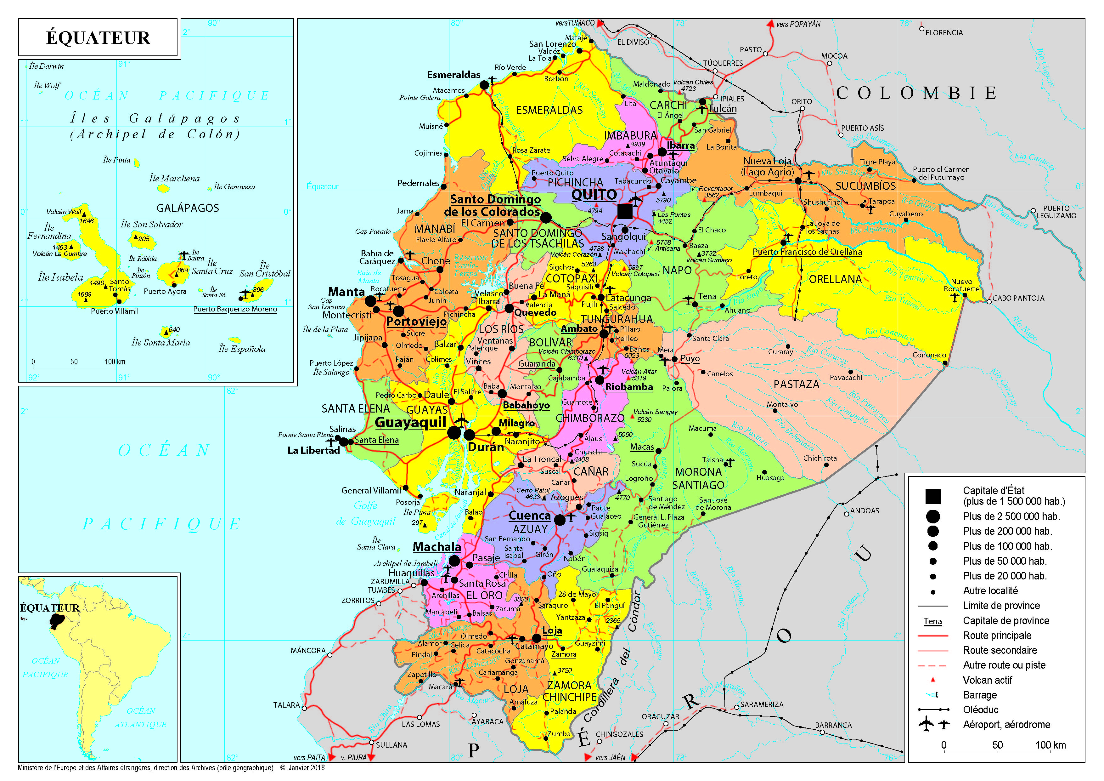Équateur Navigation latérale fiche pays Dans cette rubrique Équateur Présentation de l’Équateur Conseils aux voyageurs Dernières minutes et alertes Sécurité Entrée / séjour Informations utiles Voyages d'affaires Contacts utiles Politique et économie Relations bilatérales Présentation de l’Équateur Date de mise à jour le : 23 janvier 2026 Information toujours valable à la date du jour Présentation du pays Données générales Nom officiel : République de l’ÉquateurNature du régime : présidentiel Chef d’État : M. Daniel Noboa Vice-présidente : Mme Maria José Pinto Données géographiques Superficie : 256 370 km2Capitale : Quito (1,7 M d’habitants –recensement 2023)Villes principales : Guayaquil (2,6 M d’habitants), Cuenca (0,6 M d’habitants)Langue officielle : espagnol (93% de la population).Langues amérindiennes : kichua (4 %), shuarMonnaie : dollar américainFête nationale : 10 août Données démographiques Population : 18 M d’habitants (2023)Densité : 70 hab/km2Croissance démographique : 1% par an (Banque mondiale 2023)Espérance de vie : 78 ans (Banque Mondiale, 2022)Taux d’alphabétisation : 94% (BM, 2022)Religions : catholique (74%), protestante (10 %)Indice de développement humain : 83e rang (2022)Taux de pauvreté : 25,2% de la population sous le seuil de pauvreté (BM, 2022) (44,6 % en 2004) La vie politique équatorienne a été profondément marquée par la figure de l’ancien président de gauche Rafael Correa, exilé en Belgique et condamné à huit ans de prison pour corruption. Resté dix ans au pouvoir (2007-2017), il a mené des réformes d’ampleur (lutte contre les inégalités, modernisation de l’économie, réforme constitutionnelle). Il cède la place en 2017 à son vice-président, Lenín Moreno qui engage une politique libérale, marquée par l’adoption de programmes avec le FMI. Les élections générales de 2021 voient la victoire du banquier conservateur Guillermo Lasso (52,4% des suffrages). Son mandat aura toutefois été de courte durée. Marqué au début par une campagne de vaccination réussie, alors que le pays a été l’un des plus éprouvés au monde par la pandémie de Covid-19 et par des efforts en faveur d’une relance économique et de l’ouverture au secteur privé, il s’est terminé de manière anticipée en novembre 2023. Faisant face à une procédure de destitution, lancée à l’initiative du Parlement, dominé par l’opposition qui l’accusait d’avoir contribué à un système de détournements de fonds et d’attribution de contrats publics, Guillermo Lasso a activé le mécanisme constitutionnel dit de « mort croisée » permettant la dissolution de l’Assemblée nationale et conduisant à la convocation d’élections générales anticipées pour finir le mandat en cours. Daniel Noboa, ancien chef d’entreprise de la région de Guayaquil, est sorti vainqueur de l’élection présidentielle anticipée, avec 52% des voix face à Luisa Gonzalez (48%), candidate du parti Revolución Ciudadana, devenant le plus jeune président de l’histoire de la République d’Équateur. Investi le 23 novembre 2023, il hérite d’un pays marqué par une grave crise sécuritaire et un contexte économique difficile. Il doit alors constituer des coalitions à l’Assemblée nationale où son parti politique ne représente que la 4ème force. Un an et demi plus tard, Daniel Noboa est largement réélu, avec 55% des voix, face à Luisa Gonzalez lors des présidentielles de février et avril 2025. Son parti emporte également les élections législatives où il dispose désormais de la majorité. Cette configuration lui permet de lancer des réformes de fond, notamment dans le domaine sécuritaire. Pour autant, la situation de l’Équateur demeure préoccupante, en raison de l’enracinement dans le pays de la criminalité organisée liée au narcotrafic. Devenu un des principaux pays exportateurs de cocaïne vers l’Europe, l’Équateur détient au début 2025 le record du plus haut taux d’homicides par habitant en Amérique latine. Cette situation a conduit le président Noboa à adopter début 2024 un décret déclarant l’existence d’un « conflit armé interne » et ordonnant l’intervention des forces armées et de la police pour neutraliser 22 groupes criminels, qualifiés d’organisations terroristes. Politique étrangère La politique étrangère de Daniel Noboa s’inscrit dans sa priorité de politique intérieure de lutte contre la criminalité organisée. Sur le plan régional, l’Équateur dénonce le régime de Nicolas Maduro au Venezuela. Les relations diplomatiques et consulaires entre les deux pays sont rompues et le gouvernement équatorien a reconnu Edmundo Gonzalez comme vainqueur de l’élection présidentielle du 28 juillet 2024. L’Équateur, qui est fortement touché par la migration vénézuélienne, avec près de 500 000 Vénézuéliens sur le sol équatorien, a également quitté l’ALBA (Alliance bolivarienne pour les Amériques). Membre de la Communauté andine des Nations et de l’Organisation des Etats Américains, l’Équateur a adhéré, en tant que membre associé, à l’Alliance du Pacifique aux côtés du Chili, de la Colombie, du Mexique et du Pérou. Le gouvernement équatorien ambitionne d’en devenir membre de plein droit, et, partant, de s’ouvrir davantage vers les économies émergentes du sud-est asiatique. Suite à l’intrusion des forces de police équatoriennes dans l’ambassade du Mexique, le 5 avril 2024, afin d’arrêter l’ancien vice-président Jorge Glas, les relations diplomatiques entre l’Équateur et le Mexique ont été rompues. Daniel Noboa poursuit le rapprochement du pays avec les Etats-Unis, qui sont le principal partenaire commercial de l’Équateur. Les relations avec l’UE se sont intensifiées ces dernières années, à travers l’adhésion en 2017 de l’Équateur à l’accord de libre-échange en