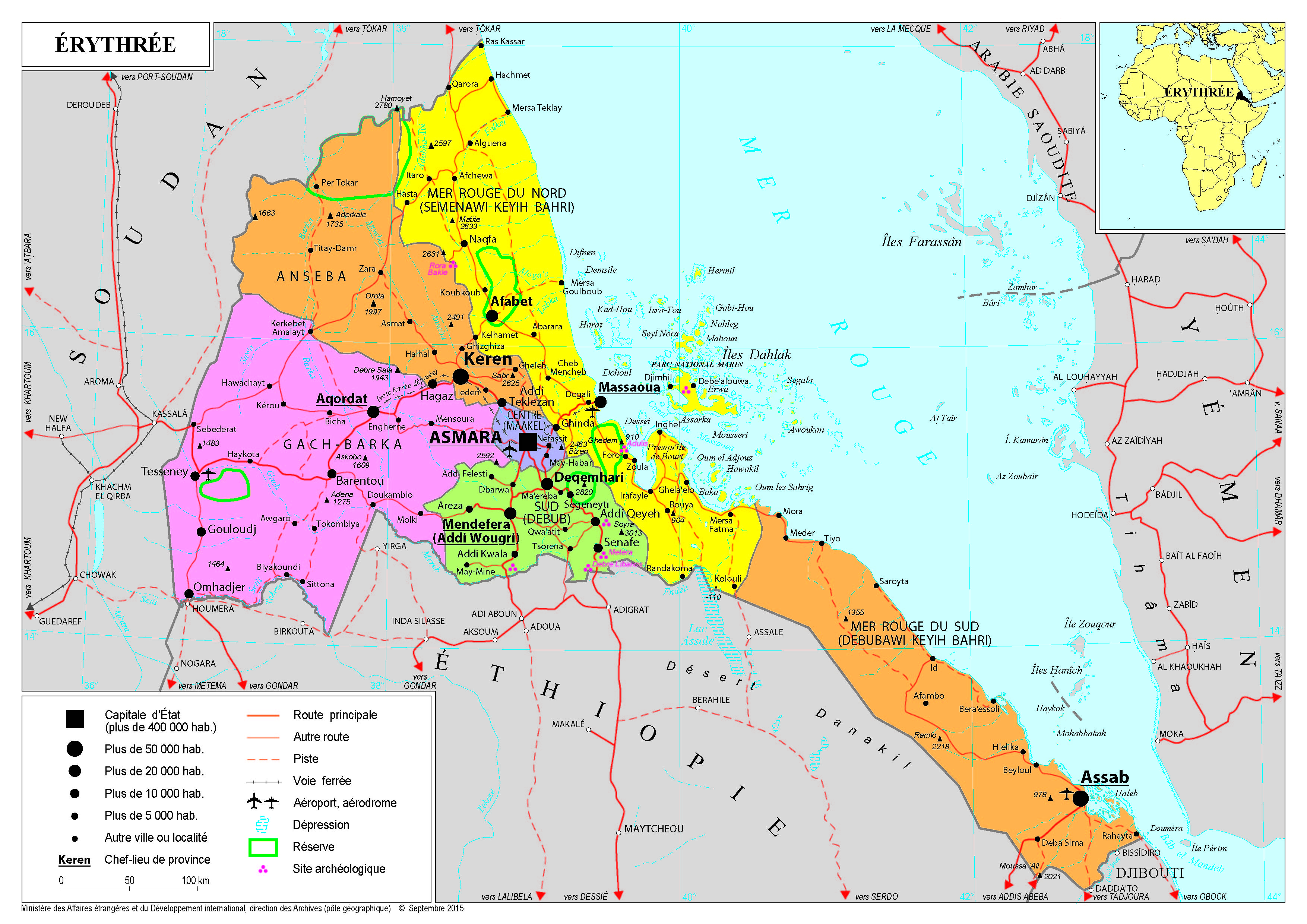 Erythrée Navigation latérale fiche pays Dans cette rubrique Erythrée Présentation de l’Erythrée Conseils aux voyageurs Dernières minutes et alertes Sécurité Entrée / séjour Santé Informations utiles Voyages d'affaires Contacts utiles Politique et économie Relations bilatérales Présentation de l’Erythrée Date de mise à jour le : 21 janvier 2026 Information toujours valable à la date du jour Présentation du pays Données générales Nom officiel : État d’ErythréeNature du régime : Régime à parti uniqueChef de l’État : M. Issayas Afeworki (ou Afwerki) Données géographiques Superficie : 117 600 km²Capitale : AsmaraVilles principales : Asmara, Massaoua, Assab, KerenLangue (s) officielle (s) : tigrinya, arabe, anglaisLangue (s) courante (s) : tigrinya, arabe, tigré, kunama, afar, bilen, saho, nara et autres langues couchitiquesMonnaie : Nakfa ; 1€ = 16,98 ERN (décembre 2021)Fête nationale : 24 mai (Jour de l’Indépendance) Données démographiques Population : environ 3 millions (estimation)Densité : 30 hab./km2Croissance démographique : 1.6 (2011)Espérance de vie : 66 ans (2019, PNUD)Taux d’alphabétisation : 60%Indice de développement humain : 0,434 – 182e sur 187 (2019)Religions (estimation) : Musulmans sunnites 50% ; Chrétiens orthodoxes 30% ; Catholiques 13% ; Autres 7% (Protestants, Adventistes du Septième Jour, Témoins de Jéhovah) Présence française Ambassade de France : AsmaraCommunauté française en Erythrée (2020) : 10 (avec une majorité de binationaux)Communauté érythréenne en France (2019) : 7651 (nombre de personnes disposant d’un titre ou d’un document de séjour valide au 31/12/2019) Politique intérieure À la tête du pays depuis l’indépendance en 1993, le Président Issayas Aferworki du Front Populaire pour la Démocratie et la Justice (parti unique issu en 1994 du Front populaire de Libération de l’Érythrée qui mena la lutte pour l’indépendance) concentre tous les pouvoirs. Le processus de démocratisation engagé en 1997 avec l’adoption d’une constitution est au point mort. Le régime érythréen a supprimé la plupart des libertés et la situation des droits de l’homme y est très préoccupante : interdiction des partis politiques ; absence d’indépendance de la justice ; des prisonniers politiques toujours plus nombreux ; liberté de la presse et liberté syndicale inexistantes ; liberté de religion fortement encadrée ; arrestations et détentions arbitraires. Depuis la guerre contre l’Éthiopie entre mai 1998 et juin 2000, le service national est à durée illimitée. Il peut se dérouler au sein des forces armées érythréennes mais également dans toutes les administrations civiles. L’opposition n’a pas de rôle actif et se trouve pour l’essentiel en Éthiopie, aux États-Unis ou en Europe. Situation économique L’Érythrée fait partie des pays les moins avancés (PMA). Le PIB du pays est estimé à 2 Md$ en 2018. Après 3,8 % en 2019, la croissance s’établirait à -0,6 % en 2020 (DGT). Le secteur des services a le poids le plus important dans l’économie en raison des activités de commerce liées au positionnement géographique du pays. Le secteur primaire est très peu développé en raison des faibles ressources agricoles et, s’il emploie 70% de la population, il représente moins de 15% du PIB. Le secteur industriel représente quant à lui 22% de l’économie et repose sur l’industrie extractive : le pays dispose d’importantes ressources de cuivre, d’or, de minerai de fer, de nickel, de granite et de potasse (notamment la mine de Colulli, dont l’exploitation devrait commencer en 2022). Le secteur privé est quasi-inexistant en Érythrée en raison d’un environnement des affaires très difficile lié à l’omniprésence de l’État dans l’économie.Le déficit budgétaire s’est élevé en moyenne à 10% du PIB au cours des dernières années en raison de ressources domestiques extrêmement faibles (moins de 14% du PIB). De ce fait la dette publique augmente régulièrement et serait, d’après la Banque mondiale, de près de 267% en 2019. Le niveau de l’aide publique au développement reçue par l’Érythrée est relativement faible pour un PMA. Les deux principaux donateurs sont le Fonds mondial et la Commission européenne (l’UE finance un projet de rénovation des routes en Érythrée, à hauteur de 20M € via le Fonds Fiduciaire d’Urgence). Politique étrangère Relations avec l’Éthiopie Le Front de Libération du Peuple Érythréen et le Front de Libération du peuple du Tigré éthiopien ont collaboré dans leur lutte contre le régime du Derg, dirigé par Mengistu Haile Mariam. Les Éthiopiens ont accepté l’indépendance de l’Érythrée après la chute de Mengistu. Néanmoins, les frictions frontalières, notamment autour de la ville de Badme, suivies de l’introduction de la monnaie érythréenne en 1997 ont mené à une rapide détérioration des relations. Ces tensions ont débouché sur un conflit meurtrier (54 000 à 137 000 victimes selon les estimations) de mai 1998 à juin 2000. La médiation de l’Organisation de l’Union africaine, soutenue par le Conseil de sécurité des Nations unies et l’Union européenne, a abouti à la signature des accords d’Alger le 12 décembre et à la délimitation de la frontière par une commission arbitrale, dont les décisions ont attribué la ville de Badme à l’Érythrée. Néanmoins, les Éthiopiens ne s’étant jamais retirés de cette ville et de ses environs, un état de guerre froide a perduré jusqu’à l’accession d’Abiy Ahmed à la primature éthiopienne. Le 5 juin 2018, le parti au pouvoir en Éthiopie, l’EPRDF, a annoncé son intention d’appliquer pleinement les accords d’Alger et de renouer avec l’Érythrée. Le 8 juillet 2018, le Premier ministre éthiopien s’est rendu à Asmara. Dans les jours qui ont suivi, les relations diplomatiques ont