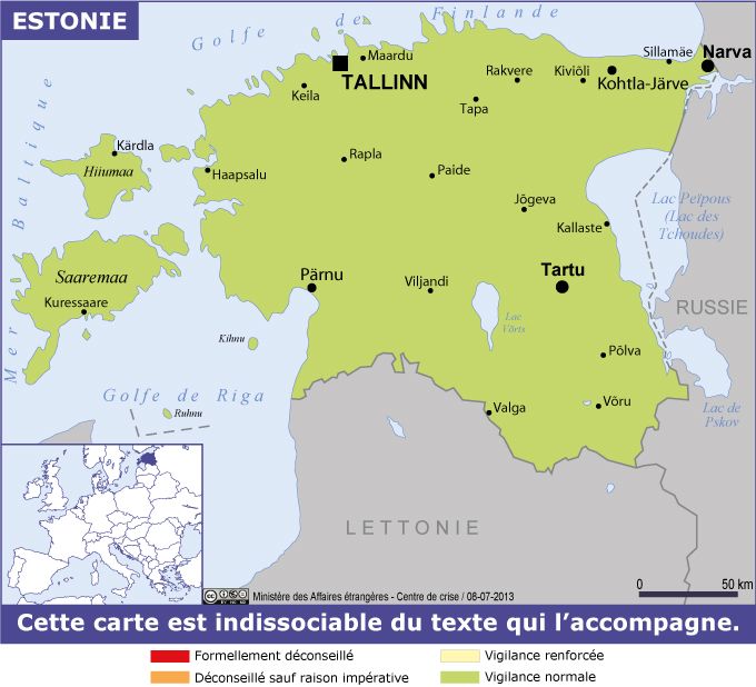 Estonie Navigation latérale fiche pays Dans cette rubrique Estonie Présentation de l’Estonie Conseils aux voyageurs Dernières minutes et alertes Sécurité Entrée / séjour Santé Informations utiles Voyages d'affaires Contacts utiles Politique et économie Relations bilatérales Sécurité Date de mise à jour le : 27 mars 2026 Information toujours valable à la date du jour Imprimer Imprimer Vous voyagez à l'étranger ? Pour recevoir des alertes, inscrivez-vous sur Fil d'Ariane. S'inscrire sur Fil d'Ariane Donnez-nous votre avis Aidez-nous à améliorer notre service en répondant à notre enquête. Répondre à l'enquête utilisateurs Fermer Vérifiez que vous êtes bien assurés Avant de voyager, il est indispensable de vérifier que vous êtes bien assuré Quelle est la portée des Conseils aux Voyageurs ? Zones de vigilance Dernière actualisation le 05/03/2026, information toujours valable à la date du jour Risques encourus et recommandations associées Délinquance L’Estonie est en règle générale un pays sûr. Les touristes restent cependant une cible privilégiée pour les pickpockets et les voleurs à la tire, notamment dans les lieux touristiques et fréquentés. Des touristes ont pu être victimes d’escroquerie dans les établissements nocturnes de la vieille ville de Tallinn (notes disproportionnées, incitation à la consommation, utilisation frauduleuse de cartes bancaires). Il est préférable d’éviter d’utiliser des cartes de crédit dans ces établissements. Dans les bars et autres établissements nocturnes, le risque d’usage de produits psychotropes (type GHB) existe. Il est recommandé de faire preuve d’une élémentaire prudence dans les activités « festives ». D’une manière générale la consommation de stupéfiants est en augmentation dans les grandes villes. De même les cyber-escroqueries connaissent une augmentation significative dans un pays très numérisé. Là encore, il est recommandé de faire preuve de prudence et de discernement face à certaines sollicitations et de ne jamais communiquer ses données personnelles. Risque terroriste Même s’il apparaît faible en Estonie, le risque terroriste, comme partout ailleurs, ne saurait être écarté Risques liés aux transports Des comportements abusifs de certains conducteurs de taxis et de cyclotaxis ont été signalés à Tallinn (tarifs excessifs, menaces). Il est conseillé de privilégier les compagnies de taxi identifiées et notamment de ne pas donner suite aux sollicitations de certains conducteurs indépendants à la sortie de l’aéroport et des terminaux du port de Tallinn. Risques industriels et naturels Les risques industriels liés au nucléaire sont limités, du fait de l’éloignement des centrales environnantes (sites de Loviisa en Finlande et de Sosnovy Bor en Russie). Le risque sismique est également faible. Zones de vigilance Risque lié à la délinquance urbaine dans les zones suivantes : la vieille ville de Tallinn le quartier de Kopli le quartier de Lasnamäe les alentours du port de Tallinn les alentours de la gare ferroviaire de Tallinn la ville de Narva la ville de Sillamäe la ville de Kohtla-Järve Par ailleurs, il importe de noter que les régions frontalières de la Russie – en particulier la ville de Narva et le point de passage frontalier -, dans un contexte de tensions régionales, restent sensibles pour les autorités estoniennes. Recommandations générales Il est conseillé aux visiteurs de suivre les recommandations suivantes : se munir de photocopies des documents d’identité et des titres de voyage, ou bien les scanner et se les envoyer par courriel avant de partir ; connaître le numéro d’urgence ou la procédure permettant de faire opposition à une carte bancaire volée ou perdue ; répartir son argent et ses cartes de crédit en différents endroits ; contracter une assurance voyage, assortie d’une garantie de rapatriement ; éviter le port ostentatoire d’objets de valeur. Se tenir informé de la situation sécuritaire et suivre en toutes circonstances les recommandations des autorités locales (télécharger l’application de sécurité civile en anglais https://www.olevalmis.ee/en/.) Liste des représentations françaises Ambassade de France en Estonie Toom Kuninga 20 15185 Tallinn Estonie Tel : +372 6 16 16 00 Ambassade de France en Estonie Réseaux sociaux Facebook X Instagram Ambassadedefranceenestonie Section consulaire de l’Ambassade de France à Tallinn Toom Kuninga 20 15185 Tallinn Estonie Tel : +372 660 2633 Ambassade de France en Estonie Réseaux sociaux Facebook X Instagram