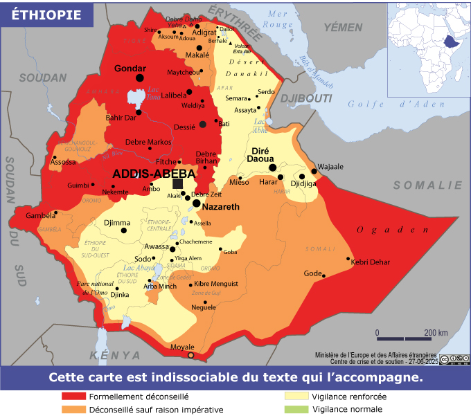 Éthiopie Navigation latérale fiche pays Dans cette rubrique Éthiopie Présentation de l’Éthiopie Conseils aux voyageurs Dernières minutes et alertes Sécurité Entrée / séjour Santé Informations utiles Voyages d'affaires Contacts utiles Politique et économie Relations bilatérales Sécurité Date de mise à jour le : 01 avril 2026 Information toujours valable à la date du jour Imprimer Imprimer Vous voyagez à l'étranger ? Pour recevoir des alertes, inscrivez-vous sur Fil d'Ariane. S'inscrire sur Fil d'Ariane Donnez-nous votre avis Aidez-nous à améliorer notre service en répondant à notre enquête. Répondre à l'enquête utilisateurs Fermer Vérifiez que vous êtes bien assurés Avant de voyager, il est indispensable de vérifier que vous êtes bien assuré Quelle est la portée des Conseils aux Voyageurs ? Zones de vigilance Dernière actualisation le 05/03/2026, information toujours valable à la date du jour Zones formellement déconseillées (en rouge) Région du Tigré Après deux ans de conflit entre l’armée fédérale éthiopienne et le TPLF (Tigray’s People’s Liberation Front) et malgré la signature d’un accord de cessation des hostilités le 2 novembre 2022, certaines zones de la région demeurent contestées entre différents groupes (western Tigray, frontières avec la région Amhara) et sont donc formellement déconseillées, de même que toute la bande frontalière avec l’Erythrée (forte militarisation, présence de nombreuses munitions non explosées datant du dernier conflit). Région Afar Toute la bande frontalière de l’Afar avec l’Erythrée est formellement déconseillée. Région Amhara L’ensemble de la région Amhara est formellement déconseillé en raison de combats sporadiques et de blocages réguliers des axes routiers par les forces gouvernementales ou les mouvements rebelles, y compris les grandes localités, qui sont ponctuellement sujettes à des combats ou des attaques ciblées. Frontière avec le Soudan du Sud La zone, qui connaît un afflux massif de réfugiés, est dangereuse en raison de la présence possible de groupes armés impliqués dans le conflit sud-soudanais et d’un afflux massif de réfugiés. Frontière avec le Soudan La zone est le lieu d’incursions armées de part et d’autre de la frontière, et de trafics, notamment d’êtres humains. La guerre civile en cours actuellement au Soudan interdit toute entrée dans ce pays. Frontière avec la Somalie et le Kenya La zone est particulièrement dangereuse en raison du risque de pénétration d’éléments d’Al Shabaab (dernière incursion en juillet 2022), de la présence d’éléments armés non gouvernementaux et des incidents fréquents entre clans somalis. Le risque d’enlèvement d’Occidentaux dans cette région est réel. Les personnels humanitaires qui sont amenés à y travailler sont invités à se faire connaître à la section consulaire d’Addis Abeba et à s’enregistrer sur Ariane afin de pouvoir être contactés en cas d’alerte. Ils sont invités à suivre scrupuleusement les consignes du service de sécurité des Nations unies et des ONG. La ville de Moyale, frontalière du Kenya, est le lieu de massacres inter-ethniques, et constitue une plaque tournante pour divers trafics. La région frontalière de Las Anod a accueilli plusieurs dizaines de milliers de réfugiés depuis janvier 2023 à la suite d’affrontements à Las Anod (Laascaanood) en Somaliland. Ouest de la région Oromo En raison de violents affrontements intercommunautaires impliquant différents groupes armés, les woredas West-Wellega, East-Wellega, et Horo Guduru sont formellement déconseillés. Les woredas de West Shewa et North Shewa à l’ouest d’une ligne Agere Hywet / Fitche sont également formellement déconseillés. Région de Gambela Cette zone est régulièrement soumise aux tensions intercommunautaires ainsi qu’aux débordements des crises affectant le Soudan du sud. En outre, elle est un foyer très actif de choléra. Zones déconseillées sauf raison impérative (en orange) Région du Tigré La nomination d’une nouvelle autorité pour l’administration intérimaire de la région a minoré le risque d’un conflit ouvert. Les conditions ne sont cependant pas réunies pour une reprise de séjours touristiques et une grande partie la région reste déconseillée sauf raison impérative. Région Afar En raison des tensions entre populations Somali et Issa, toute la bande frontalière avec la région Afar (où des combats meurtriers ont encore eu lieu en 2024) est déconseillée, sauf raison impérative. L’ouest de l’Ogaden (région Somali) Cette région connaît toujours des épisodes de tensions en raison de violences récurrentes entre clans somalis et de la présence de plusieurs centaines de milliers de déplacés internes. Région Oromo Des incidents violents entre communautés impliquant plusieurs groupes armés se produisent dans plusieurs parties de cette région. Les incidents liés à l’insurrection des milices rebelles en région Amhara ont tendance à déborder sur la partie de la région Oromia située à environ 100 km au nord la capitale Addis Abeba. Les zones situées aux alentours de Fitche sont formellement déconseillées. Il est possible de se rendre au site touristique de Debre Libanos après s’être renseigné sur la situation sécuritaire sur la route le reliant à Addis Abeba, aux alentours de laquelle des incidents sont ponctuellement recensés. L’axe routier Adama- Mieso, en bordure nord d’une région dans laquelle des foyers de rébellion sont actifs est déconseillé, de même qu’une grande partie des régions Arsi. Sur le plateau des Bale, il est déconseillé de camper de nuit. La visite du plateau est toujours autorisée mais elle doit être faite exclusivement en journée à partir des villes de Dinsho ou Goba. Les zones de Gedeo et d’une partie de Guji sont le théâtre de violences interethniques 