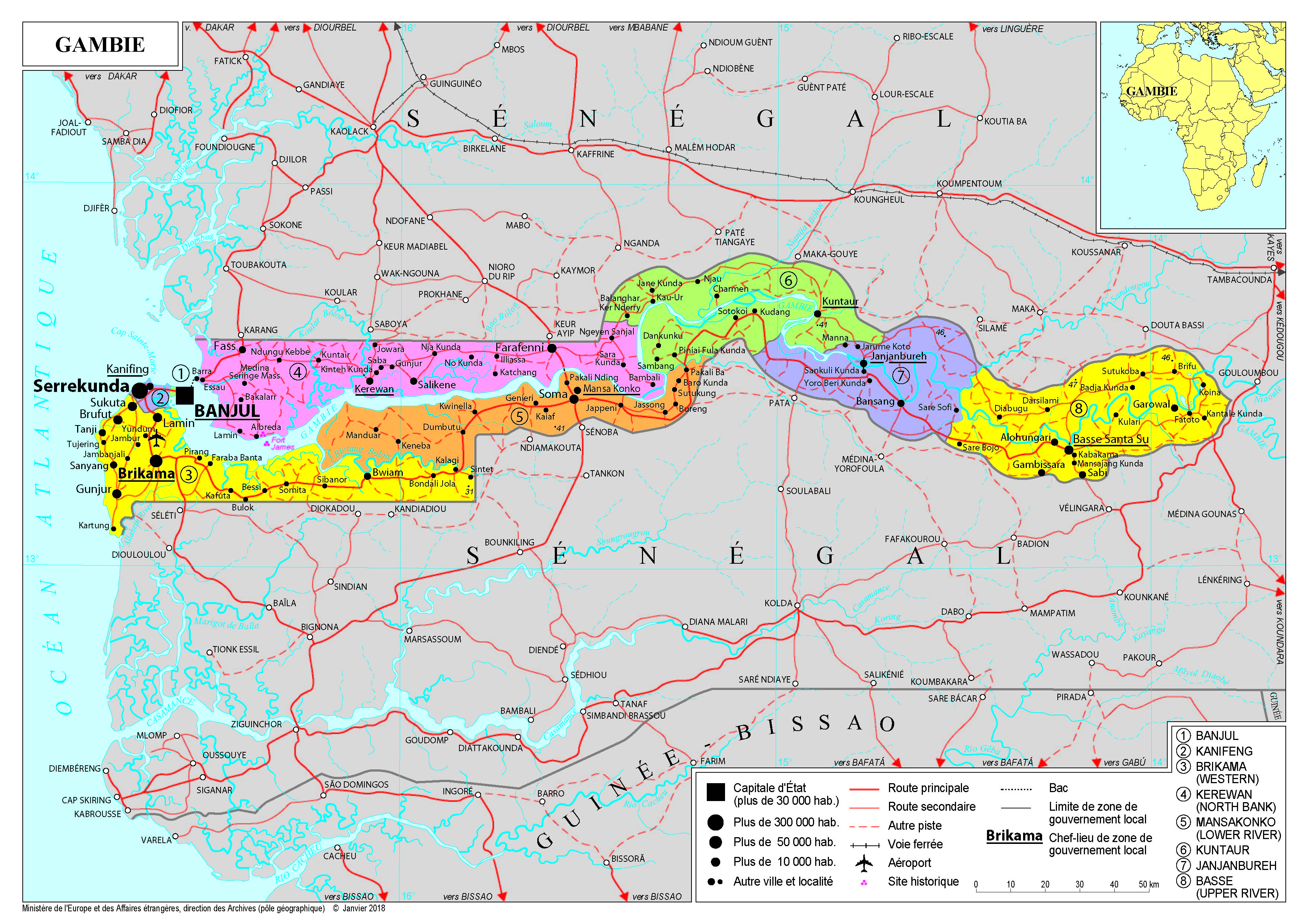 Gambie Navigation latérale fiche pays Dans cette rubrique Gambie Présentation de la Gambie Conseils aux voyageurs Dernières minutes et alertes Sécurité Entrée / séjour Santé Informations utiles Voyages d'affaires Contacts utiles Politique et économie Relations bilatérales Présentation de la Gambie Date de mise à jour le : 21 janvier 2026 Information toujours valable à la date du jour Présentation du pays Données générales Nom officiel : République de GambieNature du régime : RépubliqueChef de l’Etat : Adama BARROW (élu en décembre 2016 et réélu en décembre 2021) Données géographiques Superficie : 11 295 km²Capitale : BanjulVilles principales : Brikama, Bakau, Farafenni, SerrekundaLangue officielle : anglaisLangue (s) courante (s) : wolof, mandingue, fula, jola, serere.Monnaie : DalasiFête nationale : 18 février (proclamation de l’indépendance, en 1965) Données démographiques Population : 2,6 millions d’habitants en 2021 (Banque mondiale)Densité : 225 hab/km²Croissance démographique : 2,5% en 2021 (Banque mondiale)Religion (s) : Islam (85%), christianisme et religions traditionnelles (15%) Politique intérieure La victoire d’Adama Barrow, candidat de l’opposition, lors de l’élection présidentielle du 1er décembre 2016, a ouvert une nouvelle ère pour la Gambie, après 22 ans de dictature. Le lieutenant Yahya Jammeh avait pris le pouvoir par un coup d’Etat en 1994. Il a dirigé le pays de manière autocratique et souvent imprévisible. Les remaniements ministériels ont été fréquents, et le président était coutumier de décisions brutales. Les droits de l’Homme y ont été constamment bafoués (détentions arbitraires, disparitions forcées, torture, restrictions de la liberté d’expression, persécution des homosexuels). La Gambie de Jammeh était également un acteur du conflit en Casamance. Son soutien à la rébellion dans cette région du Sénégal a contribué à la perpétuation de la violence armée, tendant la relation avec le Sénégal, dans lequel le pays est enclavé. Les élections présidentielles gambiennes du 4 décembre 2021, tout comme la campagne qui les a précédées, se sont déroulées dans de bonnes conditions, sans heurts. Les missions d’observation électorale ont salué la transparence et la bonne tenue du scrutin. Adama Barrow, désormais leader du Parti national du peuple (NPP, crée en décembre 1019), a été très largement réélu avec plus 52,3% des voix, suivi par son ancien allié et désormais principal opposant de l’UDP, Ousainou Darboe, avec 27,7%. La cérémonie de prestation de serment marquant le début du second mandat d’Adama Barrow se tiendra le 19 janvier 2022. L’UDP a contesté le résultat de l’élection et a déposé un recours devant la Cours suprême le 14 décembre 2021. Les élections législatives se sont tenues le 9 avril 2022. Avec un taux de participation de 51%, (contre 90% à la présidentielle de décembre), le parti NPP du président Barrow a obtenu seulement 18 sièges. Le parti d’opposition (UDP) d’Ousainou Darboe a obtenu quant à lui 15 sièges. Avec une alliance de petits partis (NRP, APRC), le président peut compter sur 24 sièges à l’Assemblée nationale mais il n’atteint pas la majorité absolue (29 sur 53). Le 4 mai 2022, cinq mois après sa réélection, le président Adama Barrow a nommé son nouveau gouvernement (24 membres) avec un profond remaniement, la plupart des portefeuilles étant redistribuée : 9 ministres sortent du gouvernement, 12 sont issus de l’ancien gouvernement et 4 nouveaux ministres entrent au gouvernement. Le ministre des Affaires étrangères, M. Tangara est maintenu à ses fonctions. Le 21 décembre 2022, le porte-parole de la présidence gambienne a annoncé que des soldats des forces armées avaient été arrêtés la veille suite à une « opération rapidement menée par l’état-major » pour une tentative de coup d’Etat. La situation est rapidement revenue au calme et les sept personnes recherchées ont été arrêtées quelques jours après la tentative. Politique étrangère En raison de sa position géographique enclavée, la Gambie dépend étroitement du Sénégal pour sa sécurité et son économie. L’éphémère fédération sénégambienne fondée en 1982 a été dissoute en 1989. Malgré les visites croisées entre les deux chefs d’Etat, les relations bilatérales sont longtemps restées empreintes de méfiance et plusieurs sujets ont provoqué périodiquement des tensions : tarifs des bacs permettant de franchir le fleuve Gambie, situation en Casamance, mise en cause des autorités sénégalaises par la Gambie au sujet de leurs liens supposés avec l’opposition gambienne. Le changement politique intervenu en janvier 2017 a transformé les relations entre la Gambie et le Sénégal, qui se sont rapprochés. Le Sénégal a eu un rôle déterminant (diplomatique et militaire) dans la résolution de la crise. Ses troupes sont encore présentes en Gambie, dans le cadre de l’ECOMIG, dont le mandat devrait évoluer au début de l’année 2022. La première visite officielle du président Barrow à l’étranger a été effectuée au Sénégal, et a donné lieu à la signature de plusieurs accords de coopération et à la reprise du projet de pont Sénégambien. La première session du Conseil présidentiel sénégalo-gambien, coprésidée par les présidents Macky Sall et Adama Barrow, s’est tenue à Banjul le 13 mars 2018. De nouveaux accords ont été signés à cette occasion (défense et sécurité, justice, transport routier, santé, sport, culture et enseignement supérieur et énergie). La Gambie est membre de l’Organisation de mise en valeur du fleuve Gambie (OMVG), de la Communauté économique des Etats de l’Afrique de l’Ouest (CEDEAO), du Comité inter-Etats de lutte contre la sécheresse au Sahel (CILSS) et de l’Organisation de la Coopération islamique (OCI). Elle s’es