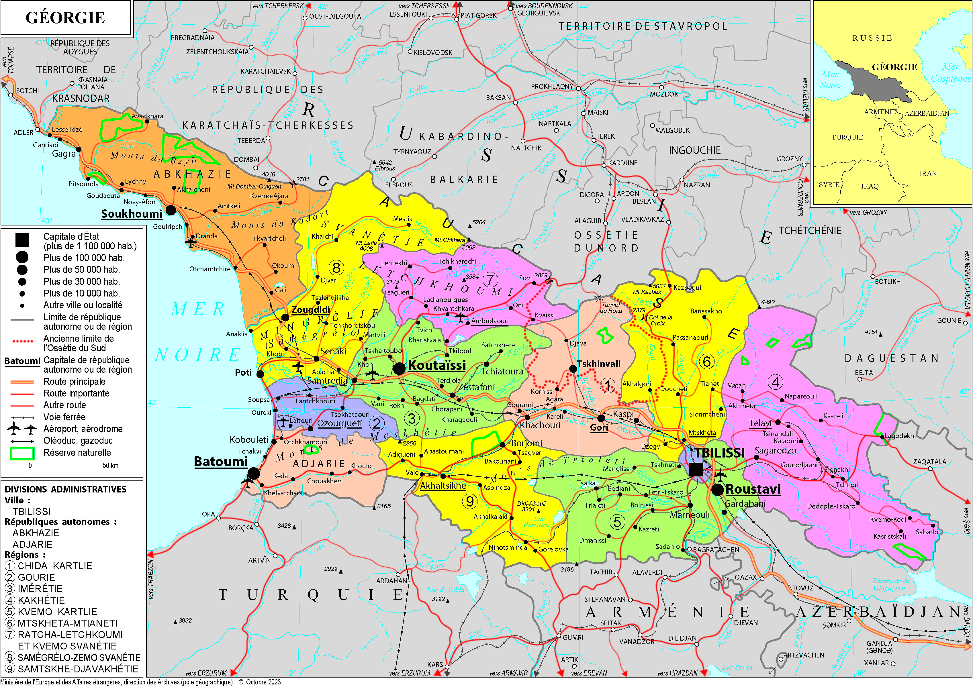 Géorgie Navigation latérale fiche pays Dans cette rubrique Géorgie Présentation de la Géorgie Conseils aux voyageurs Dernières minutes et alertes Sécurité Entrée / séjour Santé Informations utiles Voyages d'affaires Contacts utiles Politique et économie Relations bilatérales Présentation de la Géorgie Date de mise à jour le : 05 juin 2025 Information toujours valable à la date du jour Présentation du pays Données générales Nom officiel : GéorgieNature du régime : démocratie parlementaireChef de l’État : présidente de la Géorgie, Mme Salomé Zourabichvili (élue en novembre 2018, la prochaine élection présidentielle – devenue une élection au scrutin indirect – aura lieu en octobre 2024)Chef du gouvernement : Premier ministre, M. Irakli Kobakhidze (depuis le 8 février 2024). Données géographiques Superficie : 69 700 km²Capitale : Tbilissi (1,17 million d’habitants)Villes principales : Koutaïsi, Batoumi, RoustaviLangue officielle : géorgienLangues courantes : géorgien, russe, abkhaz, azéri, arménien, ossète.Monnaie : lari (GEL) (1 € = 2.85 GEL en octobre 2023).Fête nationale : 26 mai (proclamation de l’indépendance le 26 mai 1918 vis-à-vis de la République démocratique fédérative de Transcaucasie, définitivement acquise le 9 avril 1991). Données démographiques Population (au 1er janvier 2023) : 3 736 400Densité (2023) : 53,49 habitants/km²Croissance démographique (World Population Review, 2019) : - 0,15 %Espérance de vie (2023) : 73,7 ansTaux d’alphabétisation : 100 %Religions : orthodoxes (84 %), musulmans (10 %), chrétiens de rite arménien (4 %), catholiques (0,8 %)Indice de développement humain (HDI 2021) : 0,802 (63e rang sur 189) Politique intérieure Devenue indépendante de l’Union soviétique en 1991, la Géorgie a connu de profondes réformes à la suite de la « révolution des Roses » de novembre 2003 qui a conduit au pouvoir M. Mikhaïl Saakashvili, artisan d’une transformation de la Géorgie en démocratie à économie libérale de marché. La coalition « Rêve géorgien » emmenée par M. Bidzina Ivanishvili et arrivée au pouvoir en 2012, avait mis en œuvre en 2018 une ambitieuse réforme constitutionnelle.Toutefois, depuis 2019, la Géorgie fait face à une profonde crise politique après qu’un député communiste russe est intervenu au Parlement. En février 2021, l’arrestation du chef du principal parti d’opposition a provoqué la démission du Premier ministre et la formation d’un nouveau gouvernement conduit par Irakli Garibachvili.Les efforts de médiation de l’Union européenne ont abouti le 19 avril 2021 à un accord de compromis signé par le « Rêve géorgien » et une partie de l’opposition mais le parti gouvernemental a annoncé son retrait de l’accord le 29 juillet. Depuis cette date les tensions ont continué et se sont cristallisées autour des conditions de détention de M. Saakachvili, et de l’État de droit. Le système politique géorgien est plus que jamais marqué par une forte « polarisation » entre majorité et oppositions. La mise au vote du projet de loi sur « les agents de l’étranger », le 7 mars 2023, a suscité d’importantes manifestations et de vives réactions internationales, conduisant la majorité à retirer le projet. Le 14 décembre, l’octroi par le Conseil européen du statut de pays candidat à l’Union européenne à la Géorgie a été assorti de conditions ayant trait au cadre démocratique et à l’État de droit. Politique étrangère Depuis la révolution des Roses en 2003, la Géorgie a fait le choix stratégique du rapprochement avec l’Union européenne et l’OTAN. Lors du sommet de Bucarest de 2008, il a été indiqué à la Géorgie qu’elle avait à terme, vocation à rejoindre l’OTAN - organisation à laquelle le pays contribue militairement sur divers théâtres d’opération. Le rapprochement euro-atlantique a été inscrit dans la Constitution géorgienne à la suite d’un référendum organisé par le Président Mickaïl Saakachvili.La Géorgie est ainsi membre depuis 2009 du Partenariat oriental et est régulièrement présentée comme le pays le plus avancé sur le chemin des réformes. Le 27 juin 2014, la Géorgie a signé un accord d’association avec l’Union européenne, comprenant un accord de libre-échange complet et approfondi. La libéralisation du régime des visas de court séjour avec l’espace Schengen est intervenue le 28 mars 2017. La Géorgie, membre du Partenariat pour la paix depuis 1994, a été, parmi les pays non membres de l’OTAN, le plus important fournisseur de troupes en Afghanistan. Au sommet de Bucarest de 2008, les Alliés ont déclaré que la Géorgie avait « vocation à rejoindre l’Alliance atlantique » et lui ont octroyé en 2014 un « paquet substantiel » de mesures.A la suite du conflit de 2008, la Russie a étendu son emprise sur les provinces séparatistes d’Abkhazie et d’Ossétie du Sud, dont elle a reconnu l’indépendance et qu’elle entend progressivement détacher de la Géorgie. A cet effet, elle met en œuvre un processus actif de « frontiérisation » et signe divers accords de coopération stratégique avec les entités séparatistes. La France apporte un soutien constant à l’intégrité territoriale et la souveraineté de la Géorgie dans ses frontières internationalement reconnues.A la suite de l’invasion de l’Ukraine par la Russie, le Conseil européen du 23 juin 2022, suivant en cela les recommandations de la Commission, a décidé de reconnaître à la Géorgie « perspective européenne ». Le 14 décembre, l’octroi par le Conseil européen du statut de pays candidat à l’Union européenne à la Géorgie a été assorti de conditions ayant trait au cadre démocratique et à l’État de droit. Situation économique Grâce à d’importantes réformes structurelles, la Géorgie se situe dans le haut des classements internationaux,