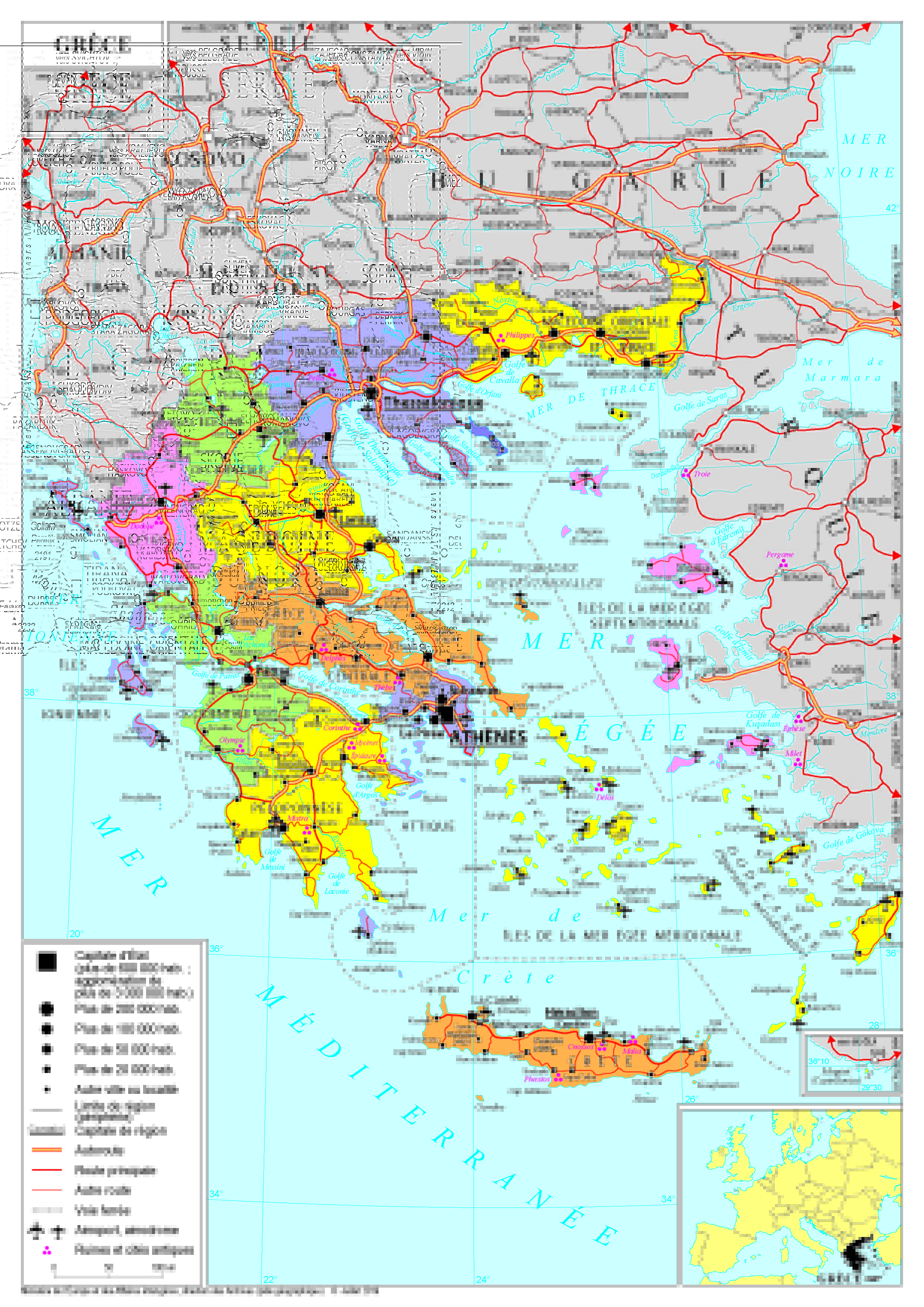 Grèce Navigation latérale fiche pays Dans cette rubrique Grèce Présentation de la Grèce Conseils aux voyageurs Dernières minutes et alertes Sécurité Entrée / séjour Santé Informations utiles Voyages d'affaires Contacts utiles Politique et économie Relations bilatérales Présentation de la Grèce Date de mise à jour le : 31 mars 2026 Information toujours valable à la date du jour Présentation du pays Données générales Nom officiel : République helléniqueNature du régime : République parlementairePrésident de la République : M. Constantine TASSOULASChef du gouvernement : M. Kyriákos MITSOTÁKIS Données géographiques Superficie : 132 049 km2 Capitale : AthènesVilles principales : Athènes (3,7 millions d’habitants), Thessalonique (1 million d’habitants)Langue officielle : grecMonnaie : euroFête nationale : 25 mars (officielle ; début de la guerre d’Indépendance en 1821) ; le 28 octobre est une fête nationale officieuse, en souvenir du refus du général Metaxás de céder aux revendications italiennes lors de la Seconde guerre mondiale (1940). Données démographiques Population : 10,44 millions d’habitants (2024)Densité : 78 habitants/km2 (2024)Croissance démographique : - 0,4 % (2024)Espérance de vie : 80 ans (2024)Taux d’alphabétisation : 97,7 % (2024)Religion : Orthodoxe (98 %) Indice de développement humain : 0,89 - 33e rang mondial (2024) Politique intérieure Le 12 février 2025, les députés ont élu M. Constantine Tassoulas président de la République. Le parti Nouvelle Démocratie (droite) a remporté les élections législatives du 25 juin 2023 et son dirigeant, M. Kyriákos Mitsotákis, est devenu Premier ministre, pour un deuxième mandat consécutif – le premier ayant couru de 2019 à 2023. Politique étrangère La politique étrangère de la Grèce a pour premier objectif la sécurité dans son environnement régional. Membre de l’OTAN depuis 1952, la Grèce joue un rôle actif au sein de l’Alliance. La Grèce est membre fondateur de l’ONU et siège au Conseil de sécurité pour la période 2025-2026. Elle est également engagée dans de nombreuses instances multilatérales (Conseil de l’Europe, UNESCO, OSCE, OIF, OMI, OCEMN). Elle a aussi accueilli les 16 et 17 avril 2024, à Athènes, la 9ème Conférence internationale « Our Ocean », consacrant son engagement à relever les défis mondiaux en matière de protection des océans. Relations avec l’Union européenne Présence dans les institutions européennes : M. Apostolos Tzitzikostas, ancien gouverneur de la région de Macédoine centrale, est Commissaire européen chargé des Transports et du Tourisme durables. La Grèce dispose de 21 députés au Parlement européen. Relations gréco-turques et Méditerranée orientale La relation avec la Turquie, stratégique, reste complexe. Les deux pays se sont rapprochés depuis une vingtaine d’années, notamment dans le cadre du processus d’adhésion de la Turquie à l’Union européenne. Les échanges économiques sont significatifs et le montant du commerce bilatéral s’est élevé à 6,2 Mds$ en 2024. Les relations bilatérales ont connu des tensions renouvelées ces dernières années, en raison du différend sur la délimitation des zones maritimes entre les deux pays, notamment en mer Egée, et des activités de recherche sismique turques en Méditerranée orientale. Les contacts politiques de haut niveau ont repris depuis 2023 (rencontres entre hautes autorités, mise en place de mesures de confiance et d’un agenda économique positif, signature d’une déclaration de bon voisinage). Sur Chypre, la Grèce soutient le principe d’une réunification de l’île sur la base d’une fédération bizonale et bicommunautaire, conformément aux résolutions du Conseil de sécurité des Nations Unies, et du respect de l’acquis communautaire. La Grèce est en outre puissance garante de l’île, avec la Turquie et le Royaume-Uni. Par ailleurs, Athènes et Nicosie partagent une identité de vues sur les principaux dossiers en Méditerranée orientale (énergie, droit de la mer, sécurité). Question migratoire Les migrations constituent une question centrale dans la politique étrangère grecque et une source de préoccupation des citoyens. En tant que pays de première entrée, la Grèce fait face à des flux migratoires importants et en hausse constante ces dernières années, principalement par la voie maritime (60 000 migrants arrivés illégalement en 2024). La Grèce demeure essentiellement un pays de transit. Des mesures législatives plus restrictives ont été prises à partir de juillet 2025 afin d’endiguer les flux croissants entre la Libye et la Crète.nt par la voie maritime. La Grèce demeure essentiellement un pays de transit. Situation économique PIB : 236,9 Mds€ (2024)Taux de croissance : 2,2 % (2024)Taux de chômage : 10,3 % (2024)Taux d’inflation : 2,8 % (2024)Dette publique : 154 % du PIB (2024)Solde budgétaire : -0,7 % (2024)Balance commerciale : -35,6 Mds€ en 2024 Principaux clients : Italie (10,5%), Allemagne (7,1%), Chypre (6,6%) Principaux fournisseurs : Allemagne (10,7%), Italie (8,8%), Chine (8,2%) Confrontée à une grave crise économique, la Grèce a bénéficié de trois plans d’assistance financière, en 2010, 2012 et 2015. A la suite d’importants efforts de restriction budgétaire depuis 2015, aidés par une forte croissance en 2021 (+ 8,4 %), la Grèce est sortie de la surveillance renforcée européenne en août 2022. En 2024, la croissance a été de 2,2 % grâce notamment à la mise en œuvre du Plan national de relance et de résilience (PNRR). Les comptes publics sont équilibrés, avec un excédent primaire de 2,5% en 2024, et une dette publique en nette baisse (de 194,5% en 2021 à 163,9 % en 2023 et 154% en 2024) et avec un profil très sécurisé (taux fixes et longue durée). Enfin, le taux de chômage continue de diminuer (10% en 2024 contre 12,5% en 