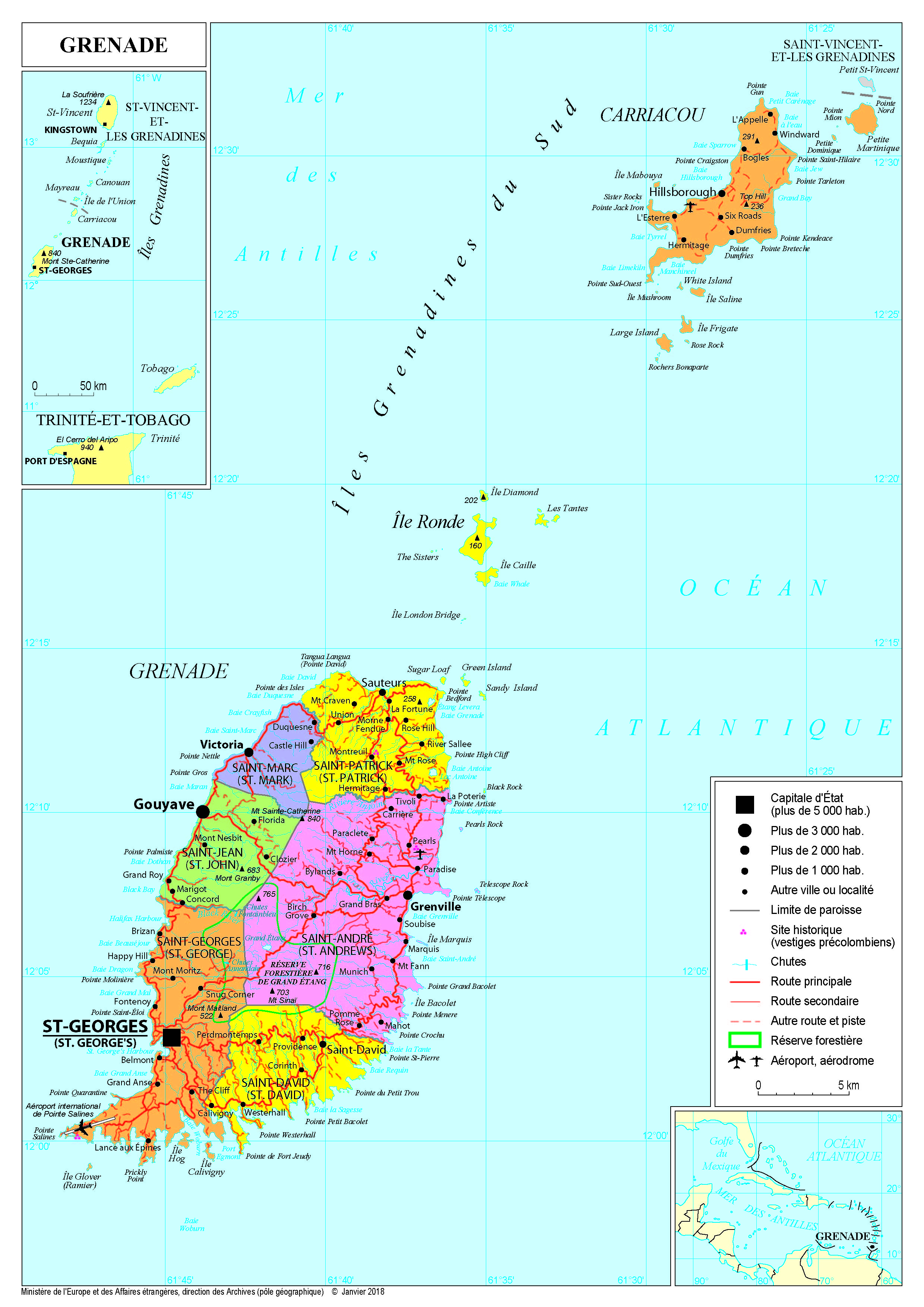 Grenade Navigation latérale fiche pays Dans cette rubrique Grenade Présentation de la Grenade Conseils aux voyageurs Dernières minutes et alertes Sécurité Entrée / séjour Santé Informations utiles Voyages d'affaires Contacts utiles Politique et économie Relations bilatérales Présentation de la Grenade Date de mise à jour le : 03 avril 2026 Information toujours valable à la date du jour Présentation du pays Données générales Nom officiel : la GrenadeNature du régime : démocratie parlementaireChef de l’Etat : la Reine Elizabeth II, représentée par un Gouverneur général, Mme Cecile Ellen FleuretteLa Grenade (7 mai 2013)Chef du Gouvernement : M. Dickon Mitchell, Premier ministre, Ministre des Finances, de la Sécurité Nationale, de l’Intérieur, de l’Administration publique, de l’Information et de la gestion des catastrophes (23 juin 2022) Données géographiques Superficie : 340 km²Capitale : Saint-Georges (33 700 hab.)Villes principales : Grenville, VictoriaLangue (s) officielle (s) : anglaisLangue (s) courante (s) : anglais, créole françaisMonnaie : Dollar des Caraïbes de l’est ou EC$ (Eastern Caribbean dollar), lié au dollar américain au tauxfixe de 1 US$ = 2,70 EC$ depuis 1976 ; 1 EC$ = 0.3659 € au 1er août 2022 (taux de chancellerie)Fête nationale : 7 février (fête de l’Indépendance, 1974) Données démographiques Population (BM 2020) : 112 519 habitantsDensité (BM 2019) : 329 habitants / km²Croissance démographique (BM 2020) : 0.5%Espérance de vie (BM 2018) : 74Taux d’alphabétisation (PNUD 2018) : 96,00 %Religion(s) : Protestants (49,2%), catholiques (36%), rastafari (1,2%)Indice de développement humain (PNUD 2019) : 0,738 soit 97ème rang mondial sur 189 Politique intérieure La Grenade est un régime parlementaire de type britannique avec un système bicaméral comprenant une Chambre des représentants (15 membres élus pour 5 ans au suffrage universel) et un Sénat (13 membres). Après les évènements de 1983 et l’intervention américaine, la scène politique grenadienne ne s’est à nouveau stabilisée qu’en juin 1995 avec la victoire électorale du New National Party (NNP) dont le chef, Keith Mitchell, a été reconduit trois fois à la tête du gouvernement. Très critiqué pour sa gestion de l’aide internationale massive reçue à la suite des destructions causées par les ouragans de 2004 et 2005, il a dû céder la place en 2008 à son rival, M. Tillmann Thomas, chef du parti d’opposition, le National Democratic Congress. Le NNP a de nouveau remporté les élections de 2013 puis de 2018. A la suite des élections générales anticipées du 23 juin 2022, le National Democratic Congress (NDC) s’est adjugé 9 sièges sur 15 à la Chambre des représentants. Politique étrangère La Grenade est membre des Nations unies, de l’Organisation des Etats américains (OEA), de l’Organisation des Etats de la Caraïbe orientale (OECO), de l’Association des Etats de la Caraïbe (AEC), de la Communauté des Caraïbes (CARICOM), du Commonwealth et de l’Alliance bolivarienne des Amériques (ALBA). Restée très proche des Etats-Unis depuis l’intervention de 1983, la Grenade bénéficie de la Caribbean Basin Security Initiative (CBSI), de même que de crédits pour son budget de sécurité à travers le Regional Security System (RSS) mis en place par les Américains au profit de l’OECO et de la Barbade. L’essentiel de cet appui est destiné à financer l’équipement des forces de sécurité ainsi que leur formation. Les relations diplomatiques avec Cuba ont été rétablies en 1994. Par ailleurs, à l’issue d’un voyage à Pékin en décembre 2004, le Premier ministre Keith Mitchell a pris la décision de se tourner vers la Chine et de mettre fin à 16 années de relations diplomatiques avec Taïwan. La Grenade bénéficie des crédits du Fonds européen de développement sous forme d’aide budgétaire qui s’élève, au titre du 11ème FED, à 5 M€. Situation économique PIB (BM 2020) : 1,09 milliards $USDRNB par habitant (BM 2021) : 9 929 $USDCroissance (BM 2021) : 5,3 %Chômage (CIA WFB 2017) : 24%Inflation (BM 2021) : 1,2%Solde budgétaire (CIA WFB 2017) : 3,2 %Balance commerciale en % du PIB (FMI 2021) : -250 M$USDPrincipaux clients (OMC 2020) : Etats-Unis, Trinité et Tobago, Saint Vincent et les Grenadiens Antigua et Barbuda.Principaux fournisseurs (OMC 2020) : Etats-Unis, Trinité et Tobago, Iles Cayman, UK juiPart des principaux secteurs d’activités dans le PIB (Banque mondiale, 2019) : agriculture : 5.8% industrie : 13,1 % services : 81,0% Exportations de la France vers la Grenade (en 2022 - DGT) : 1,8 M€Importations françaises depuis la Grenade (en 2022 - DGT) : 2,1 € Pour aller plus loin : https://www.tresor.economie.gouv.fr/Pays/GD Comme la plupart des pays membres de l’OECO, la Grenade a connu une forte diminution du poids du secteur agricole au profit de celui des services (tourisme, construction, services financiers, mais également services éducatifs offshore). Ainsi, les services éducatifs des universités, en particulier dans le domaine médical, représentent plus de 20 % du PIB. Ils se situent en seconde place après le tourisme et devant l’agriculture, la pêche et l’agro-industrie. Alors que sur la période 1995-2000, l’économie de la Grenade avait enregistré une croissance annuelle moyenne de 6 %, ce rythme s’est nettement infléchi, tant en raison du passage de deux ouragans en moins de deux ans (Ivan en 2004, qui a détruit 90 % des infrastructures avec un coût de 200 % du PIB, puis Emilie en 2005), que des conséquences de la crise internationale sur le tourisme et la construction. Les comptes publics en ont été fortement dégradés et l’endettement public s’est beaucoup accru. La Grenade, comme la plupart des pays de la région, pâtit d’une fuite des cerveaux. Comme d’autres pays de la région, la pandémie de COVID 19 a contribué depuis la m