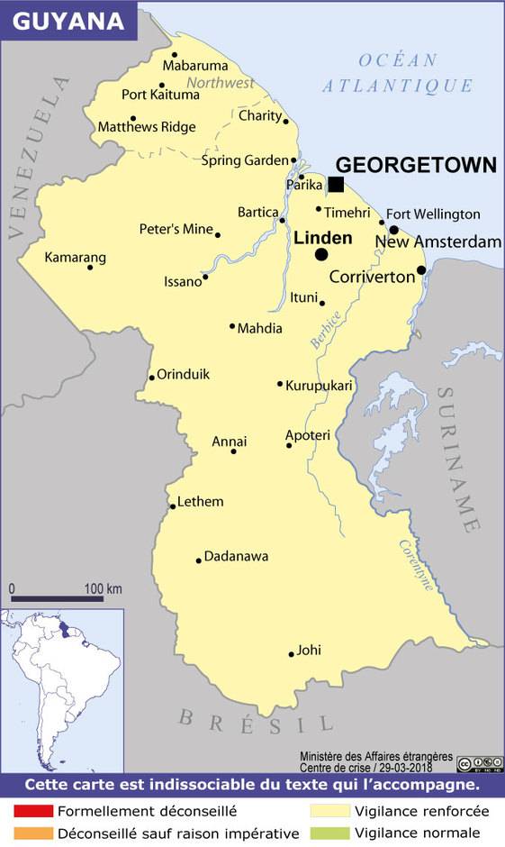 Guyana Navigation latérale fiche pays Dans cette rubrique Guyana Présentation du Guyana Conseils aux voyageurs Dernières minutes et alertes Sécurité Entrée / séjour Santé Informations utiles Voyages d'affaires Contacts utiles Politique et économie Relations bilatérales Sécurité Date de mise à jour le : 07 avril 2026 Information toujours valable à la date du jour Imprimer Imprimer Vous voyagez à l'étranger ? Pour recevoir des alertes, inscrivez-vous sur Fil d'Ariane. S'inscrire sur Fil d'Ariane Donnez-nous votre avis Aidez-nous à améliorer notre service en répondant à notre enquête. Répondre à l'enquête utilisateurs Fermer Vérifiez que vous êtes bien assurés Avant de voyager, il est indispensable de vérifier que vous êtes bien assuré Quelle est la portée des Conseils aux Voyageurs ? Zones de vigilance Dernière actualisation le 06/03/2026, information toujours valable à la date du jour Le Guyana figure en vigilance renforcée (en jaune sur la carte). Georgetown : il est recommandé de ne pas se promener seul(e) dans la capitale après la tombée de la nuit. Il convient d’éviter, même de jour, certains quartiers de la capitale, notamment Tiger Bay, Albouystown, Sophia, Buxton et Agricola. Des renseignements spécifiques peuvent être obtenus auprès de l’agence consulaire. Il est recommandé de privilégier les visites en groupe organisé et de rester attentif à ses effets personnels dans le jardin botanique. Risques encourus et recommandations associées Criminalité La criminalité constitue un problème persistant au Guyana, notamment à Georgetown, la capitale. Les rassemblements et manifestations, même autorisés, dégénèrent très régulièrement en violences. Il est conseillé de s’en tenir éloigné. Insécurité dans les transports Il est recommandé de faire appel à des organismes professionnels pour tout déplacement en province et de privilégier les taxis de compagnies connues. Les minibus sont responsables de nombreux accidents au Guyana. Il est strictement déconseillé de circuler de nuit. Il est conseillé aux voyageurs se rendant du Suriname au Guyana d’utiliser exclusivement les ferrys et d’éviter d’emprunter les taxis de mer qui ne sont pas suffisamment sécurisés (absence de gilets de sauvetage, peu de contrôle des autorités, contournement des postes-frontières pour entrer ou sortir du Guyana). L’intérieur du pays, et notamment la région de Berbice, demeurent globalement à risque pour le voyageur non averti. Les attaques à main armée y sont fréquentes et des actes de piraterie ont été signalés sur les rivières Berbice et Corentyne. Risques naturels En raison des fortes pluies en janvier, mai, juin et décembre, le risque d’inondation est important. Piraterie maritime Des actes de piraterie parfois violents sont fréquemment signalés le long de la côte, et en particulier dans la zone frontière avec le Suriname (embouchure du Corentyne) et Northwest près de la frontière vénézuélienne. Il est déconseillé, sauf raison impérative, de naviguer dans la zone. Recommandations générales Il est recommandé d’éviter de montrer des signes ostentatoires de richesse et de se déplacer avec des sommes d’argent importantes, des bijoux de valeur ou des documents de voyage. En raison de vols dans certains établissements de type « guest house », il convient de privilégier les séjours dans les grands établissements hôteliers, mieux sécurisés. Liste des représentations françaises Ambassade de France au Guyana Ambassade de France au Suriname (compétente pour le Guyana) Dr. J.F. Nassylaan 23 - PO Box 2648 Paramaribo Suriname Tel : +597 47 52 22 La France au Suriname Réseaux sociaux France in Surinam